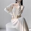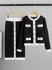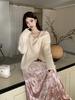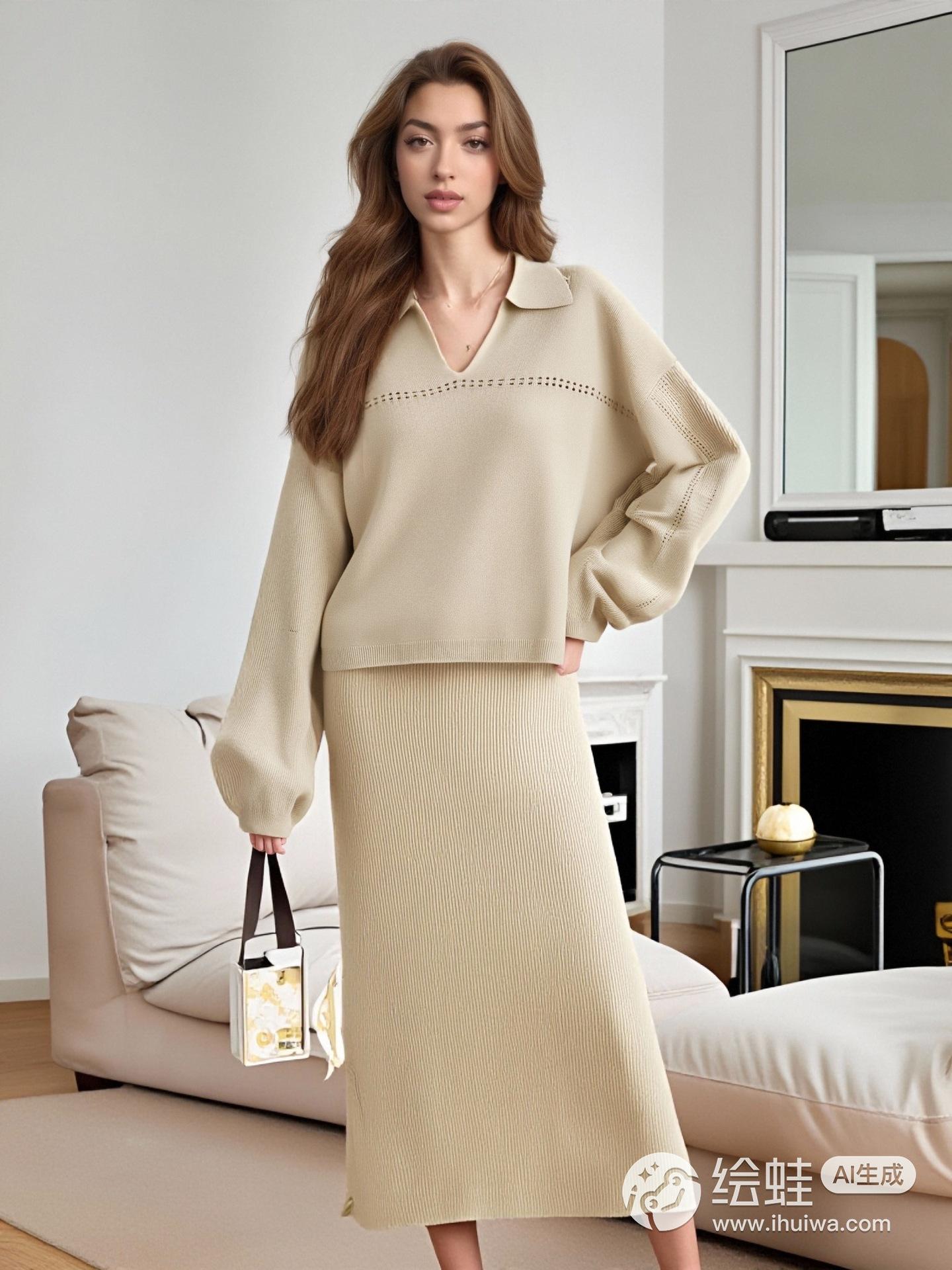 Traje de mujer de comercio exterior transfronterizo 2025 nuevo top suelto de solapa y manga larga falda midi de cintura elástica traje de punto