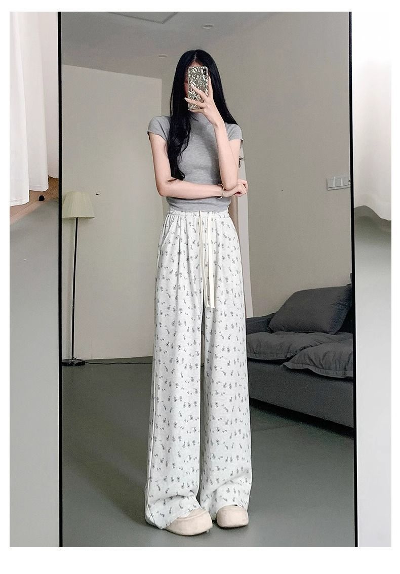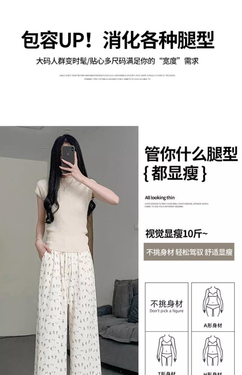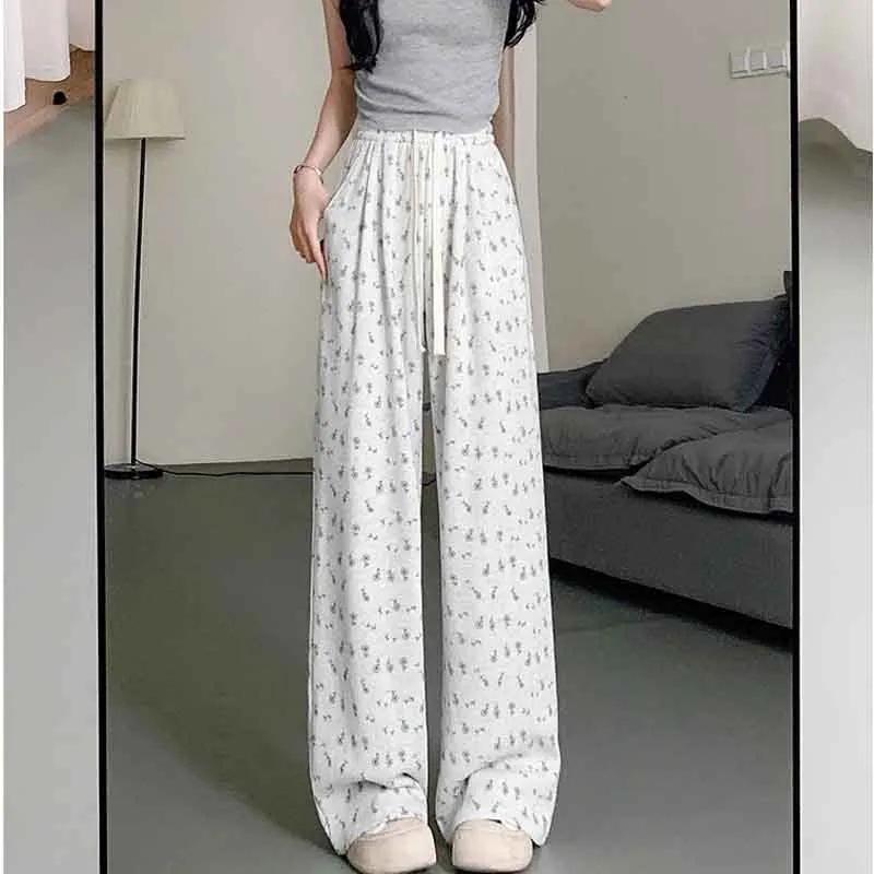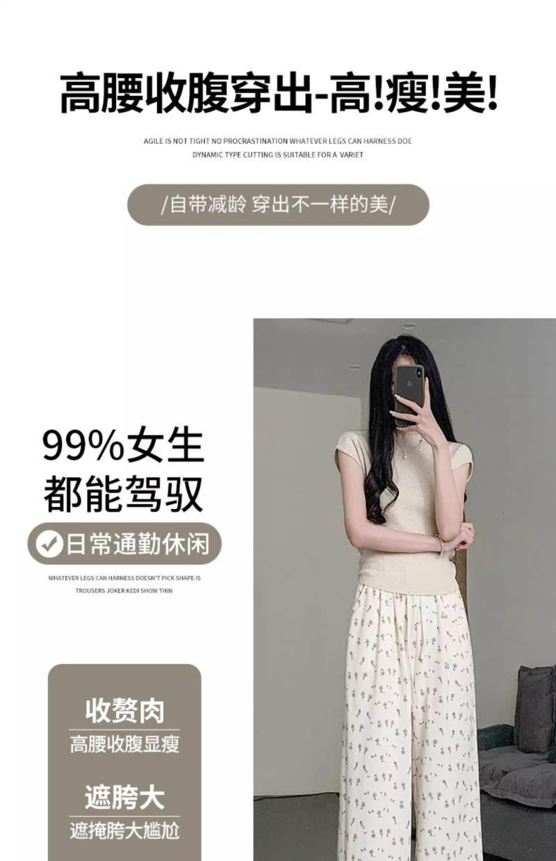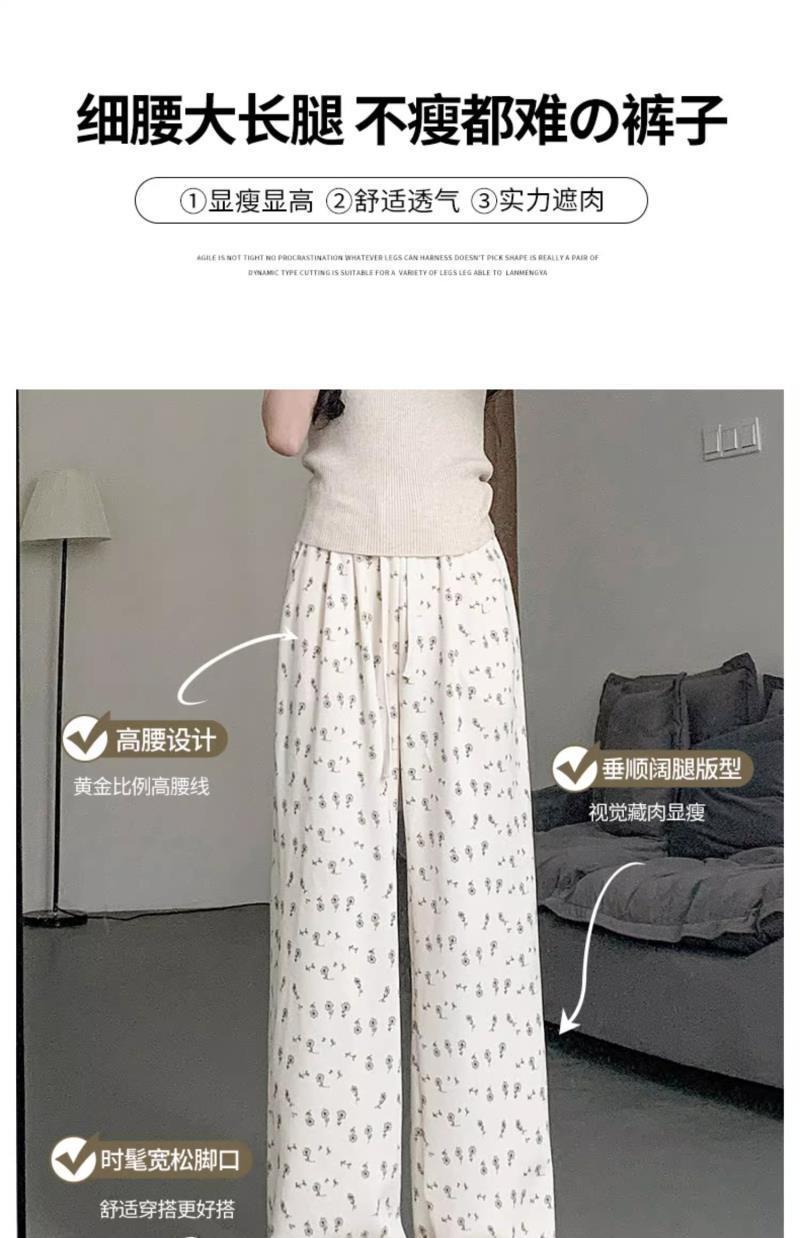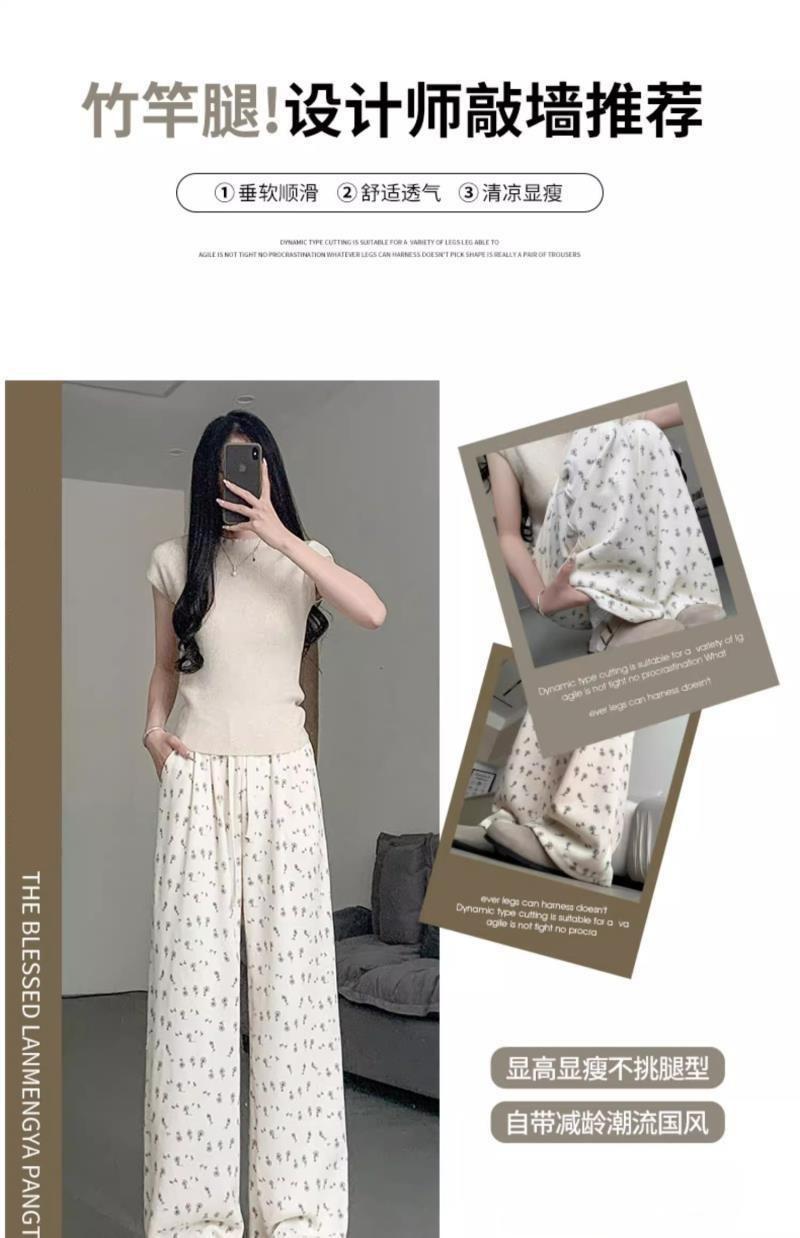 Pantalones anchos de seda de hielo con estampado floral para mujer, novedad de verano 2024, cintura alta, adelgazantes, sueltos, pequeños, delgados, casuales, rectos.