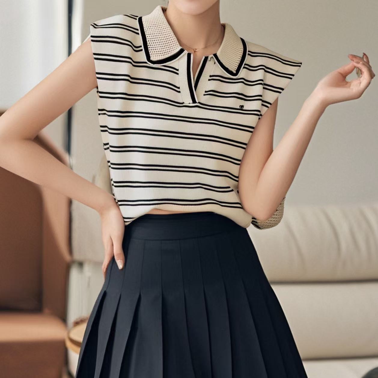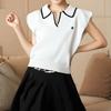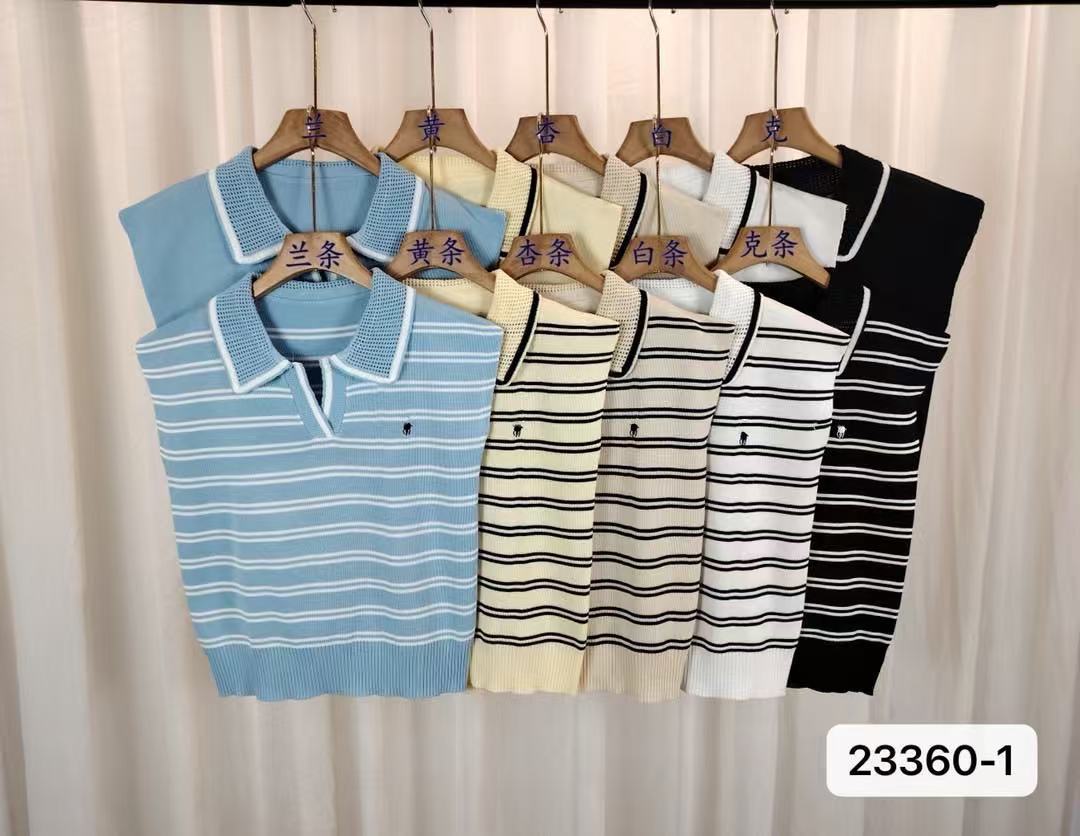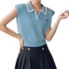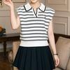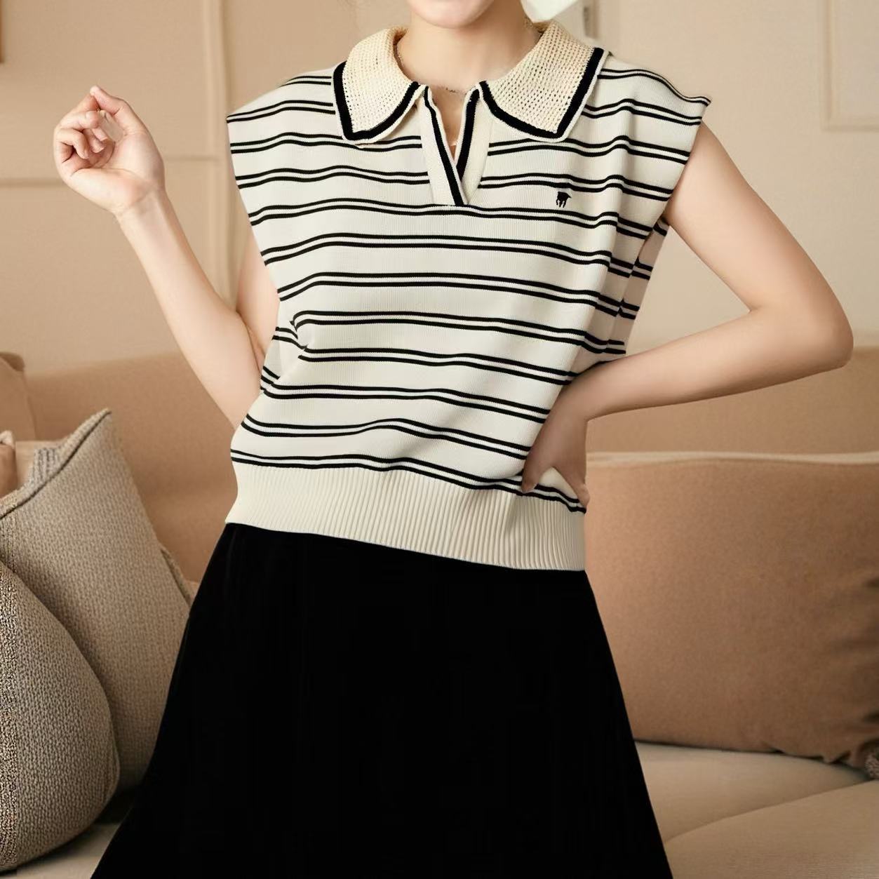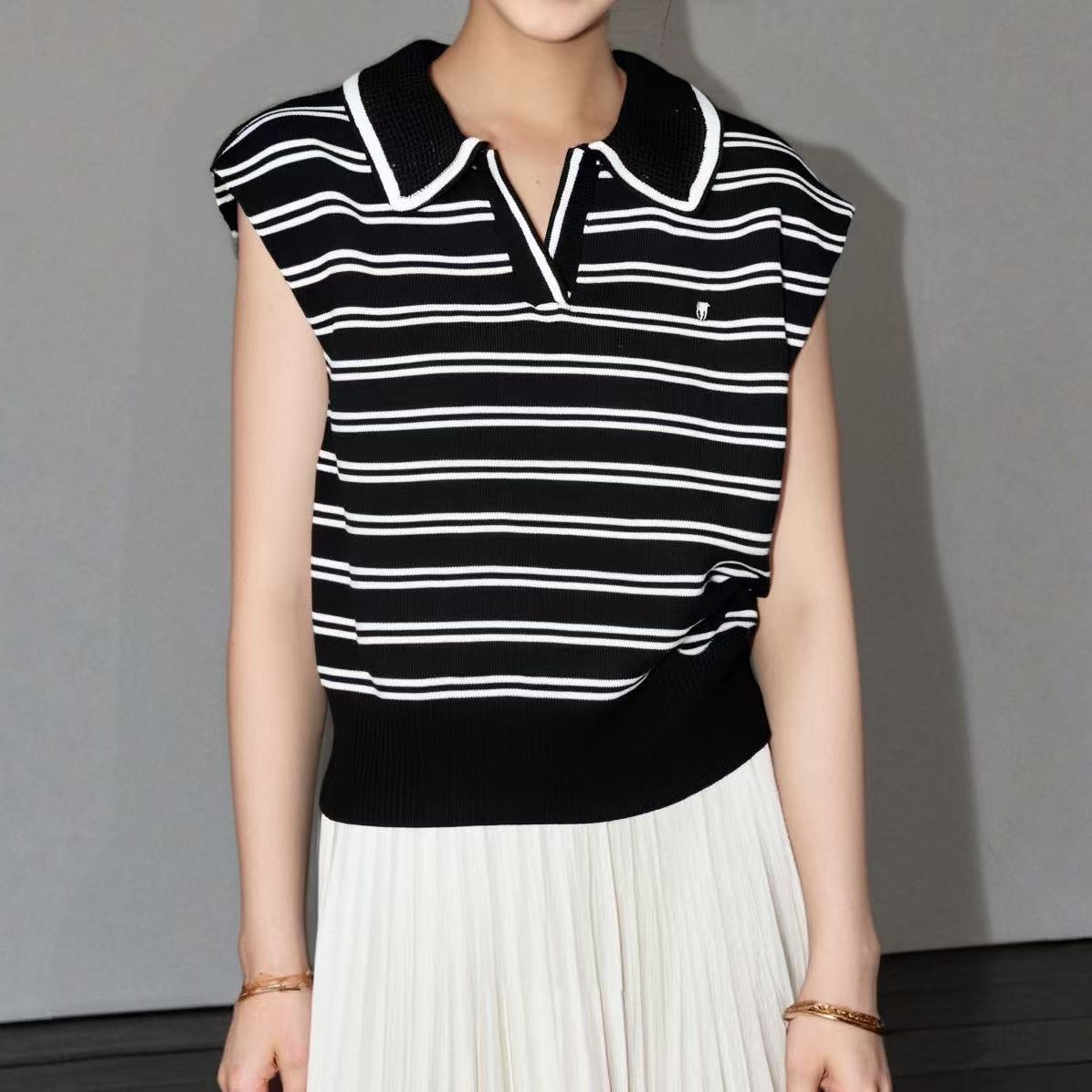 2026 Estilo Coreano Rayas Bordado Manga Corta Tejido Verano Nuevo Temperamento Adelgazante Cuello Polo Camiseta Top ins