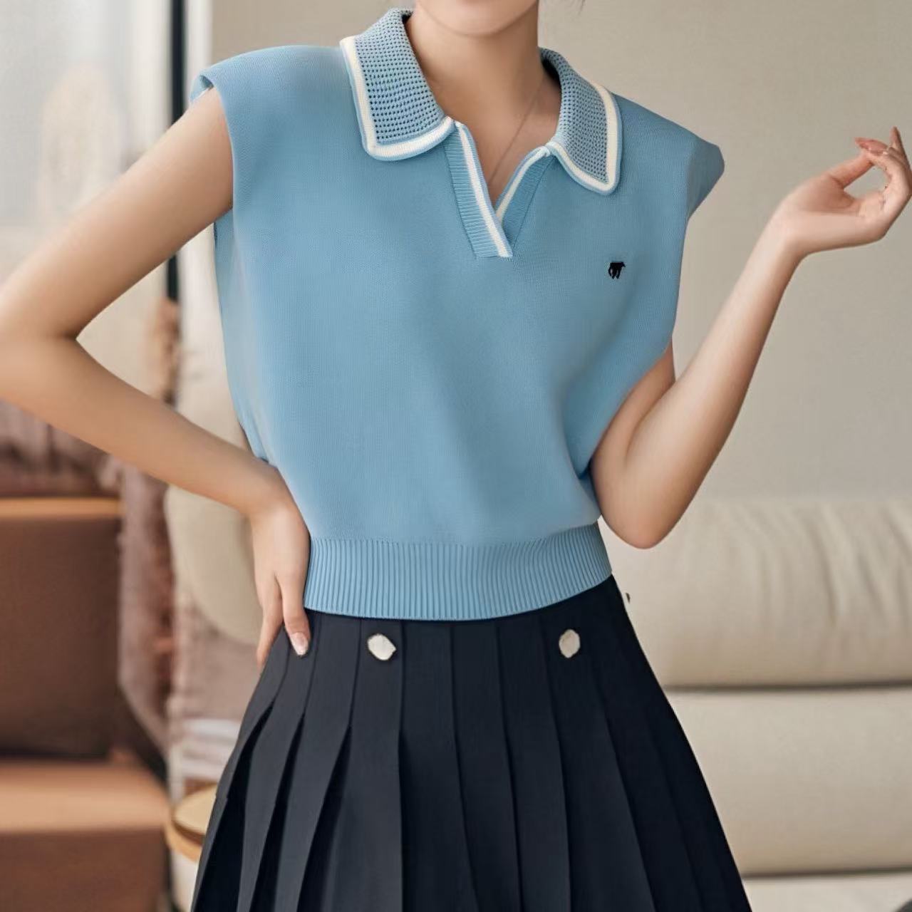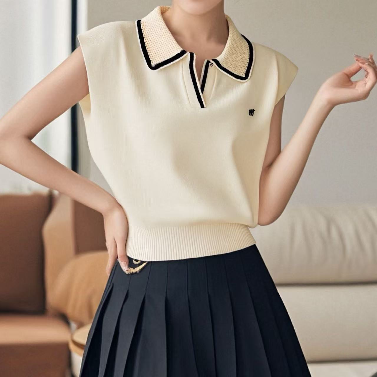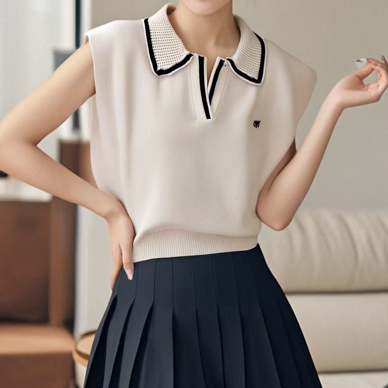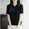2026 Estilo Coreano Rayas Bordado Manga Corta Tejido Verano Nuevo Temperamento Adelgazante Cuello Polo Camiseta Top ins