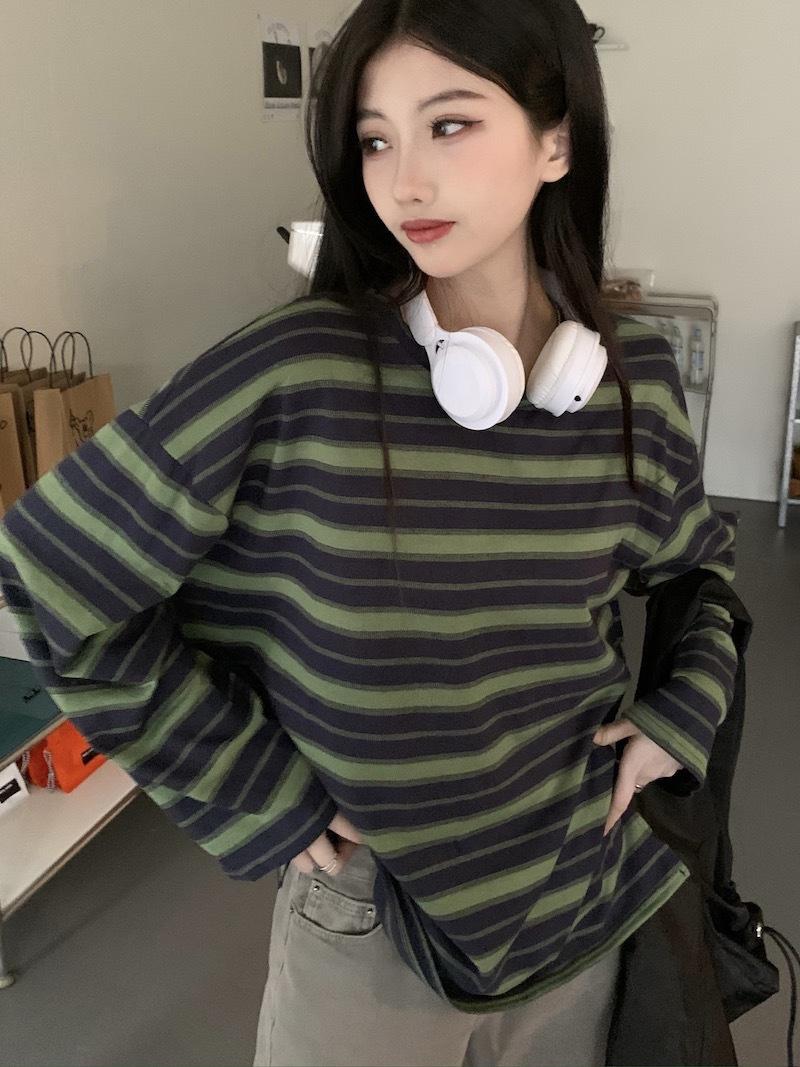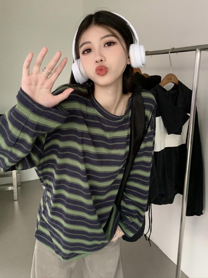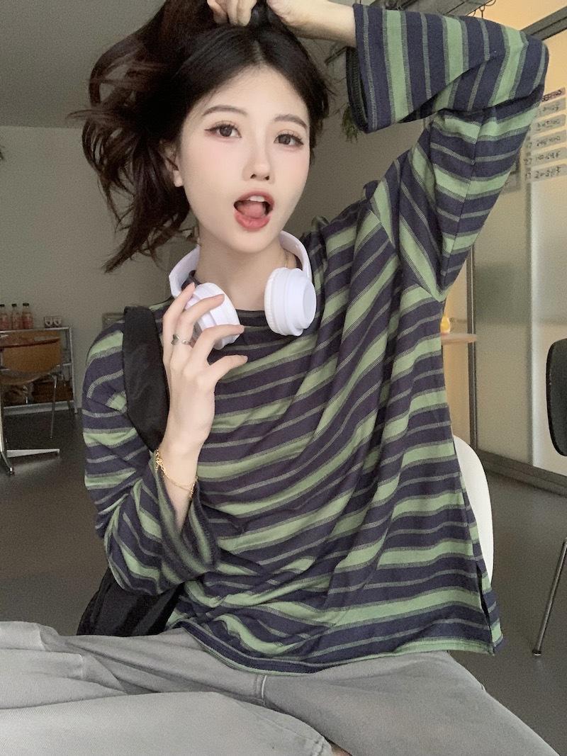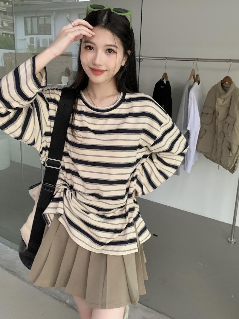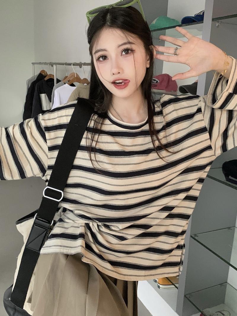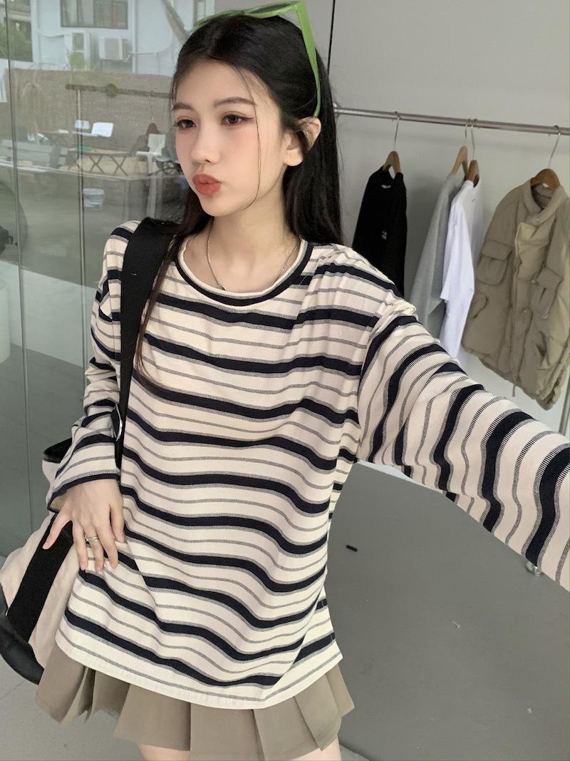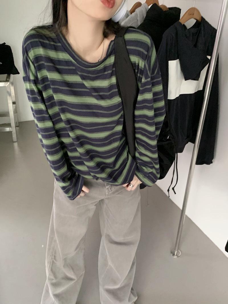 Playera de manga larga a rayas con cuello redondo para mujer, Primavera y Otoño 2025, Nuevo sentido del diseño, Holgada, Adelgazante, Casual, Estudiante, Top dividido
