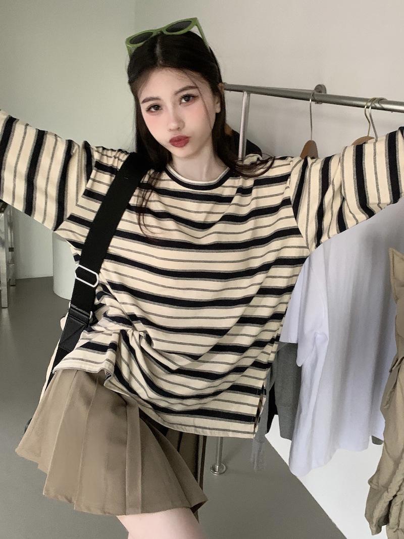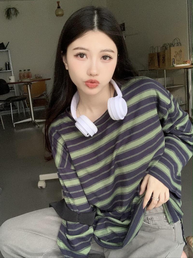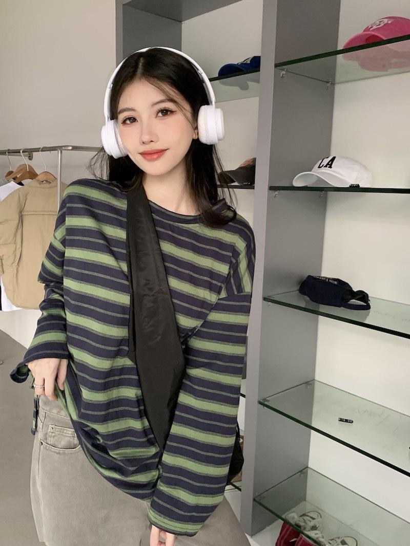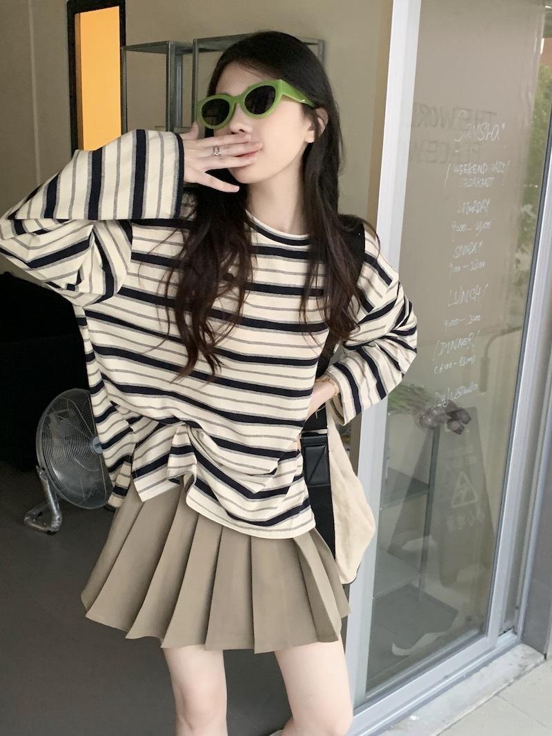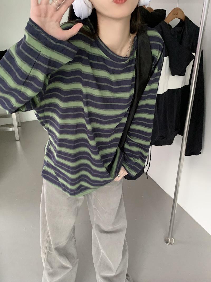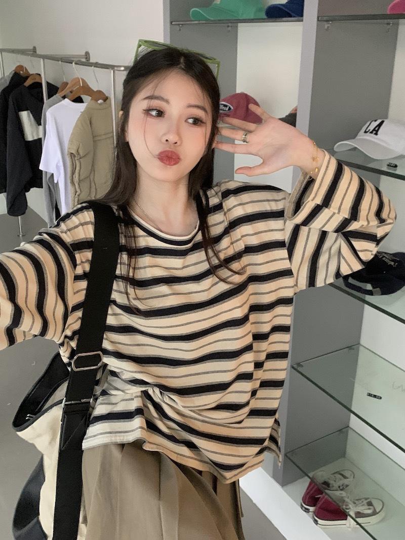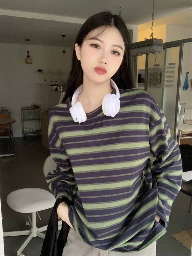 Playera de manga larga a rayas con cuello redondo para mujer, Primavera y Otoño 2025, Nuevo sentido del diseño, Holgada, Adelgazante, Casual, Estudiante, Top dividido