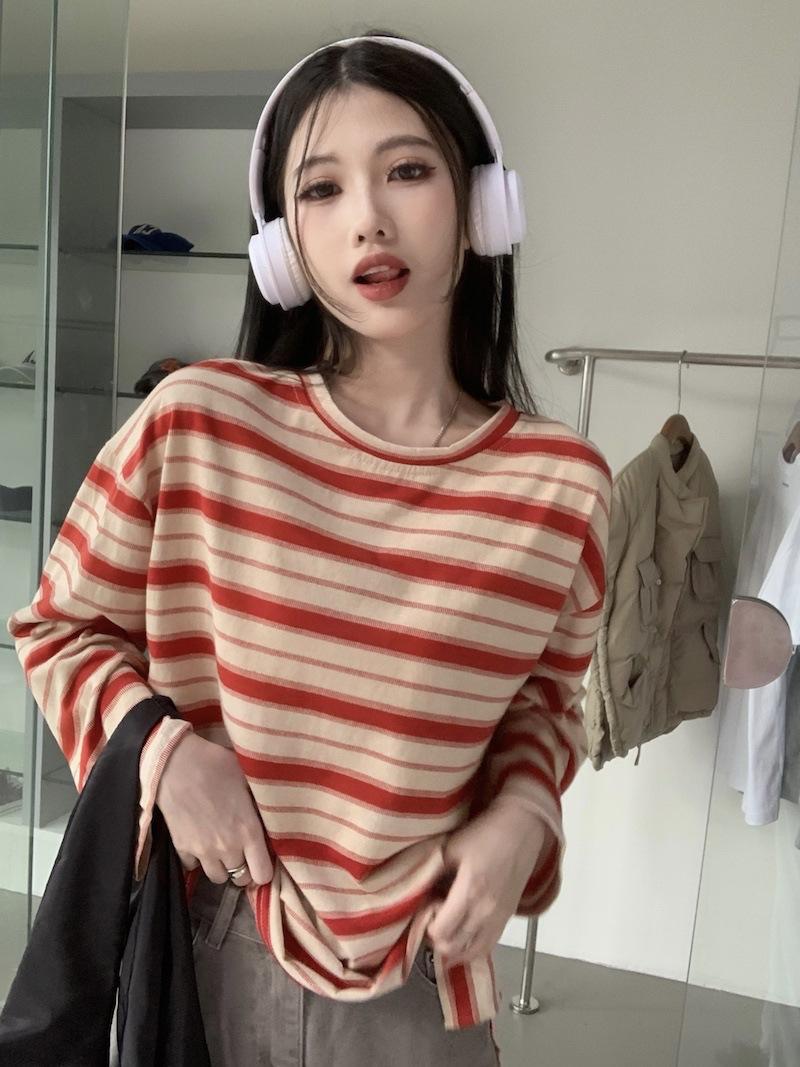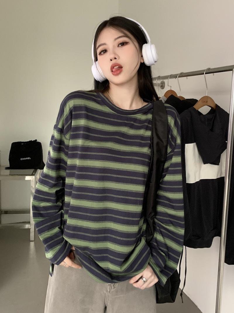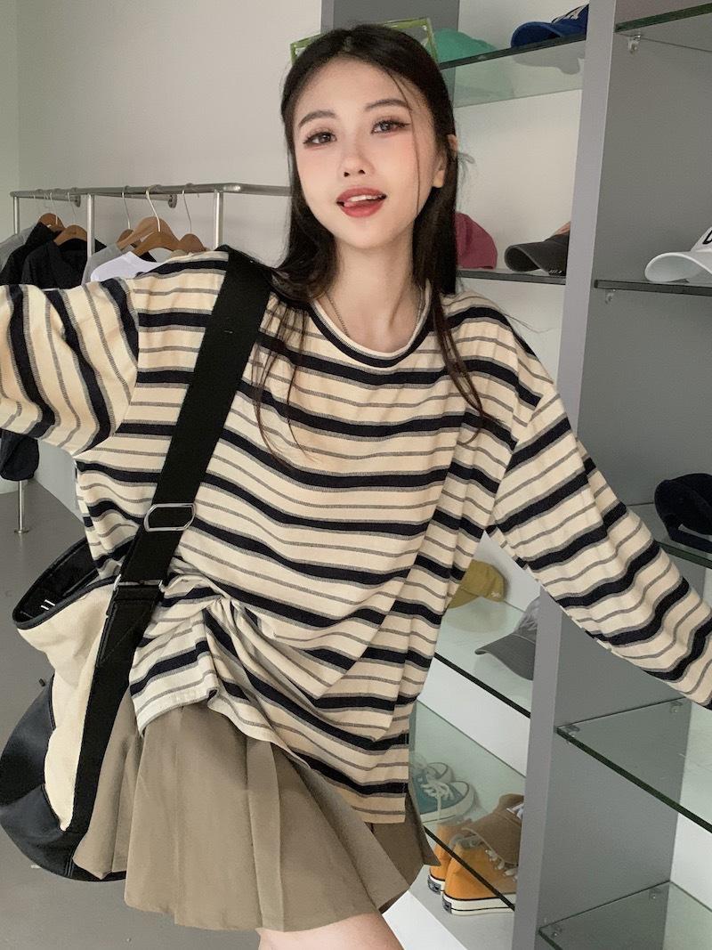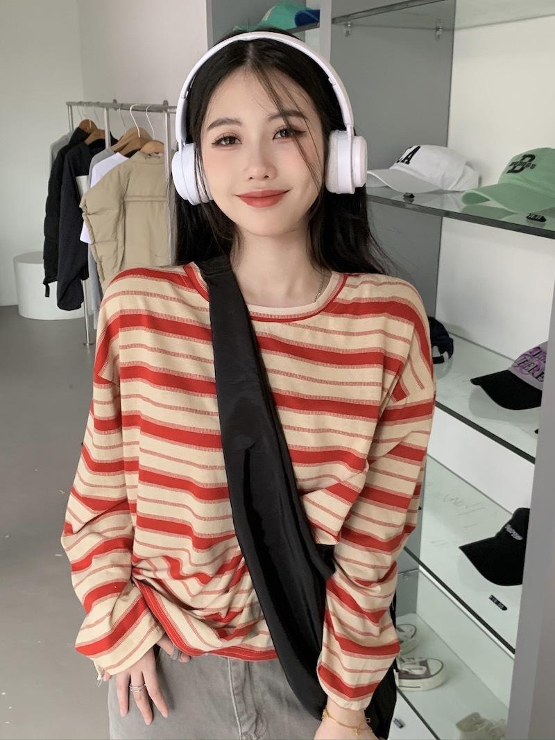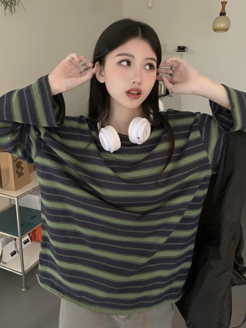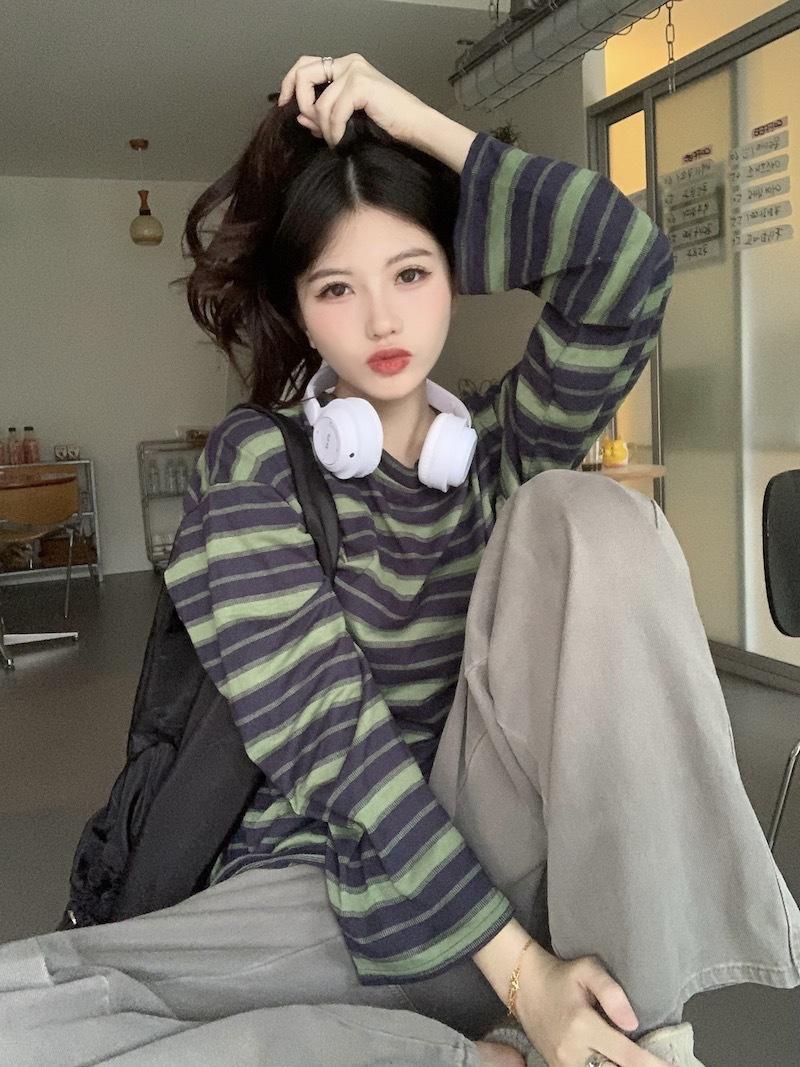 Playera de manga larga a rayas con cuello redondo para mujer, Primavera y Otoño 2025, Nuevo sentido del diseño, Holgada, Adelgazante, Casual, Estudiante, Top dividido