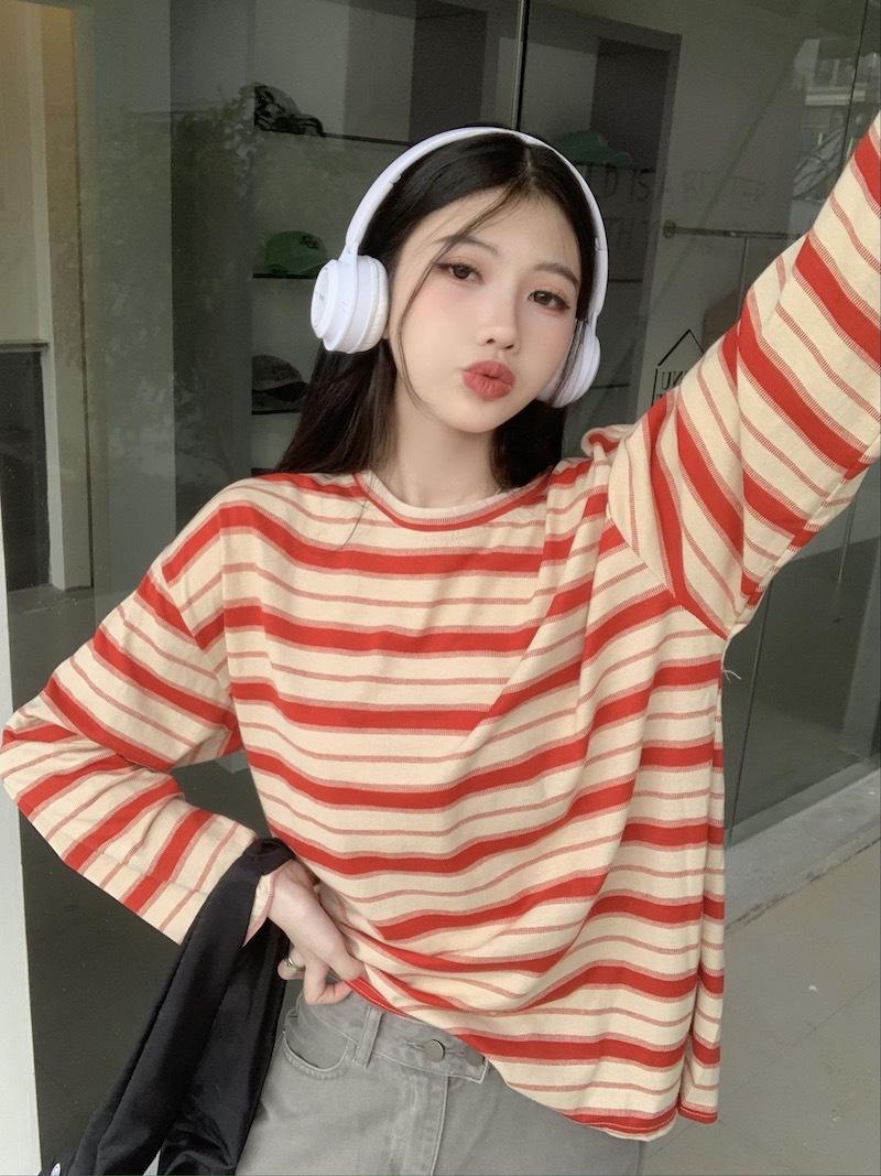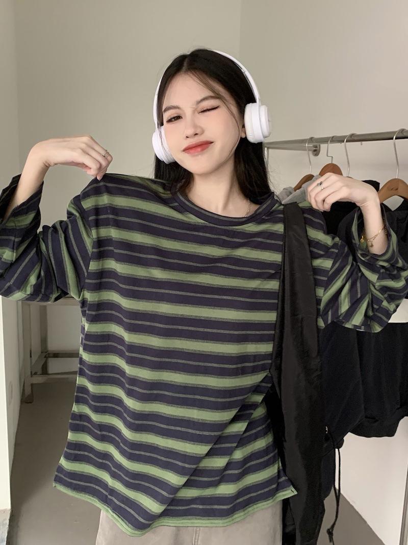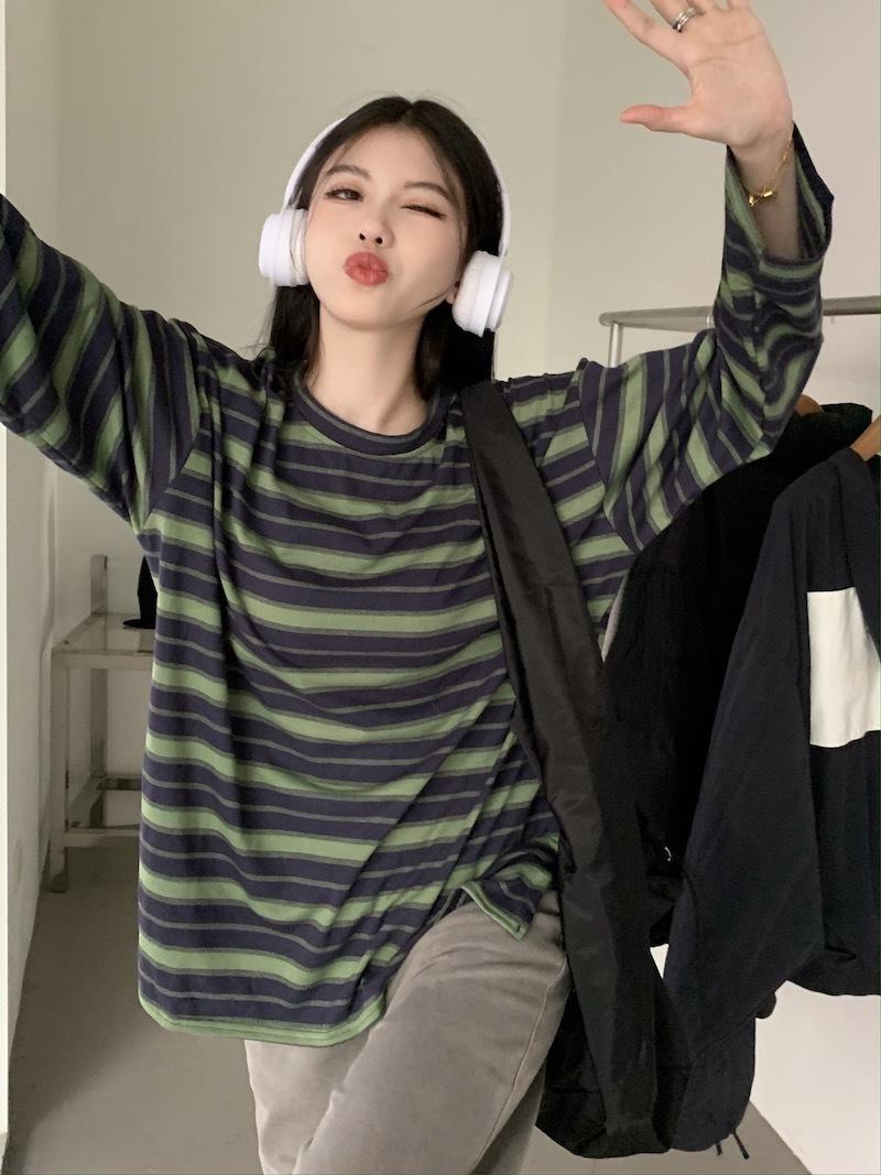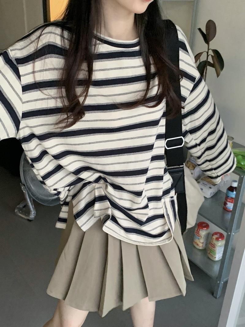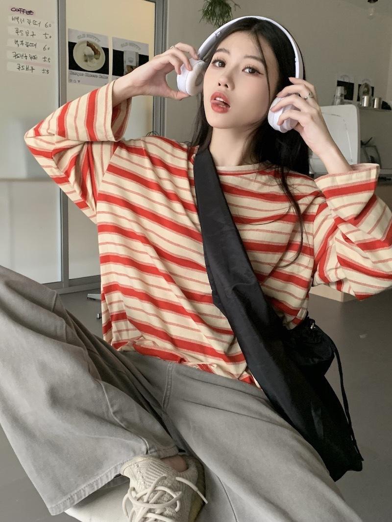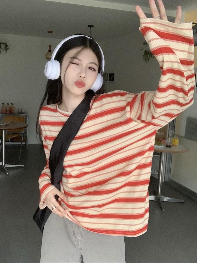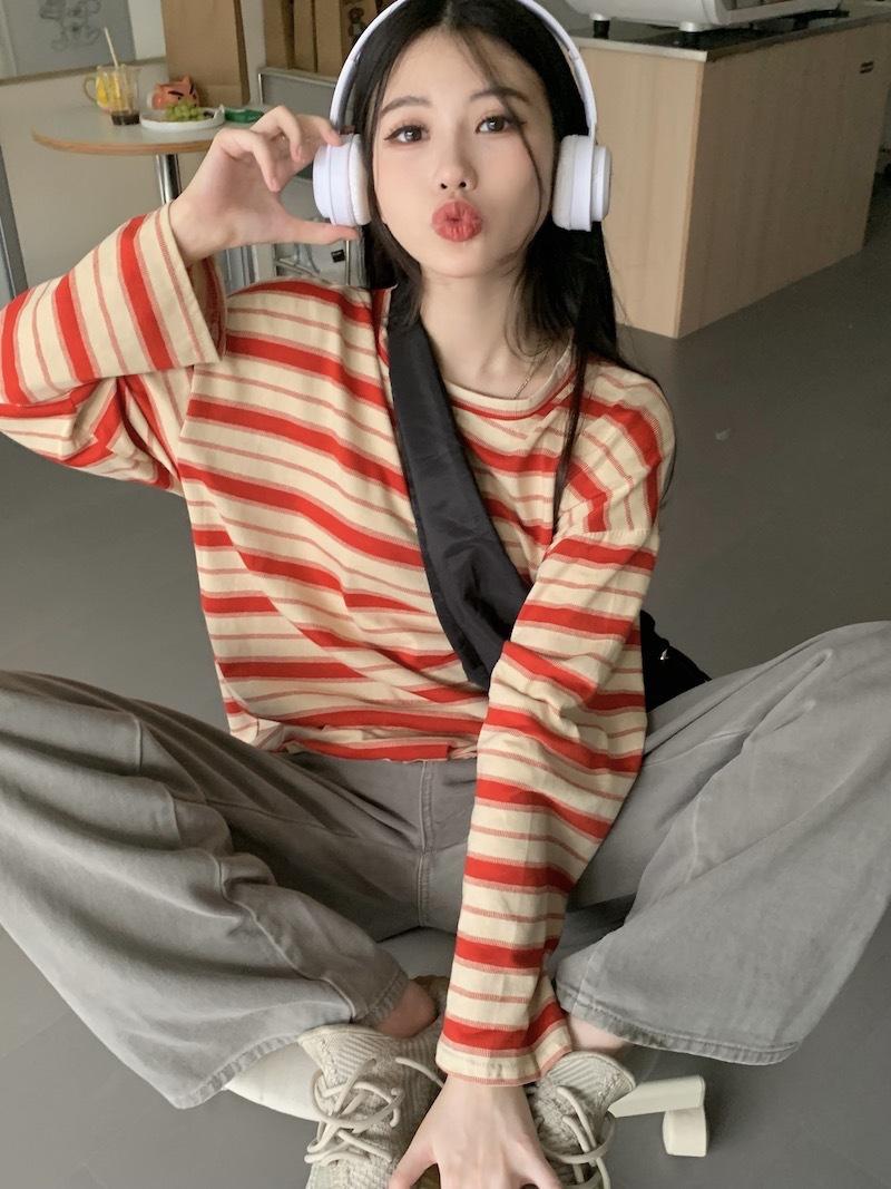 Playera de manga larga a rayas con cuello redondo para mujer, Primavera y Otoño 2025, Nuevo sentido del diseño, Holgada, Adelgazante, Casual, Estudiante, Top dividido