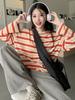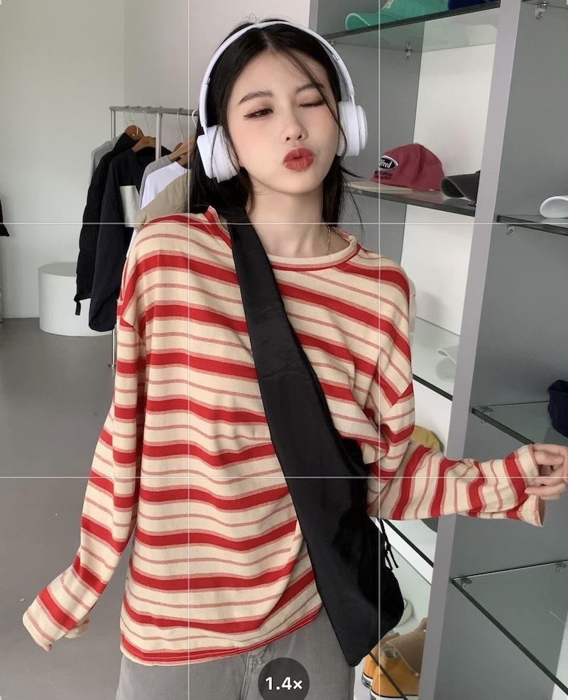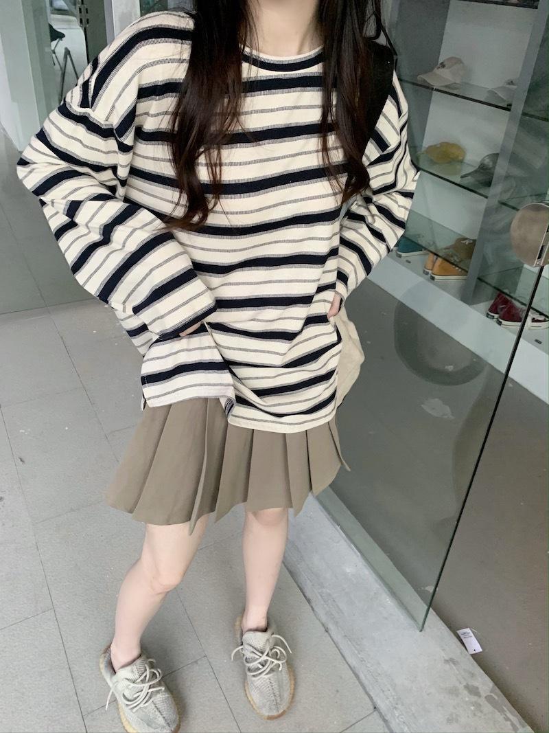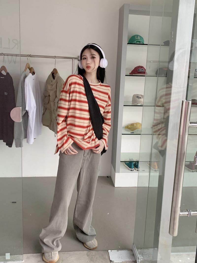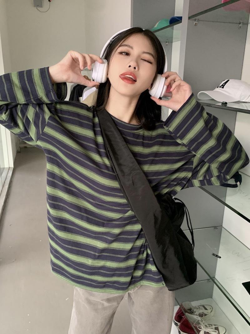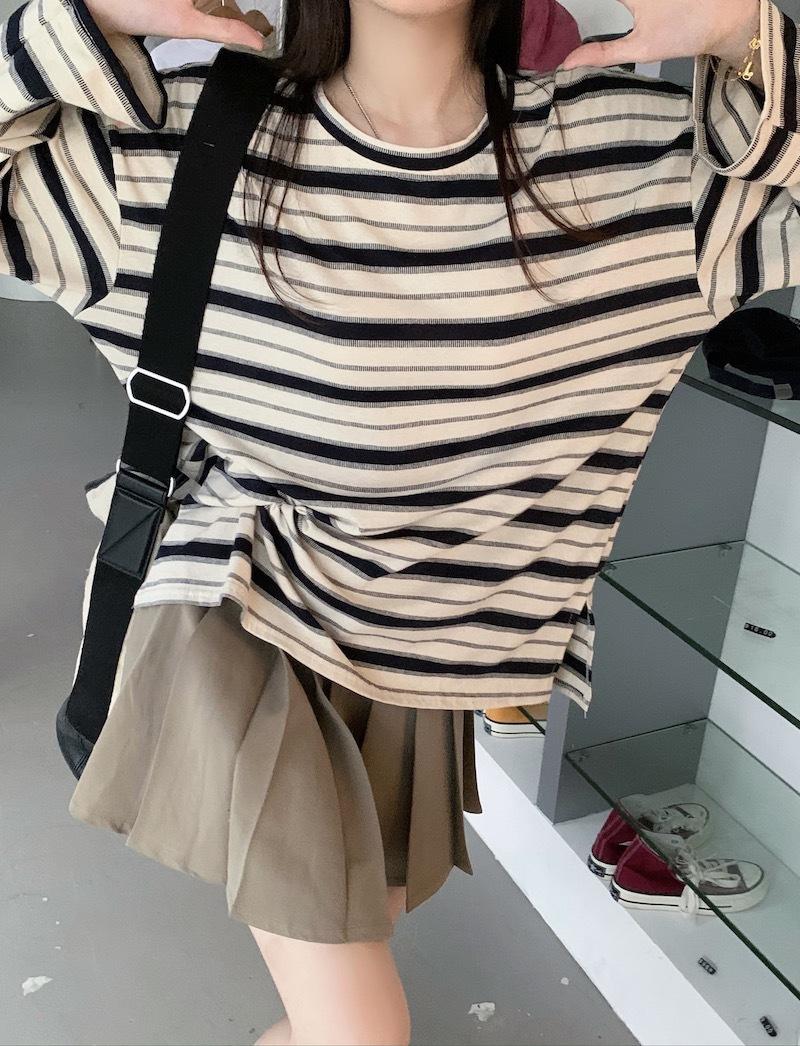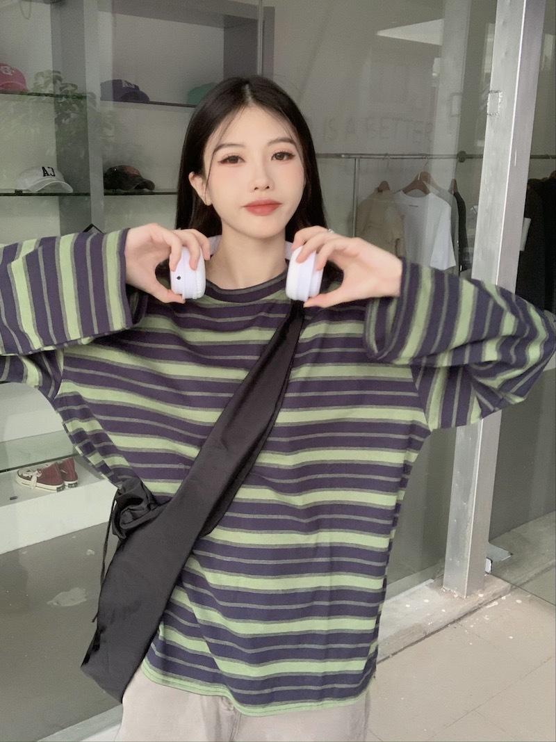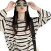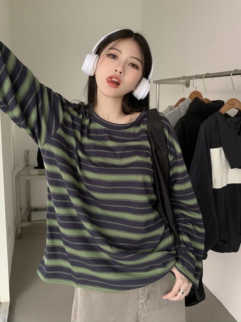 Playera de manga larga a rayas con cuello redondo para mujer, Primavera y Otoño 2025, Nuevo sentido del diseño, Holgada, Adelgazante, Casual, Estudiante, Top dividido