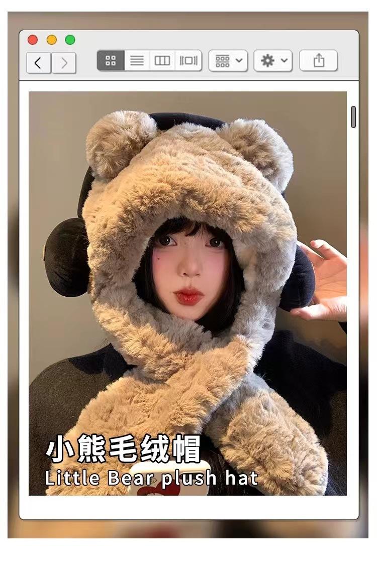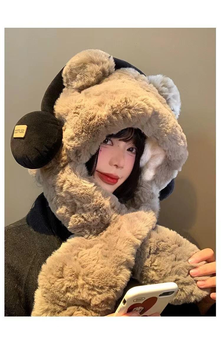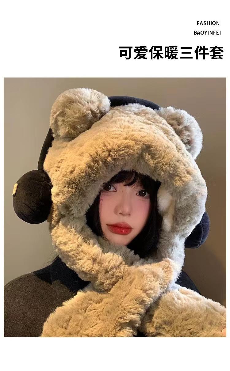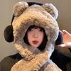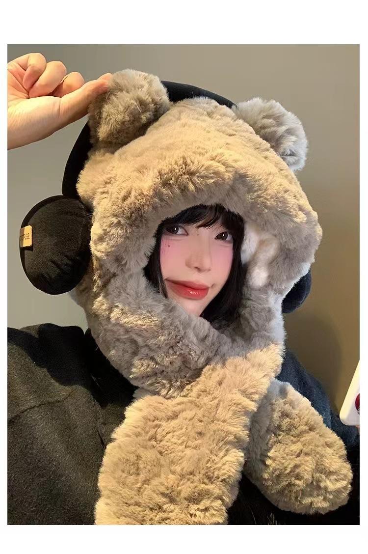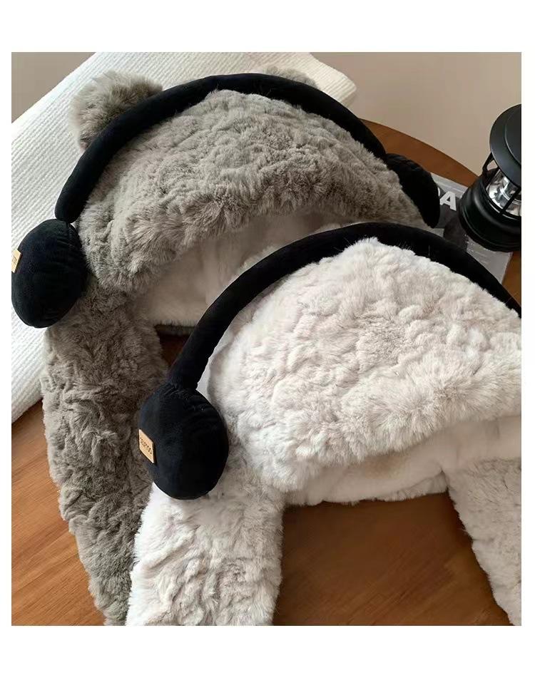 Gorro con auriculares y bufanda de oso, todo en uno, para mujer, otoño e invierno, bonito jersey de felpa grueso y cálido, protección para los oídos, gorro Lei Feng a la moda.