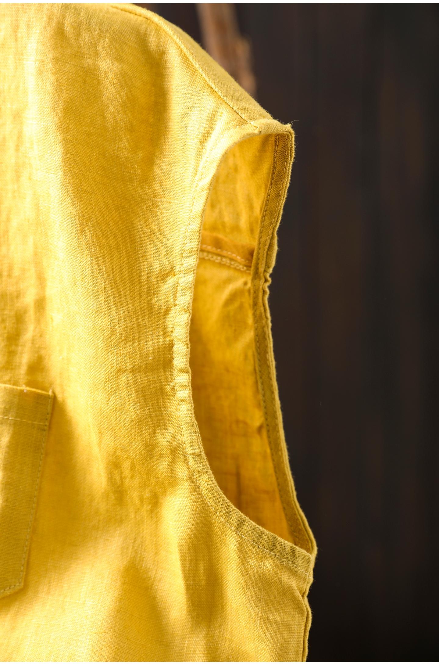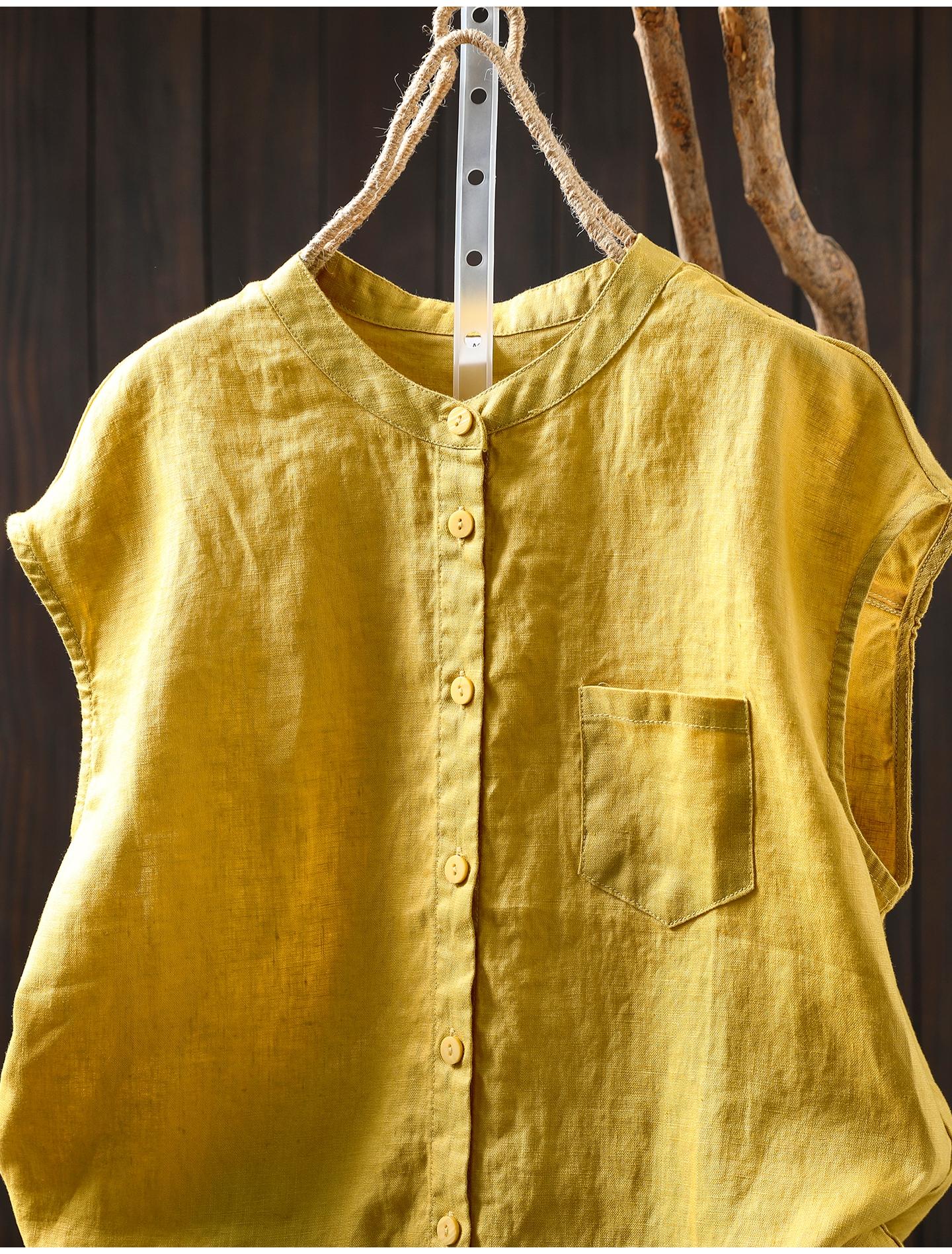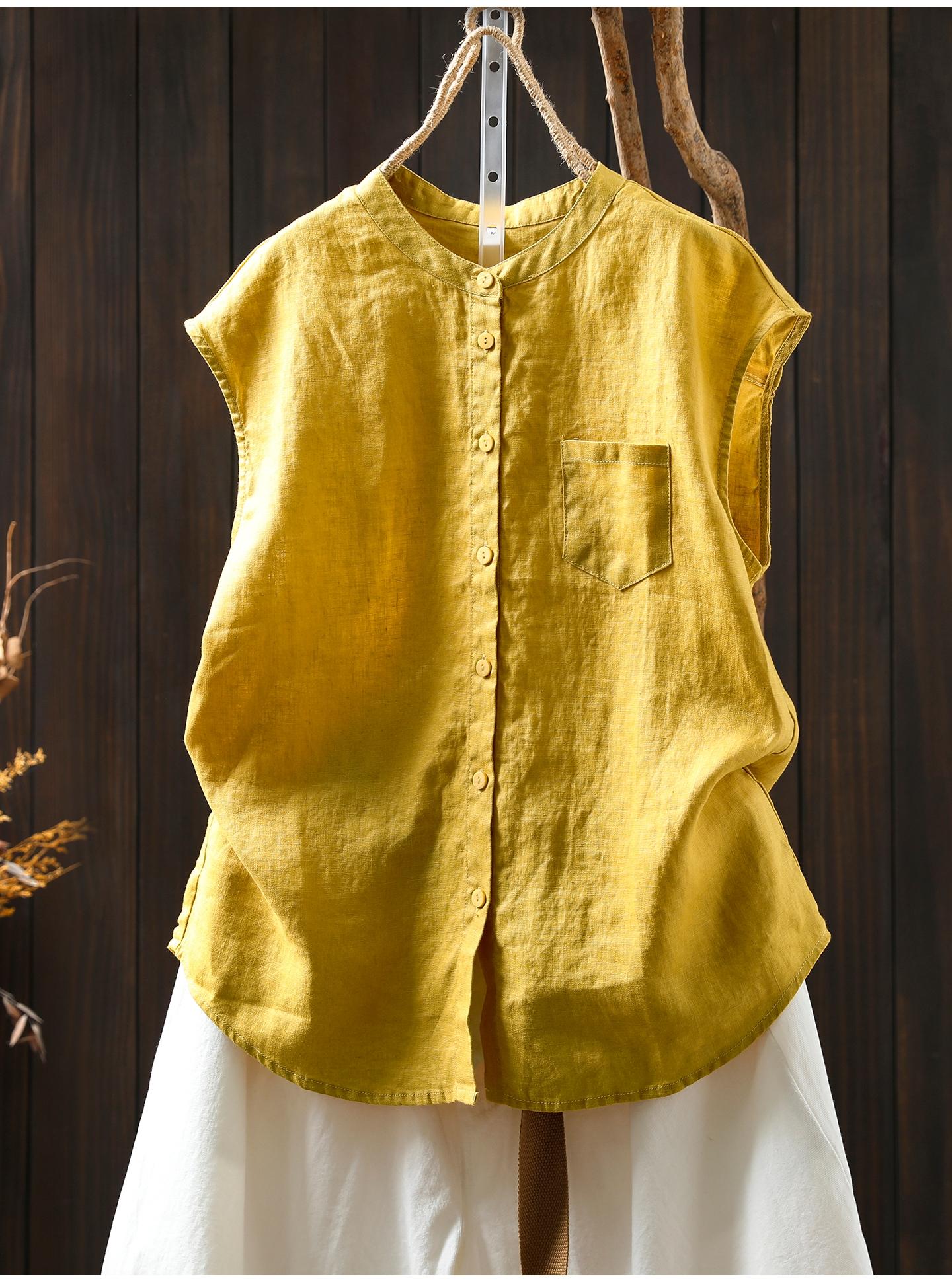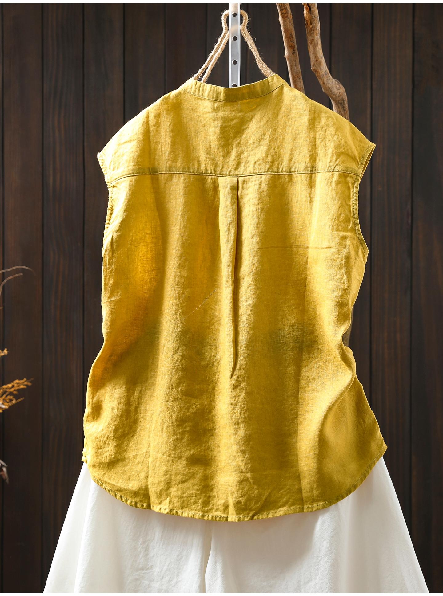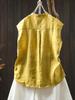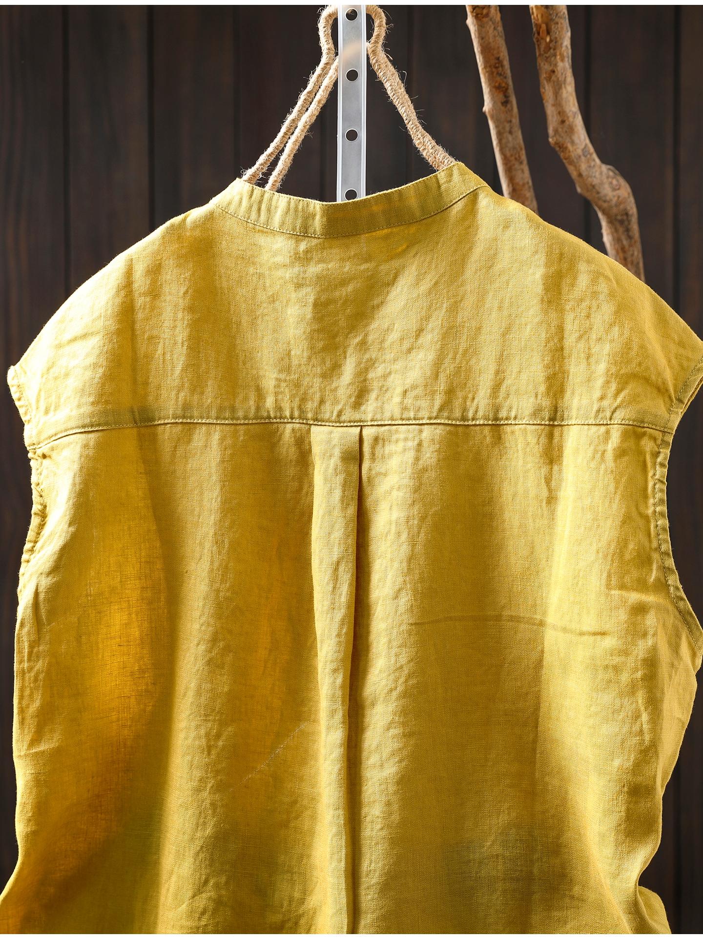 Camisa Amarilla de Lino Puro sin Mangas Mujer 2025 Verano Nueva Color Sólido Cuello Mao Holgada Casual Literaria Versátil Top