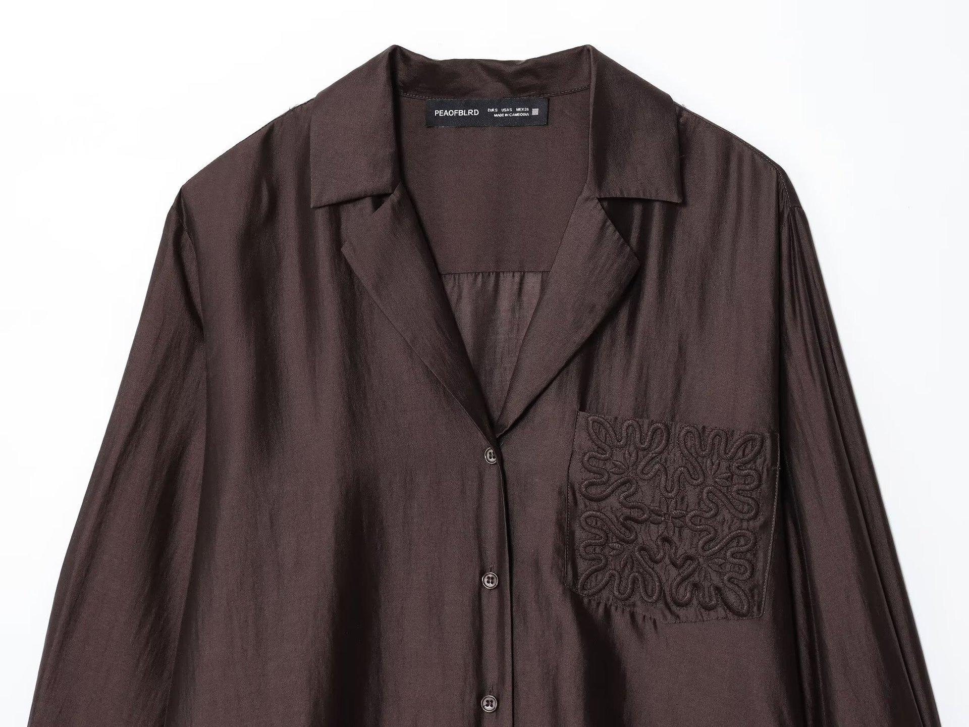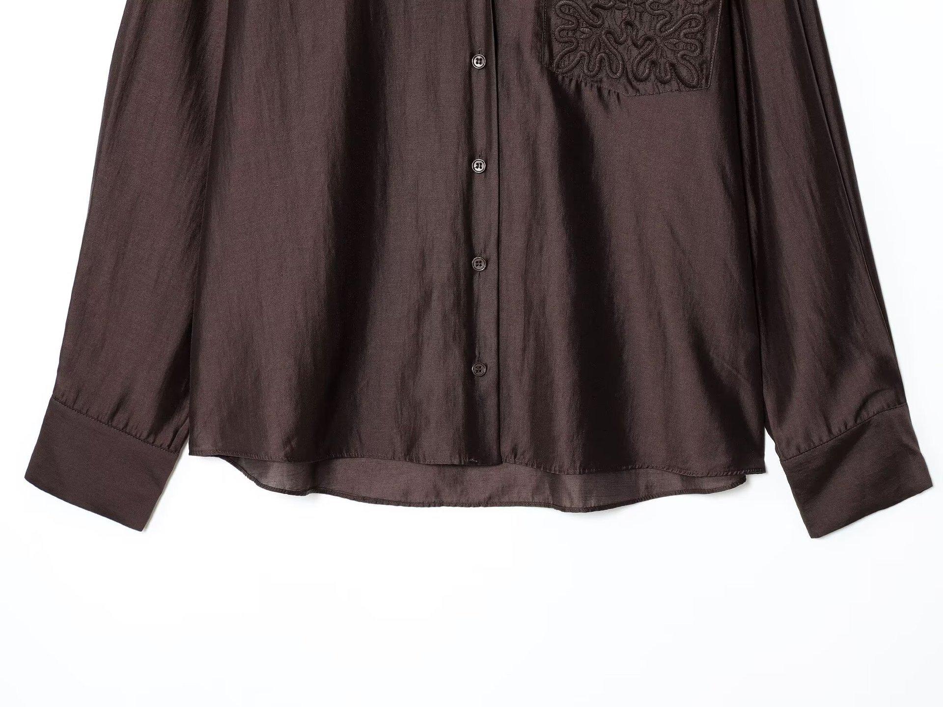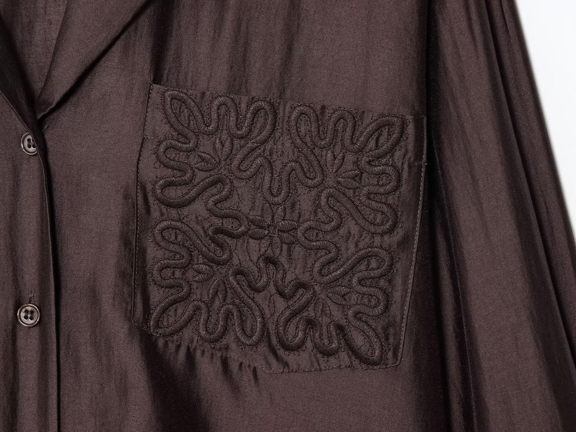 Venta al por mayor transfronteriza Otoño 2025 Nueva Ropa de Mujer Moda Callejera Europea y Americana Bordado Decoración de Bolsillo Camisa de Manga Larga Color Café