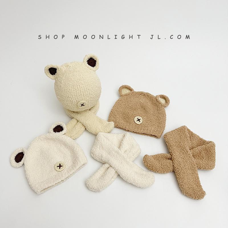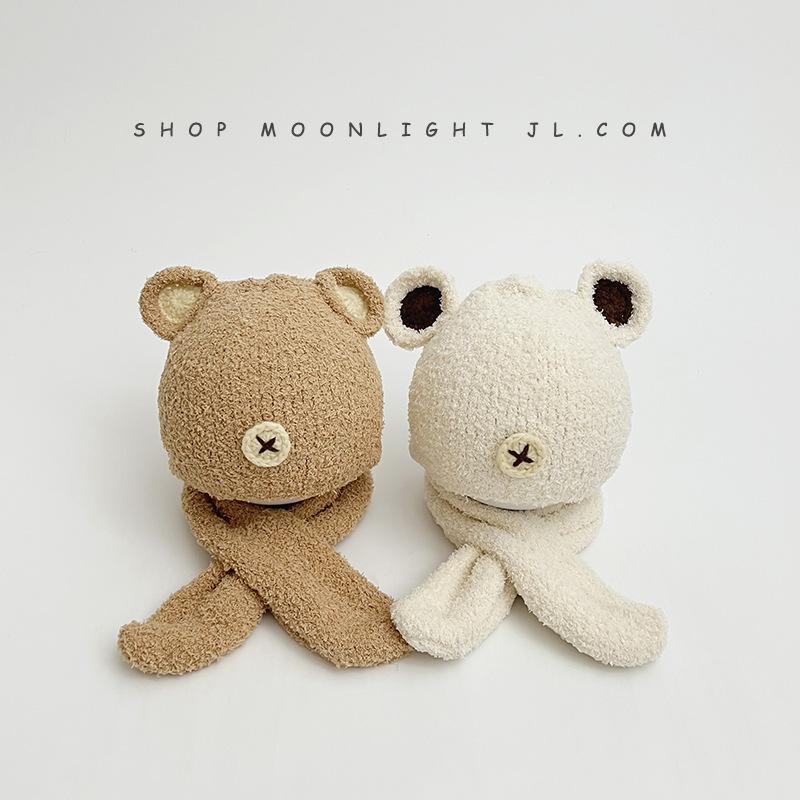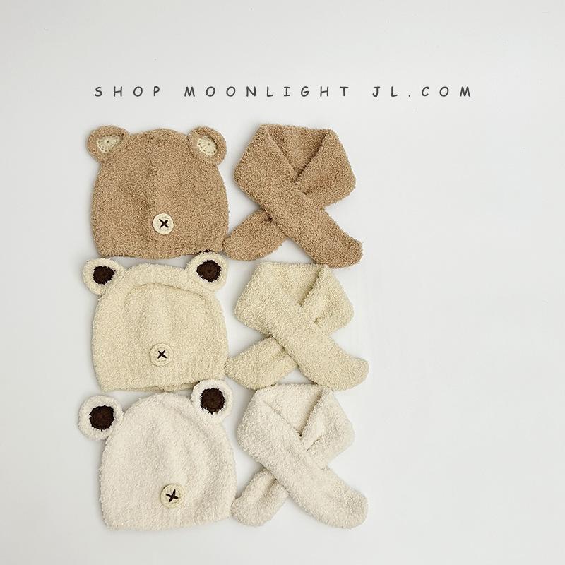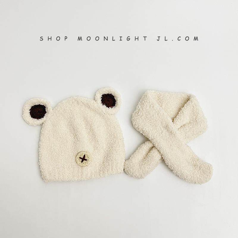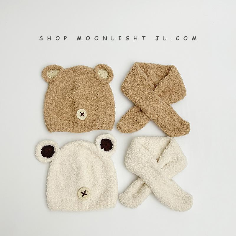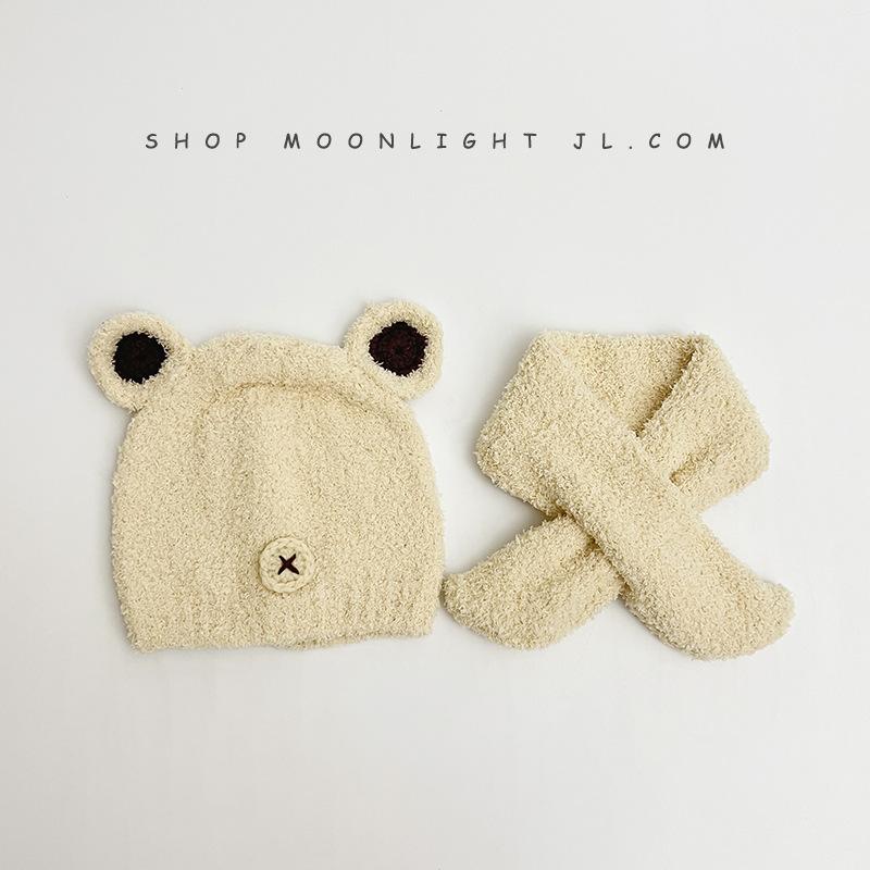 Beige hat + scarf set, soft contrasting color small ears bear + 44-48cm (recommended for 0-3 years old) + one size fits all