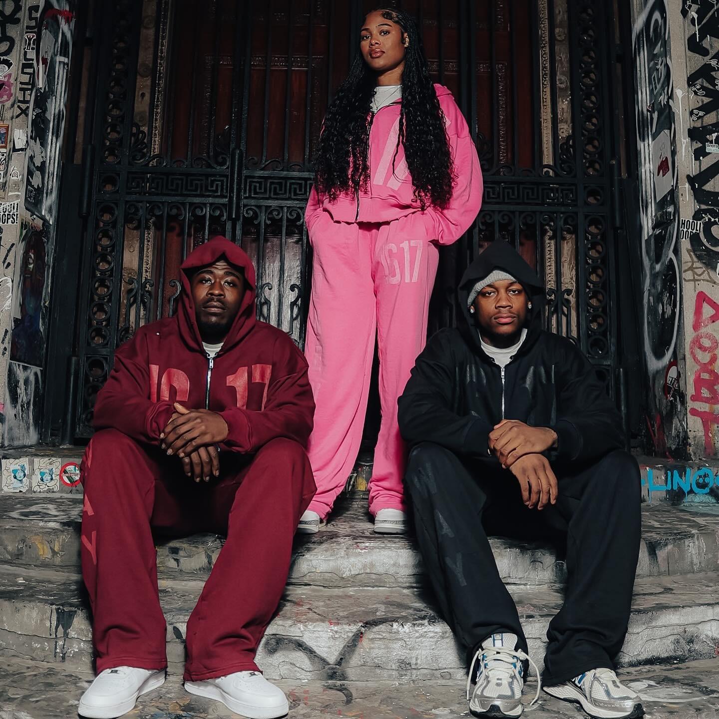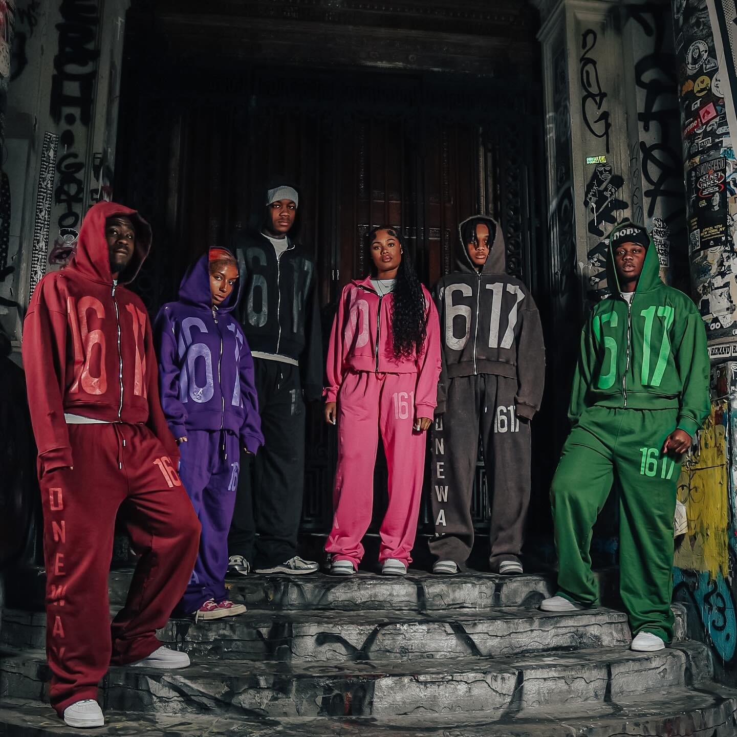 green sweatshirt, Grey sweatshirt, Red sweatshirt, Purple sweatshirt, Green trousers, Grey trousers, Red trous...