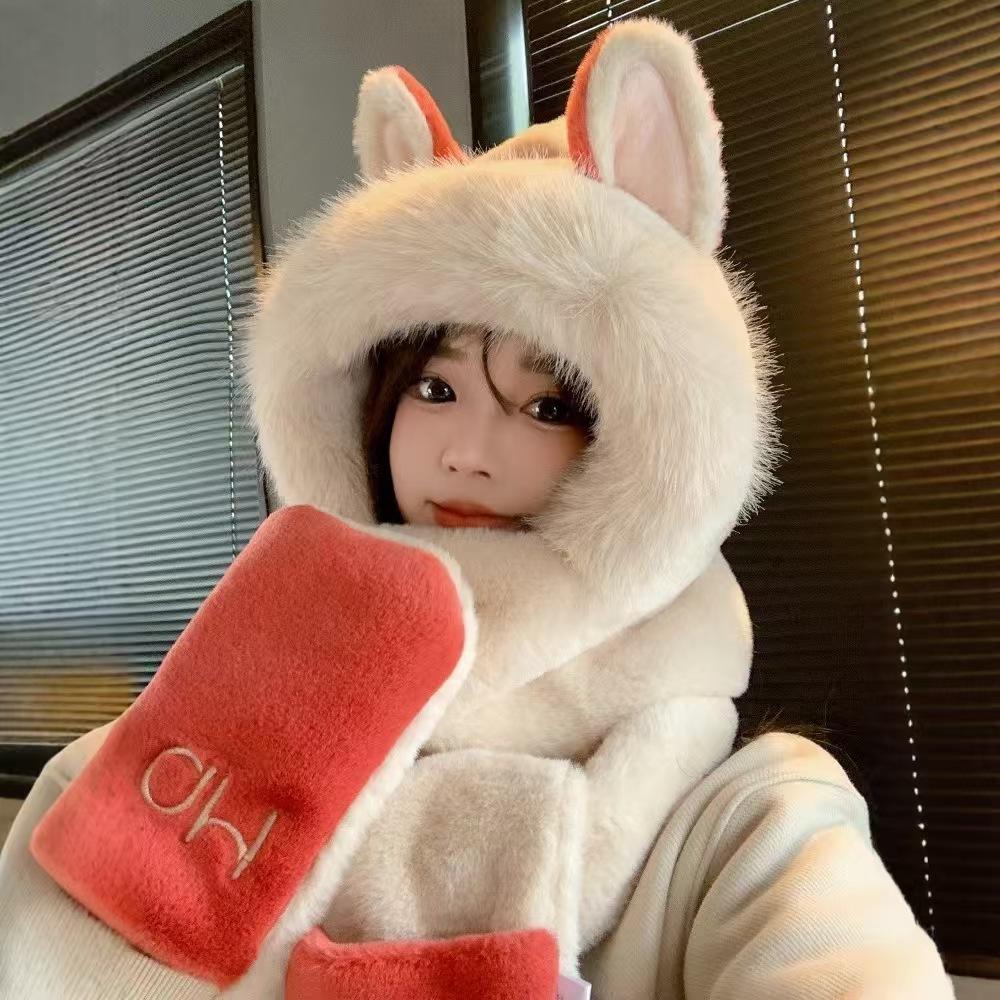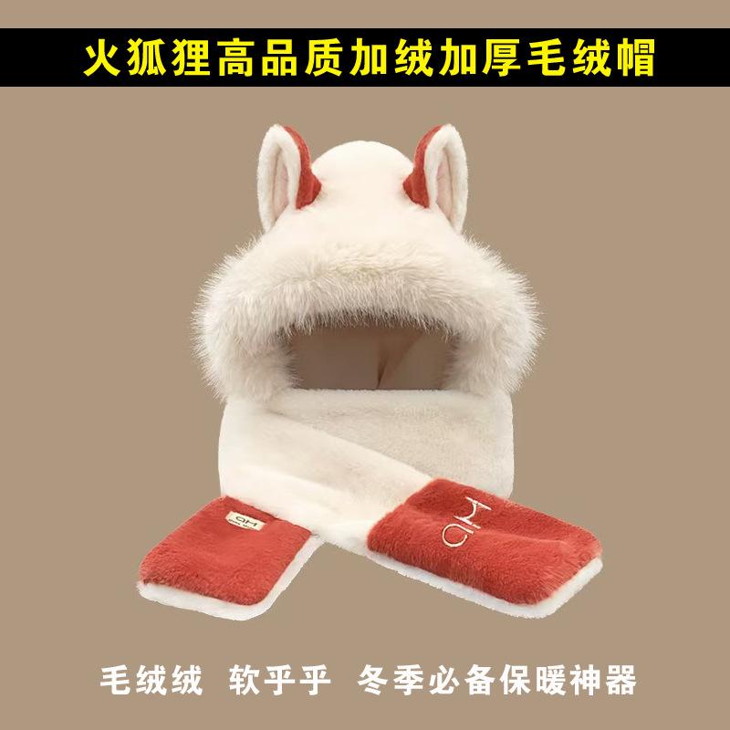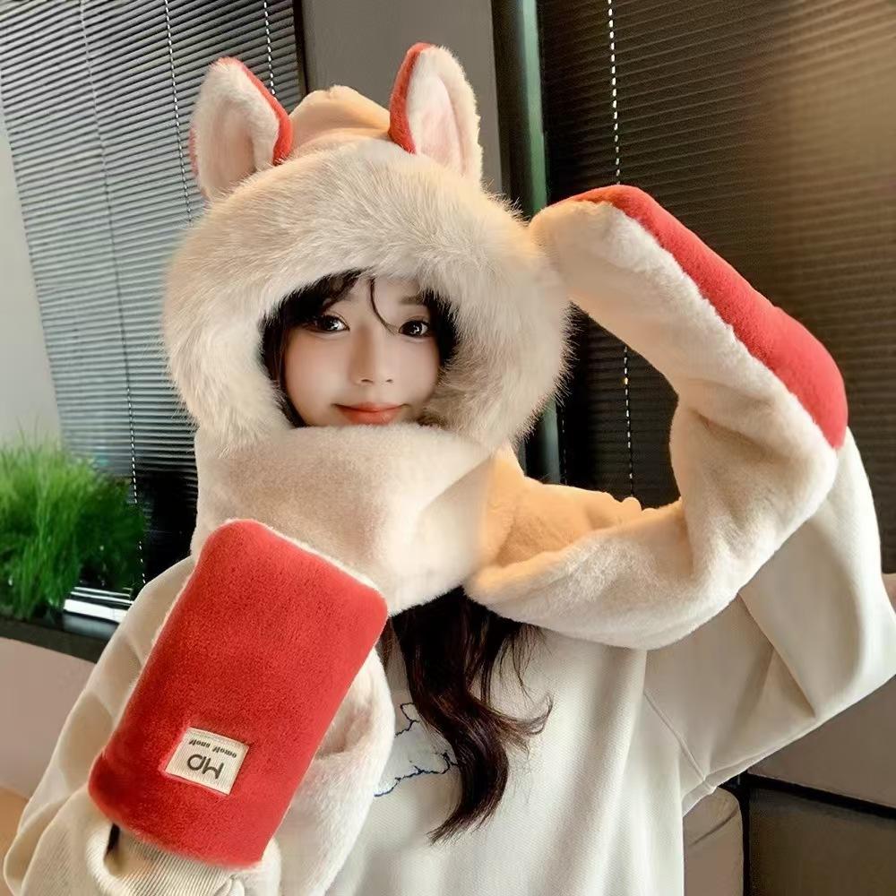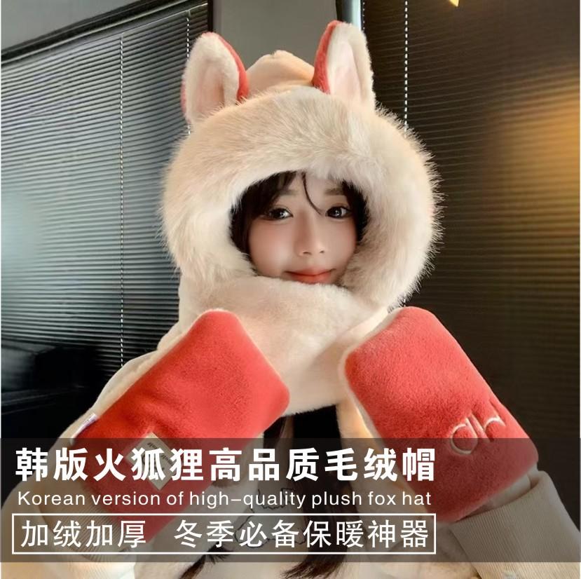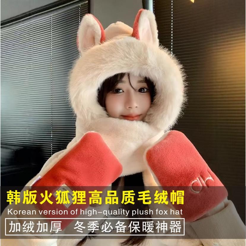 Explosiones día de invierno zorro de fuego sombrero bufanda guantes de una pieza de tres piezas forrado de vellón engrosado combinable cálido protección para las orejas