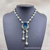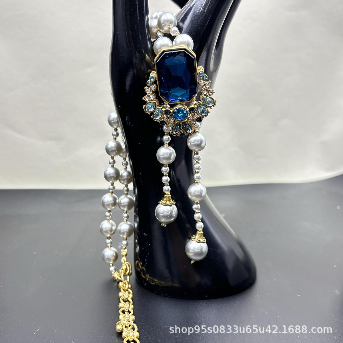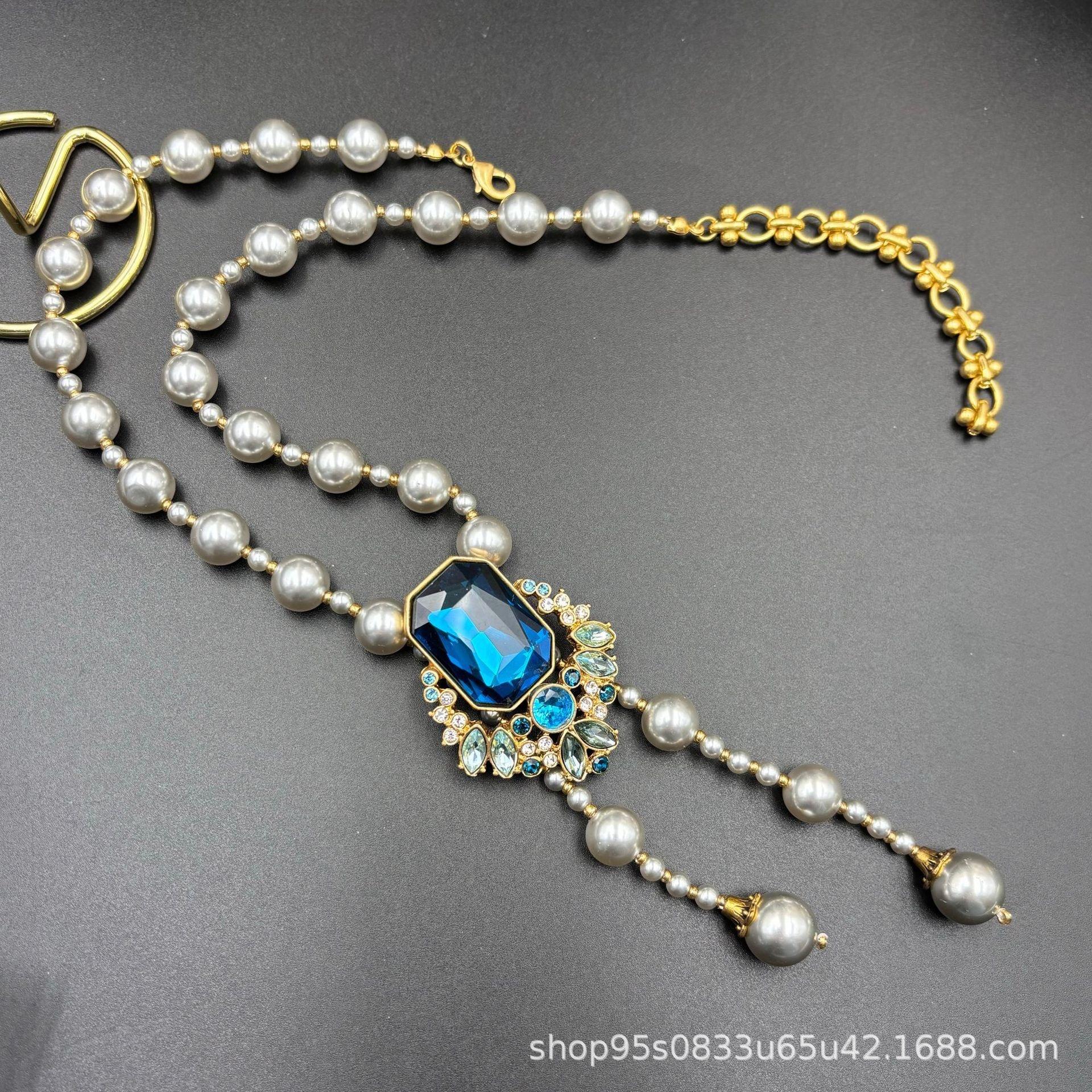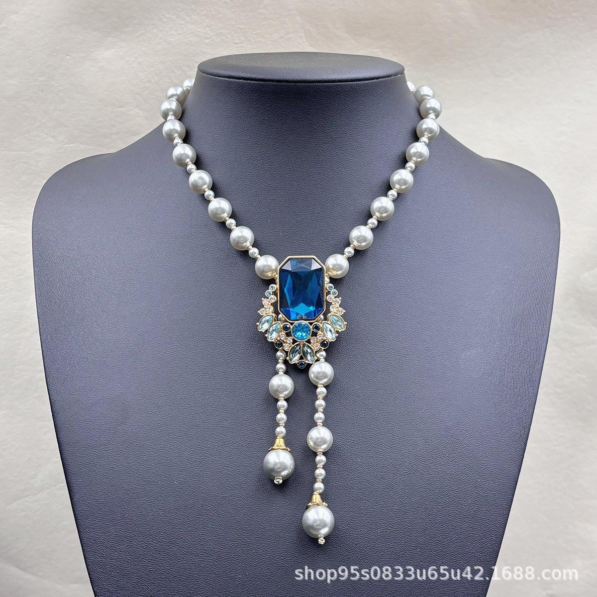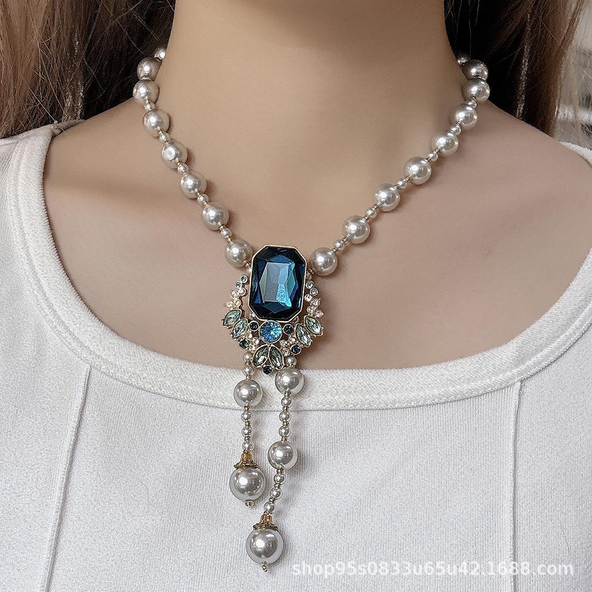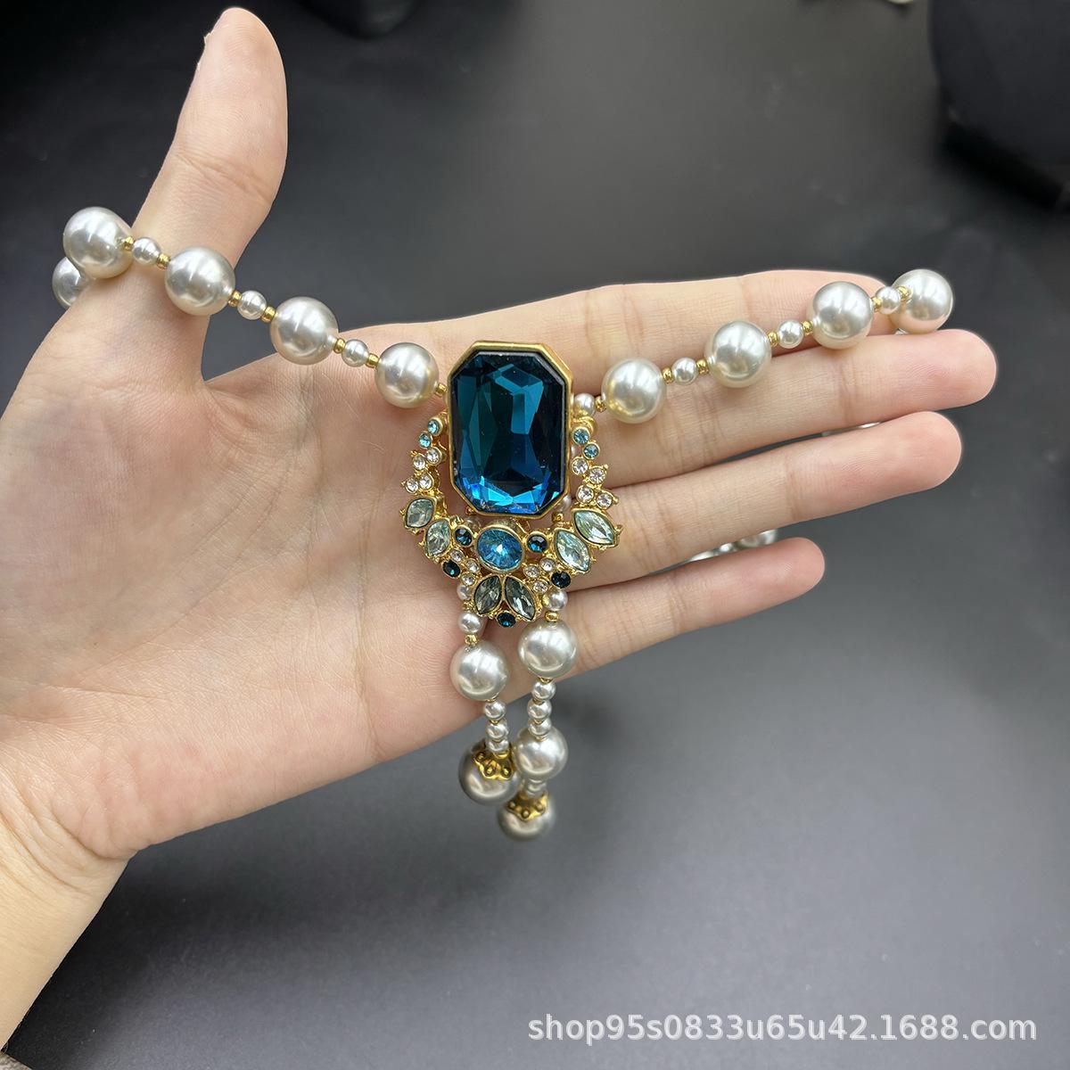 Collar de Perlas Vintage de Lujo Ligero Diseño Nicho de Alta Gama Cadena Clavícula Diamante Azul para Mujer Literario Retro Cadena Suéter para Mujer