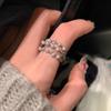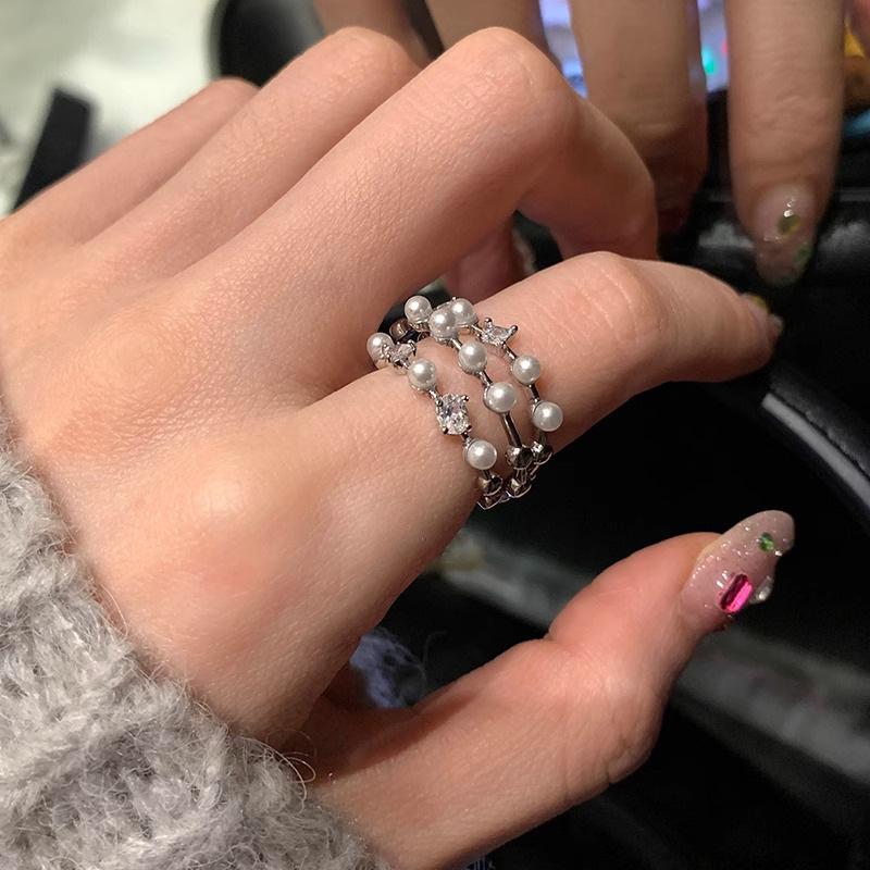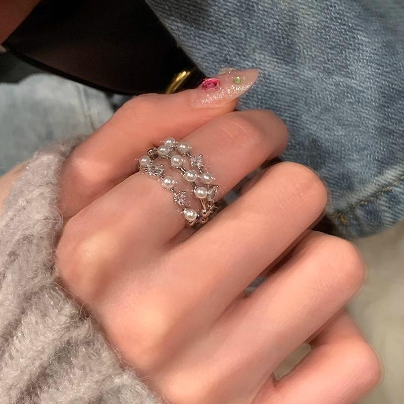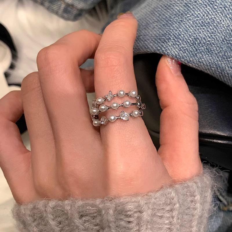 Anillo de Verano de Tres Capas de Zircón y Perla Anillo de Moda para Mujer Personalizado con Abertura Ajustable Anillo para el Dedo Índice Nueva Tendencia en Joyería para Manos
