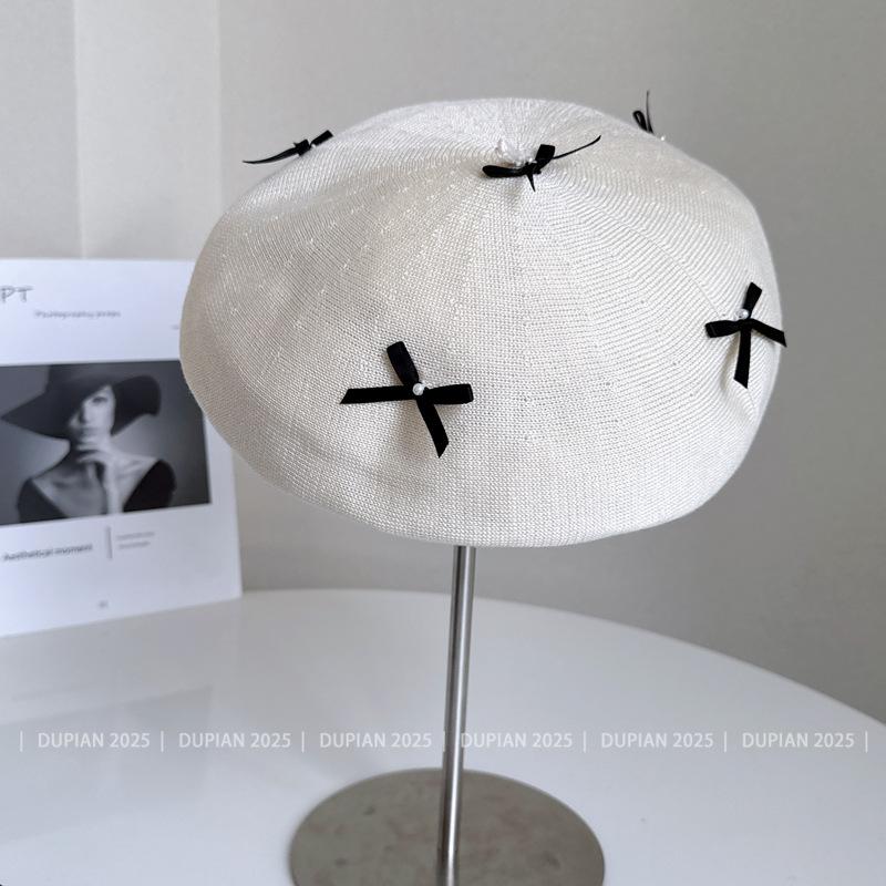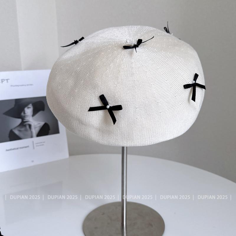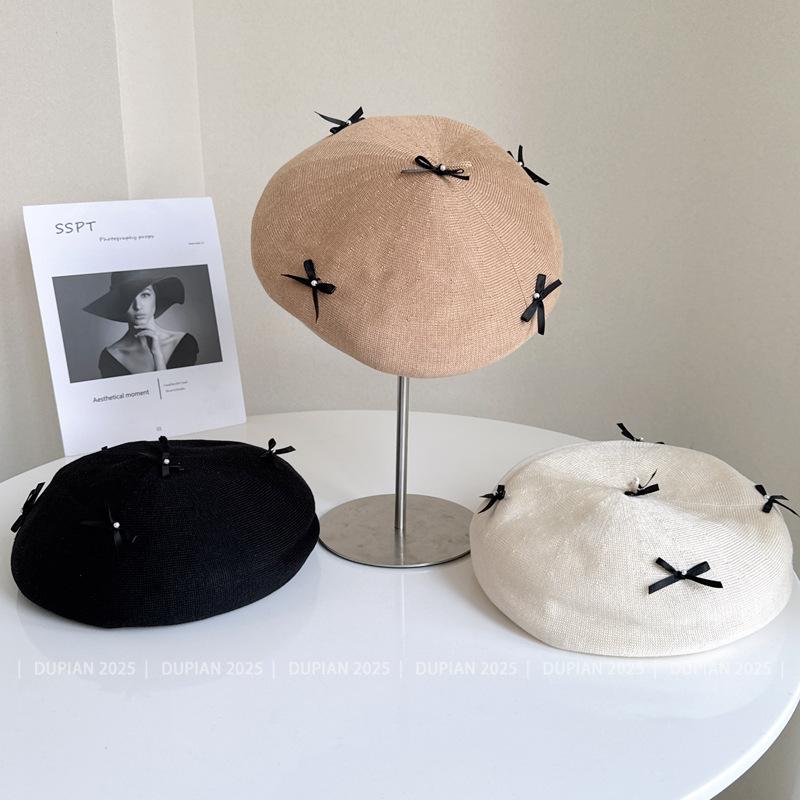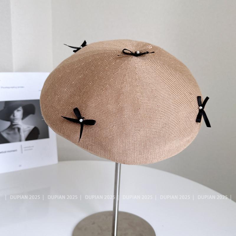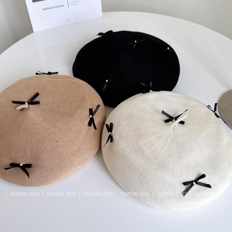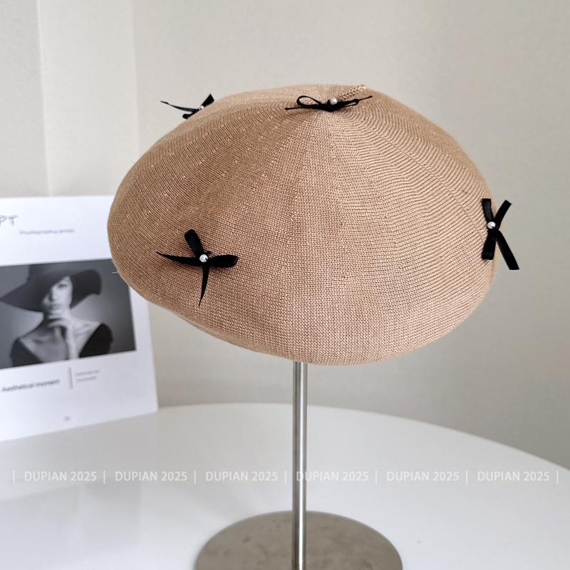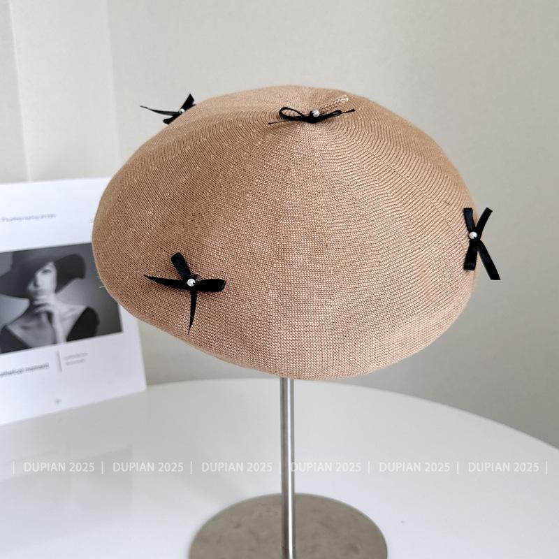 Elegante Boina de Moda con Lazo Hecho a Mano para Mujer, Sombrero de Pintor de Verano de Seda de Morera Tejido Transpirable, Boina de Moda