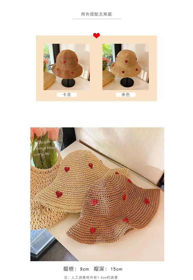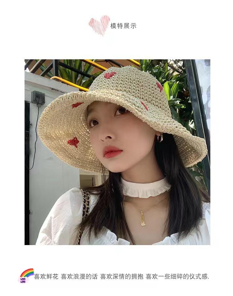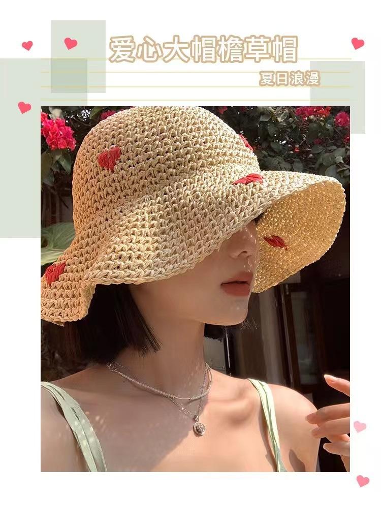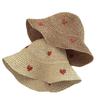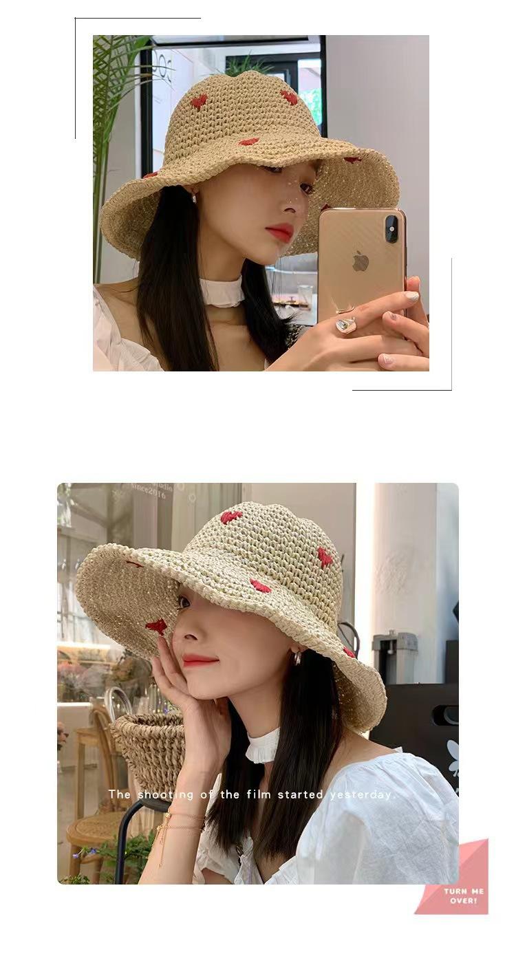Sombrero de Paja para Mujer con Protección Solar, Ala Ancha, Sombrero de Cubo con Bordes Ondulados, Sombrero de Pescador Corazón Rojo Fresco Estilo Francés, Sombrero para el Sol