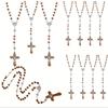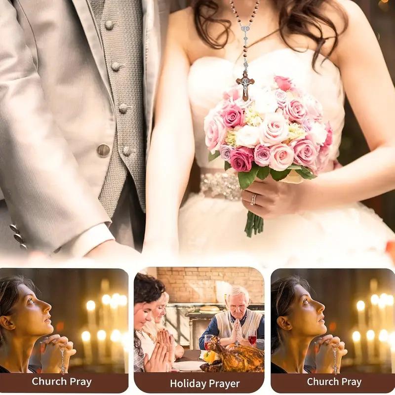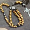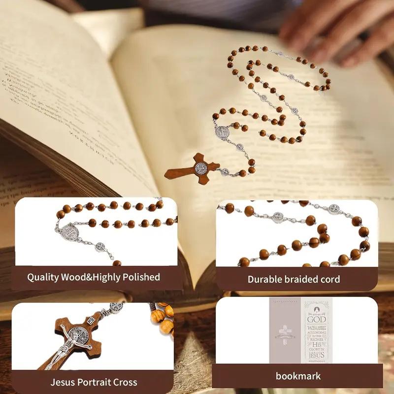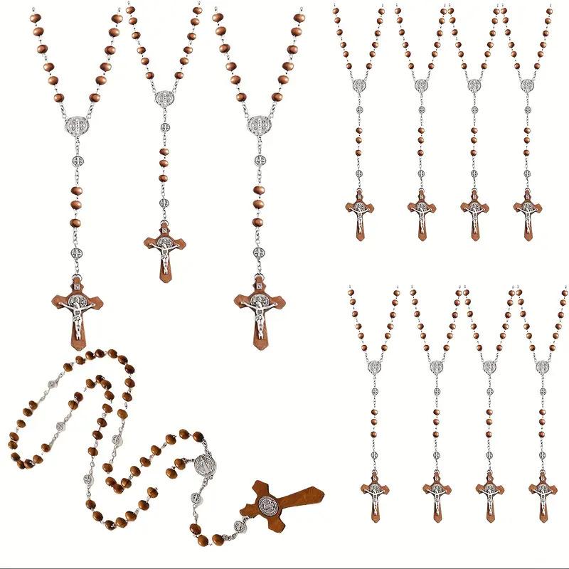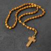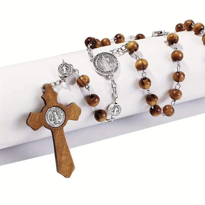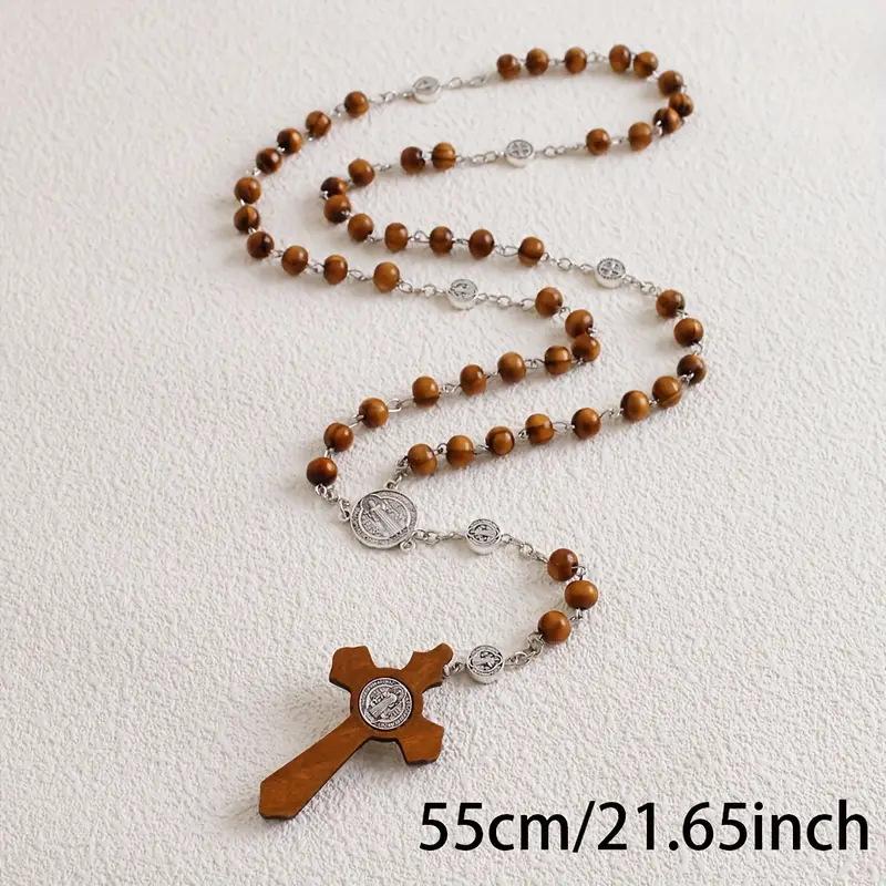 Nuevo Rosario de Cadena con Cruz de Cuentas de Madera Marrón Natural de Amazon, Hecho a Mano con Aguja Curva para Oración