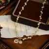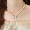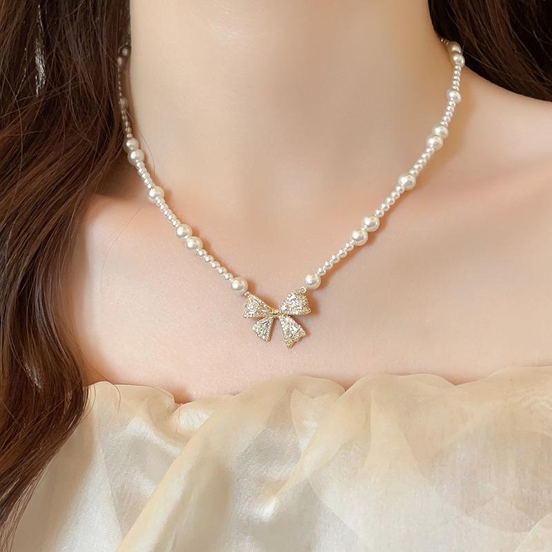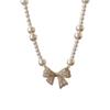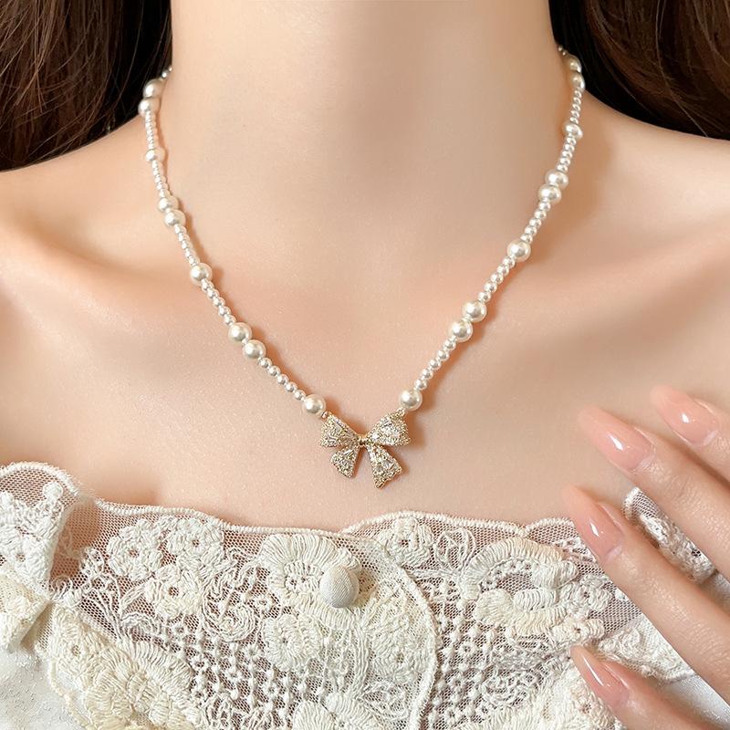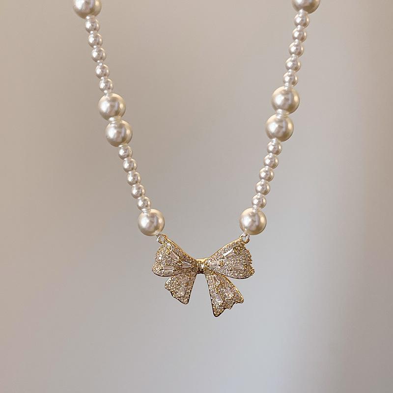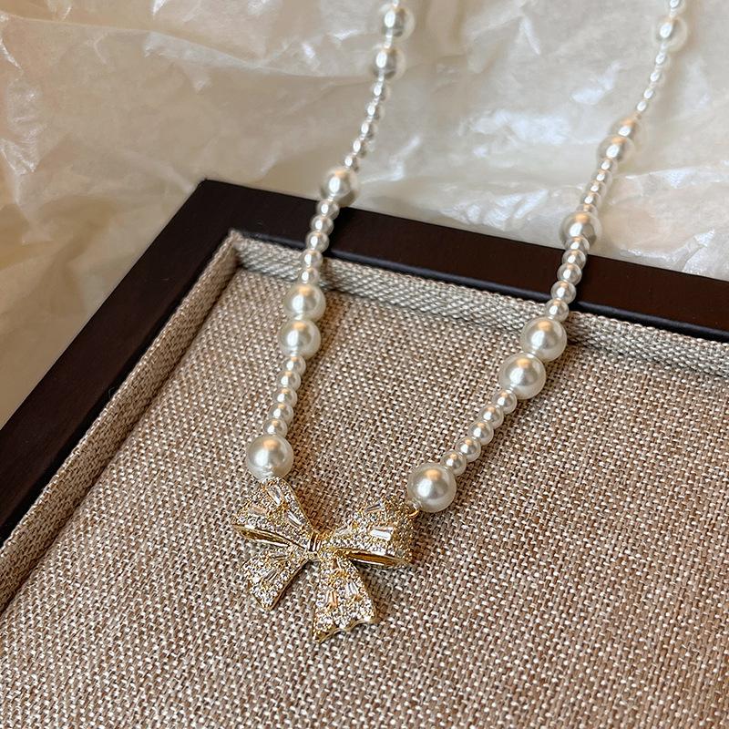 Nuevo Estilo Micro-incrustado Colgante de Lazo Collar de Perlas Francés Retro Lujo Ligero Cadena para Clavícula Joyería Elegante