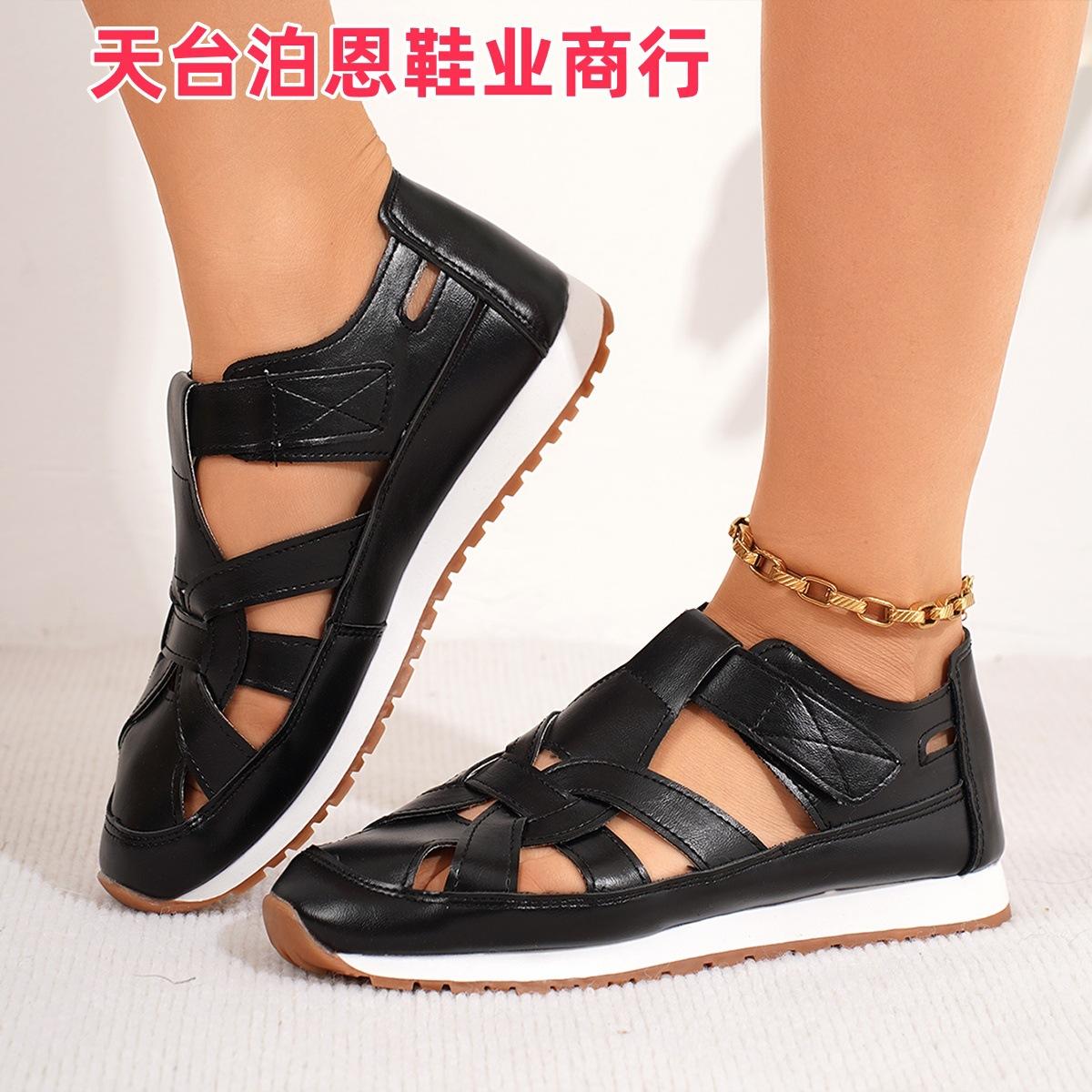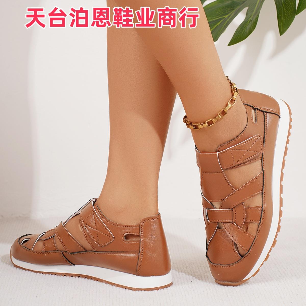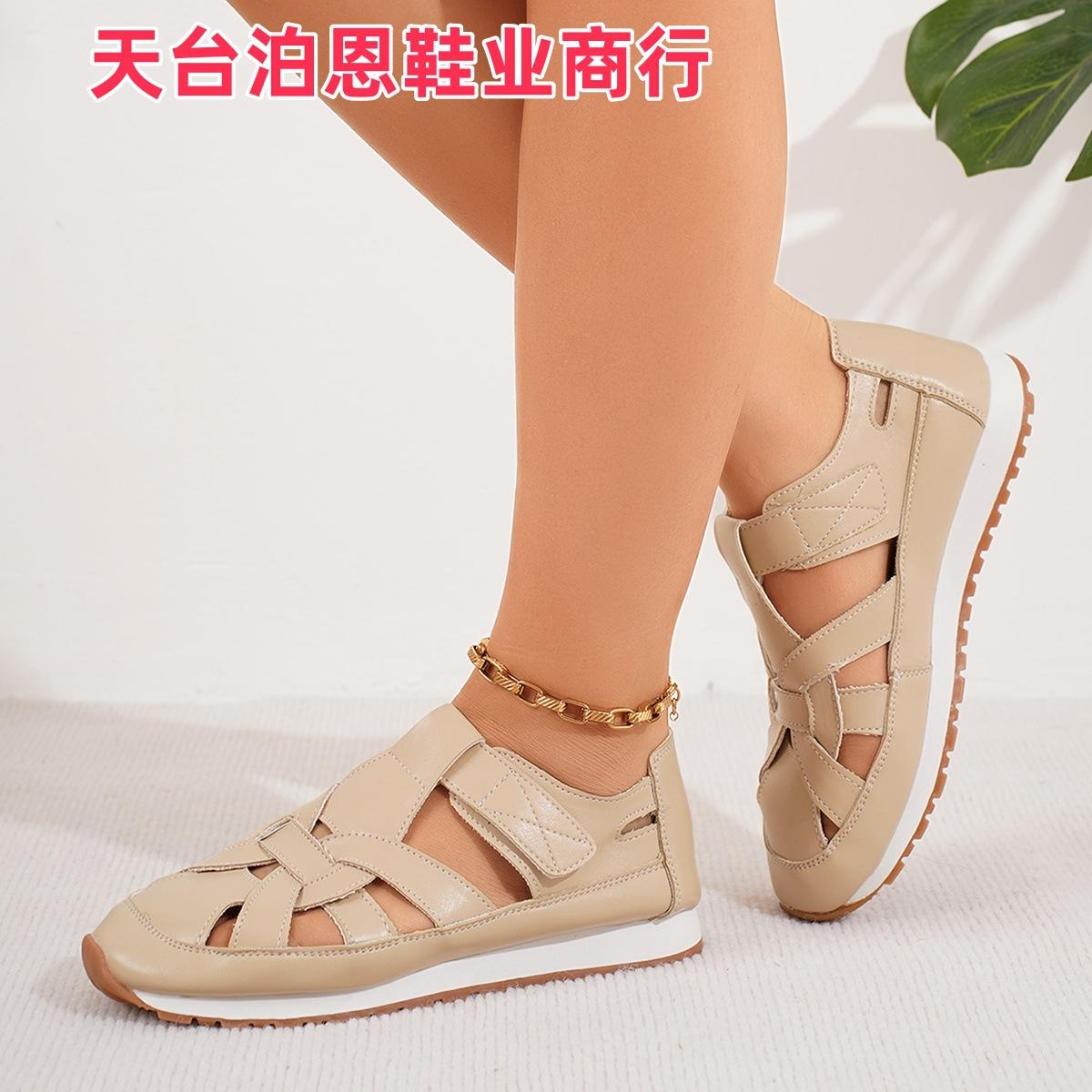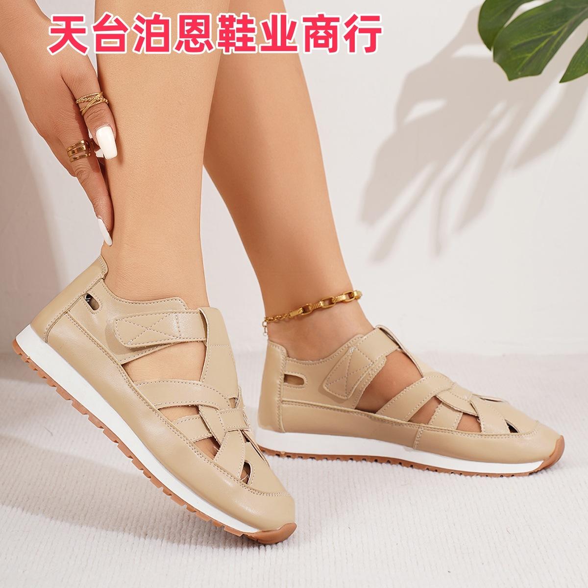 Moda Europea y Americana Verano Nuevo Velcro Punta Redonda Sandalias Planas de Mujer Comercio Exterior Transfronterizo Punto Sandalias Romanas de Mujer