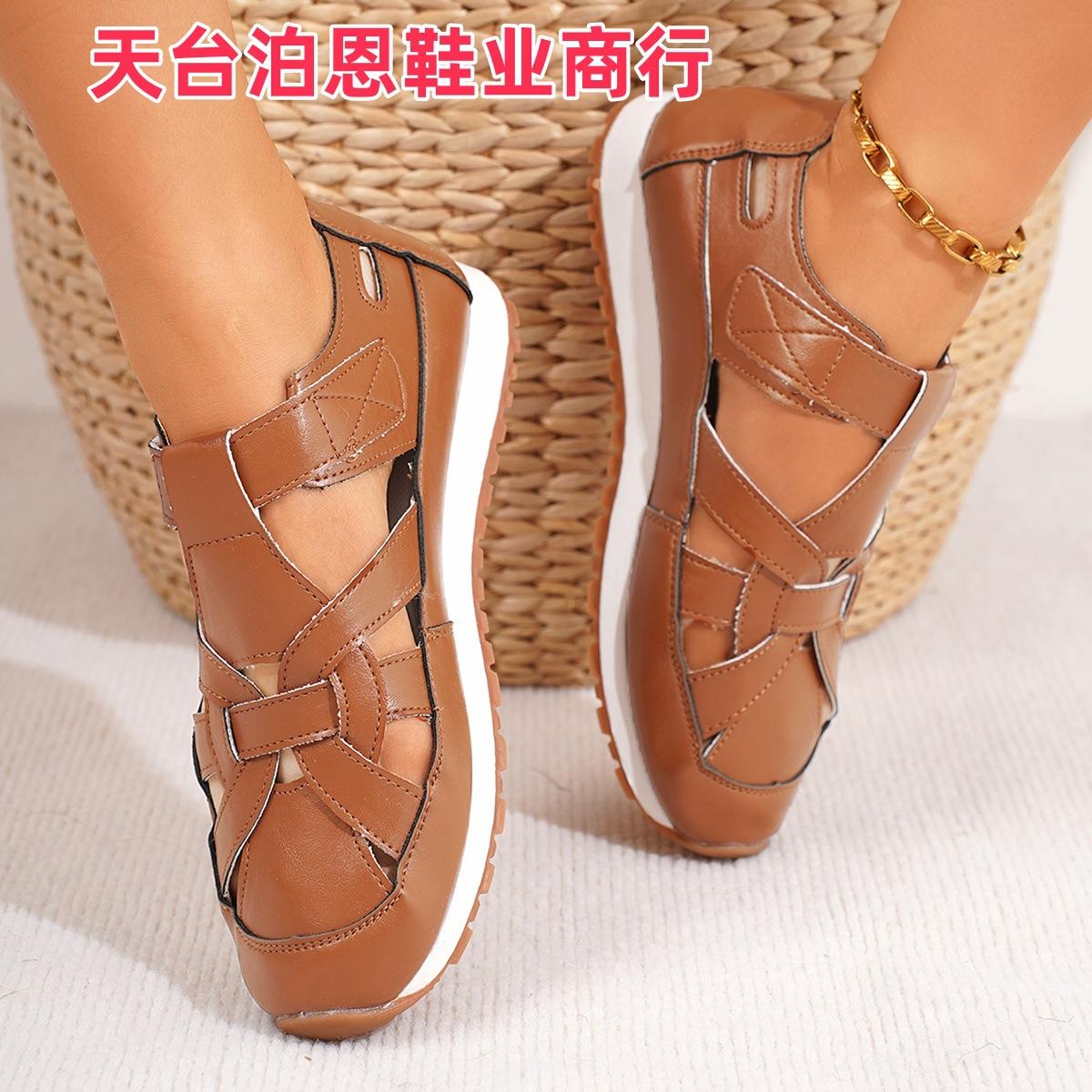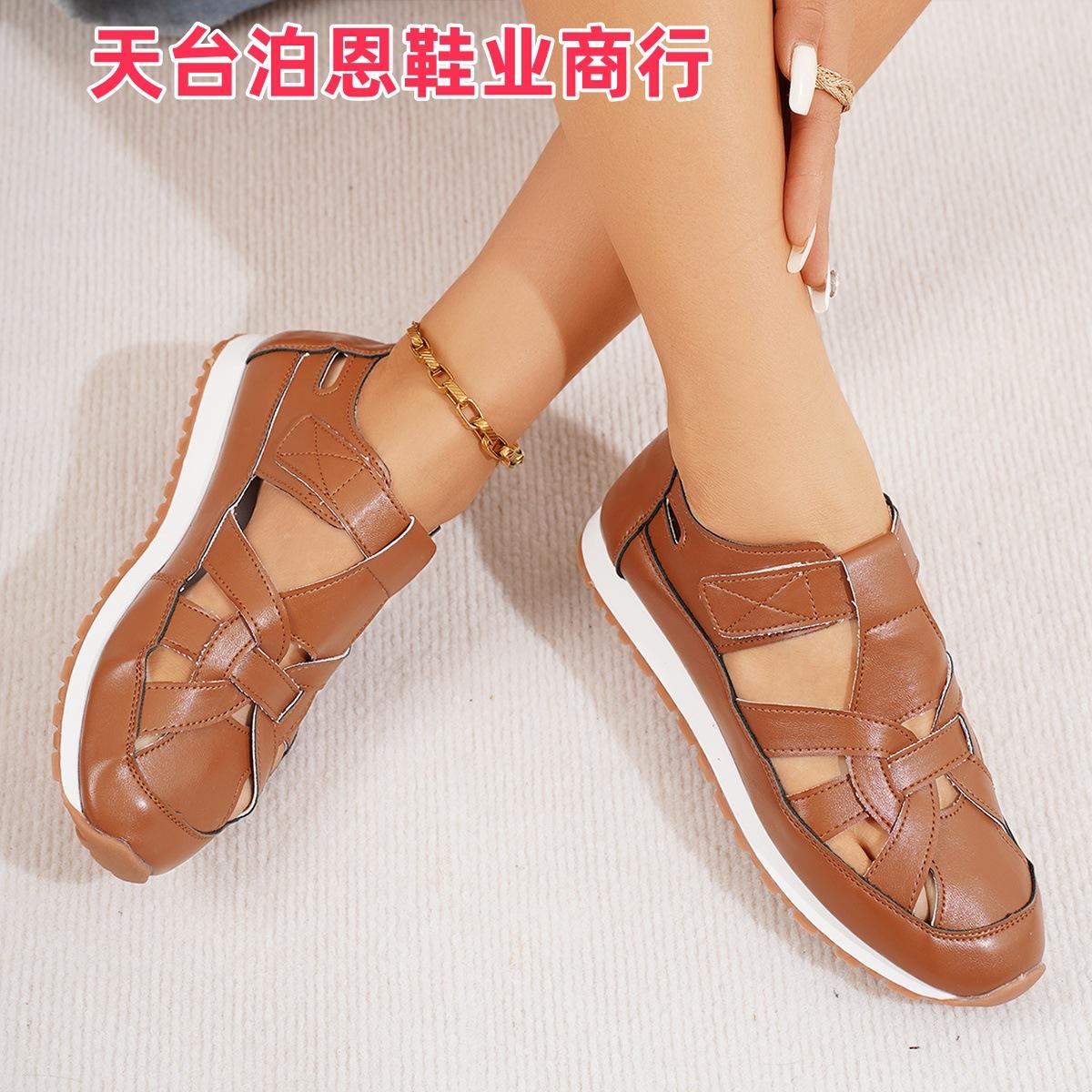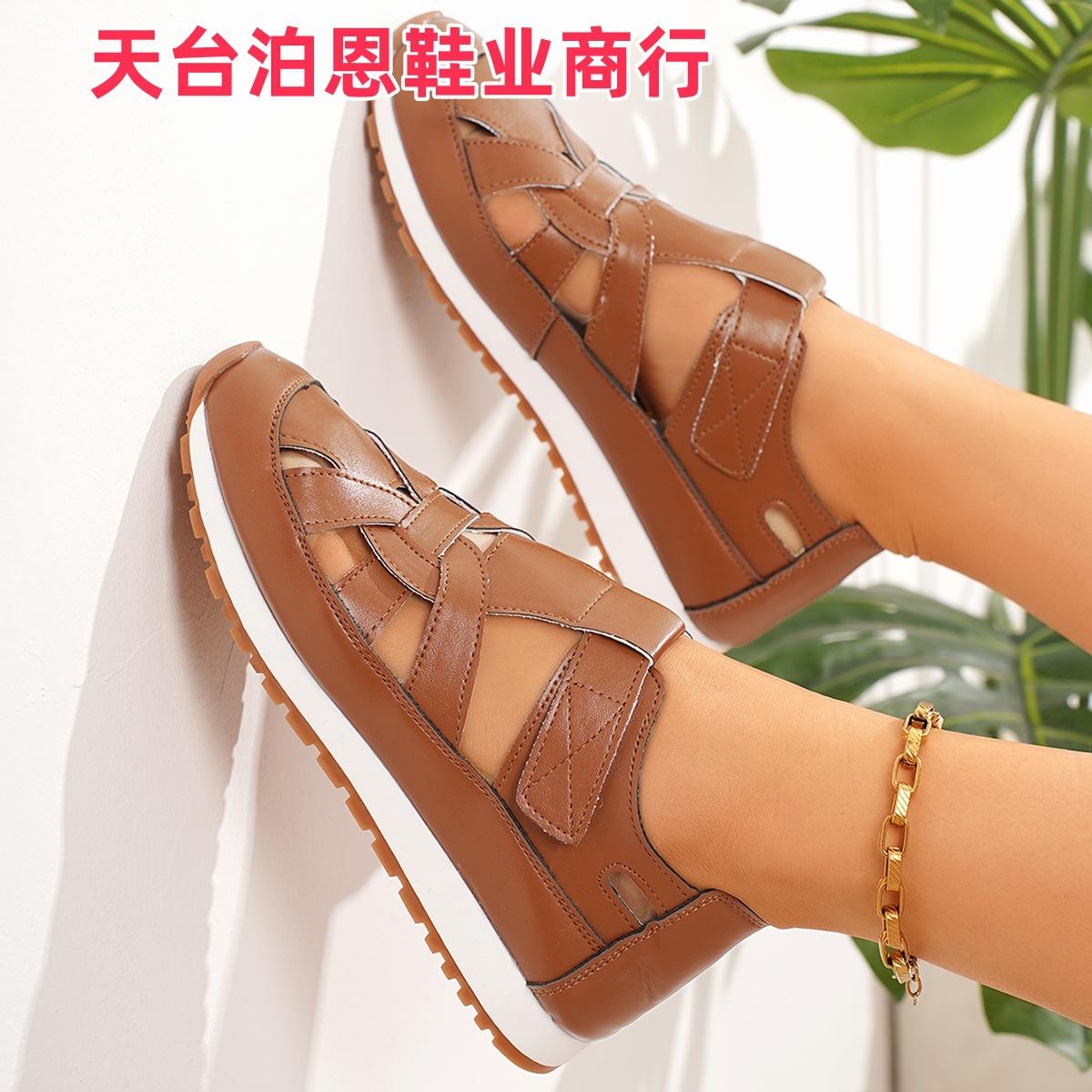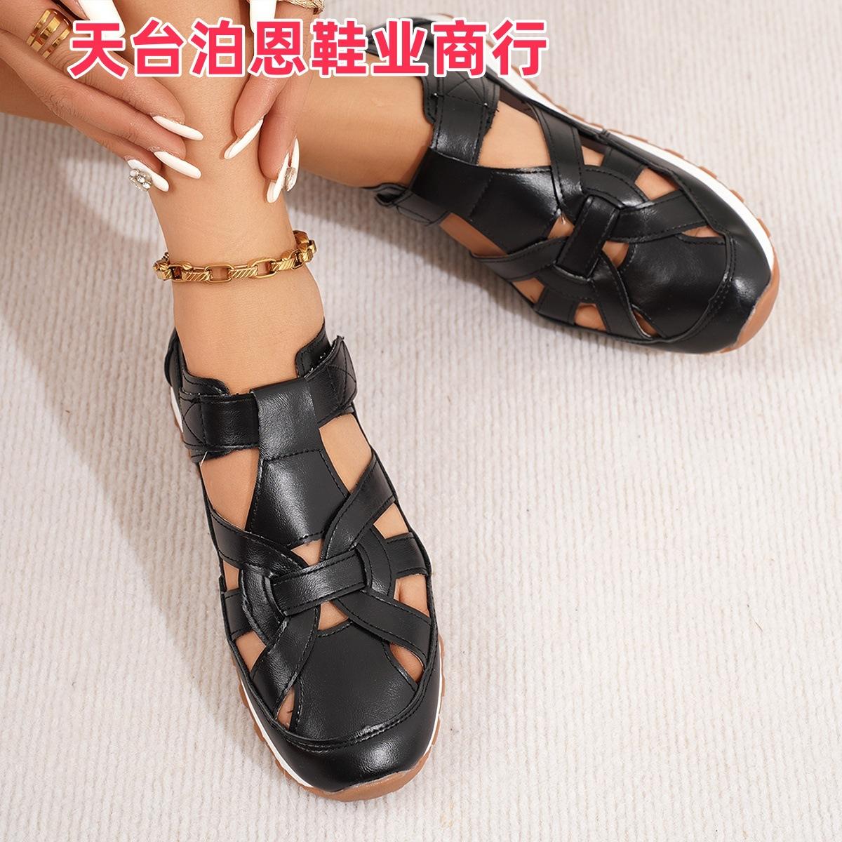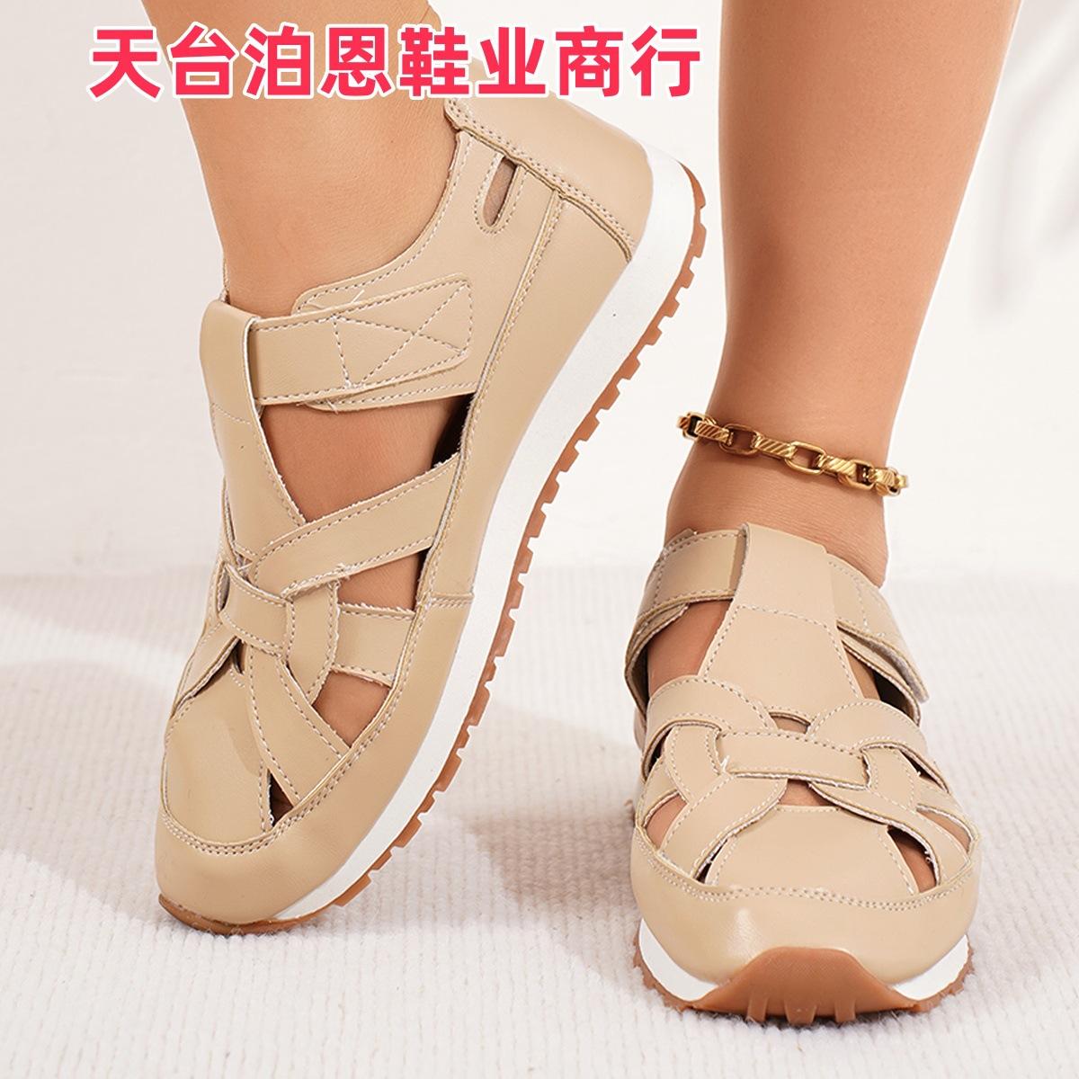 Moda Europea y Americana Verano Nuevo Velcro Punta Redonda Sandalias Planas de Mujer Comercio Exterior Transfronterizo Punto Sandalias Romanas de Mujer