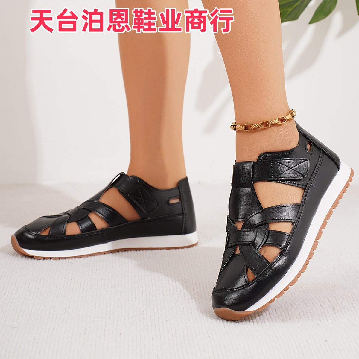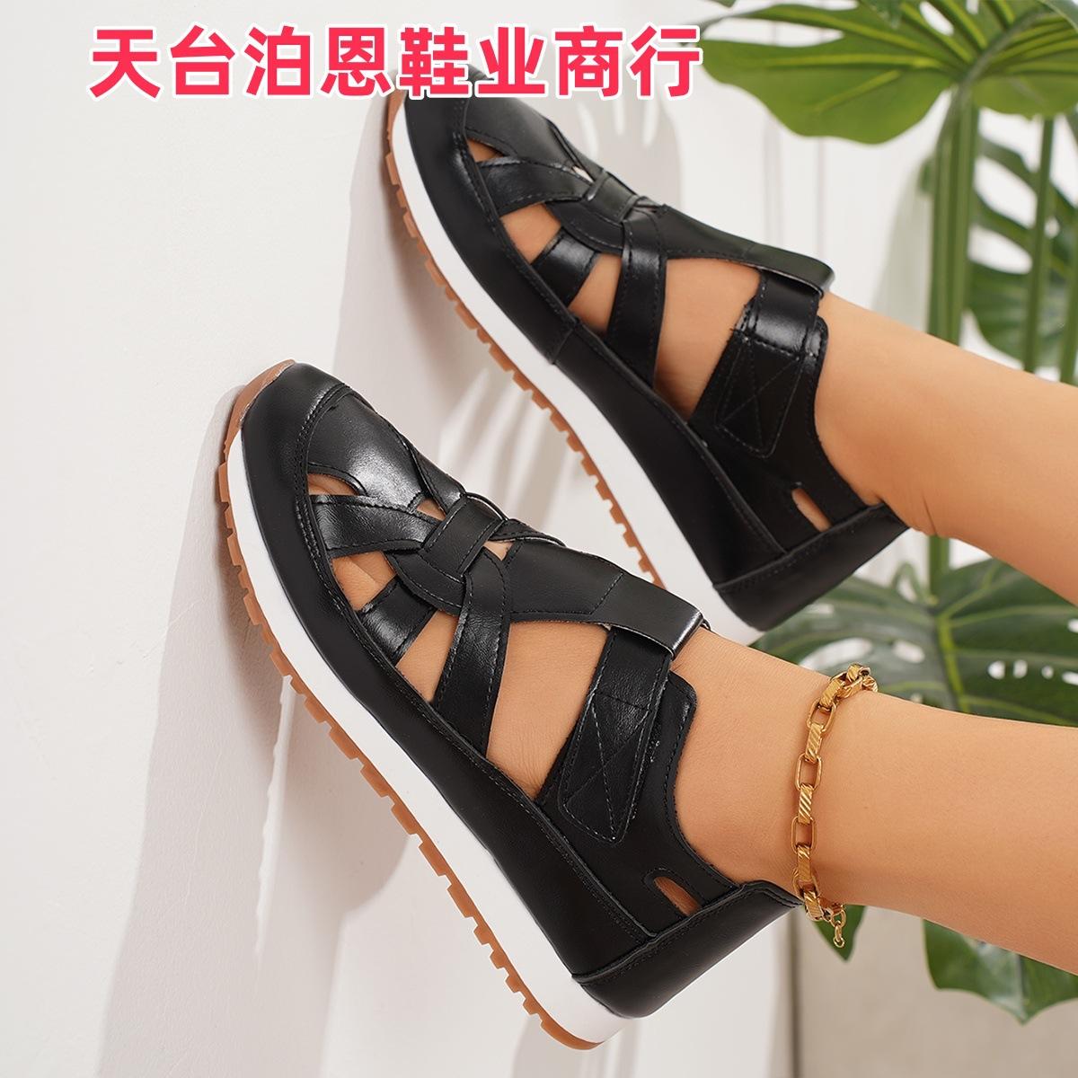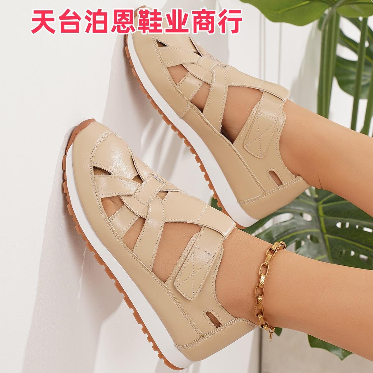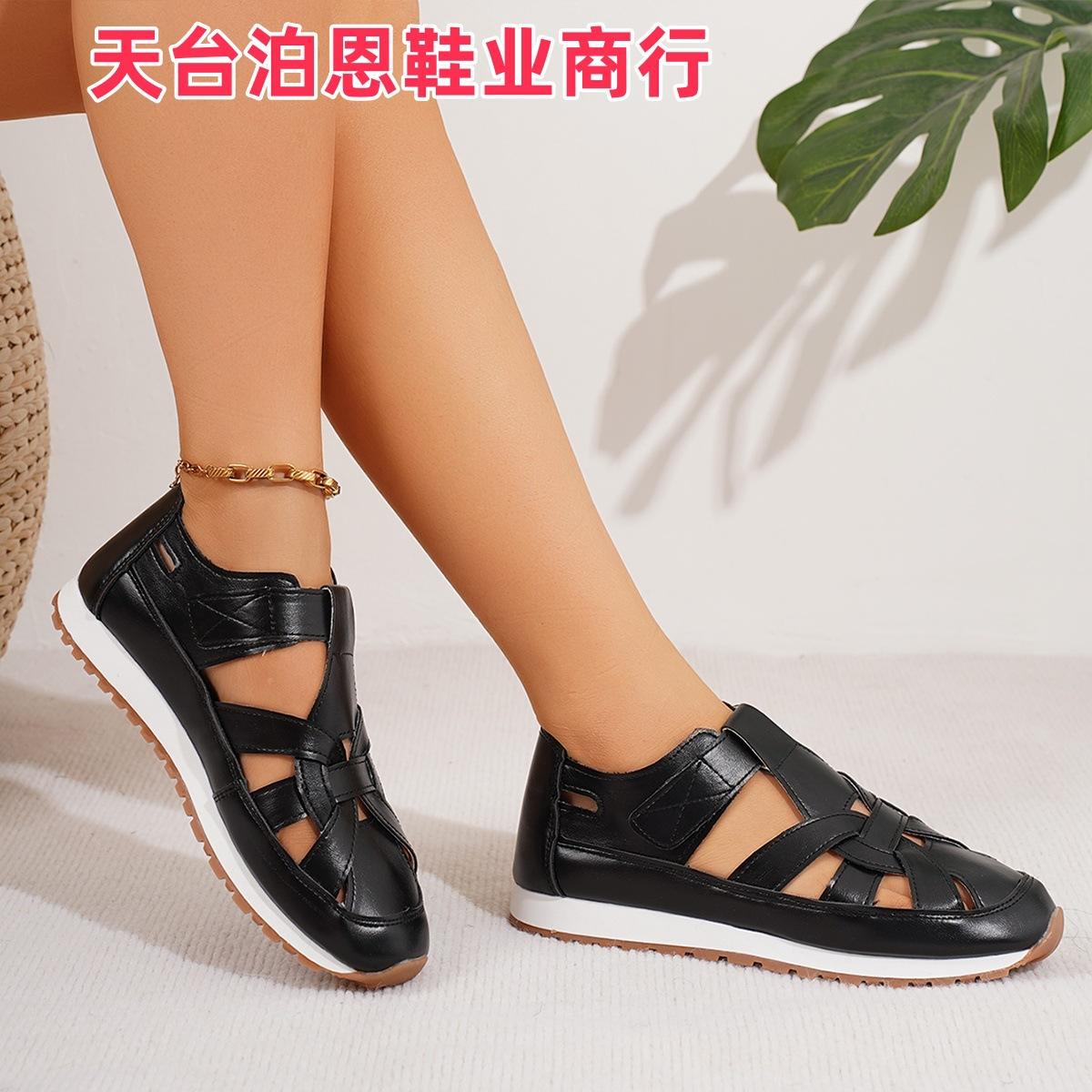 Moda Europea y Americana Verano Nuevo Velcro Punta Redonda Sandalias Planas de Mujer Comercio Exterior Transfronterizo Punto Sandalias Romanas de Mujer