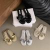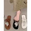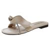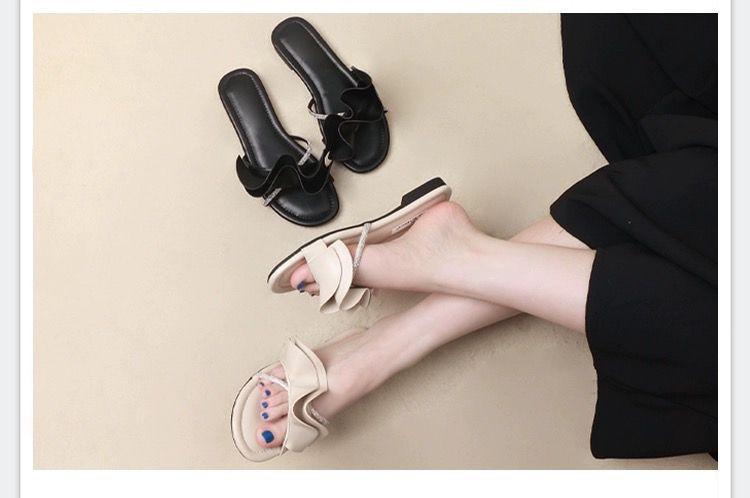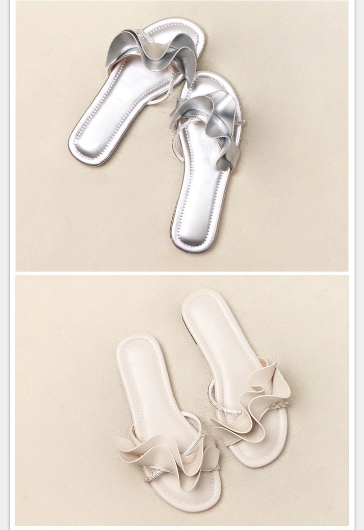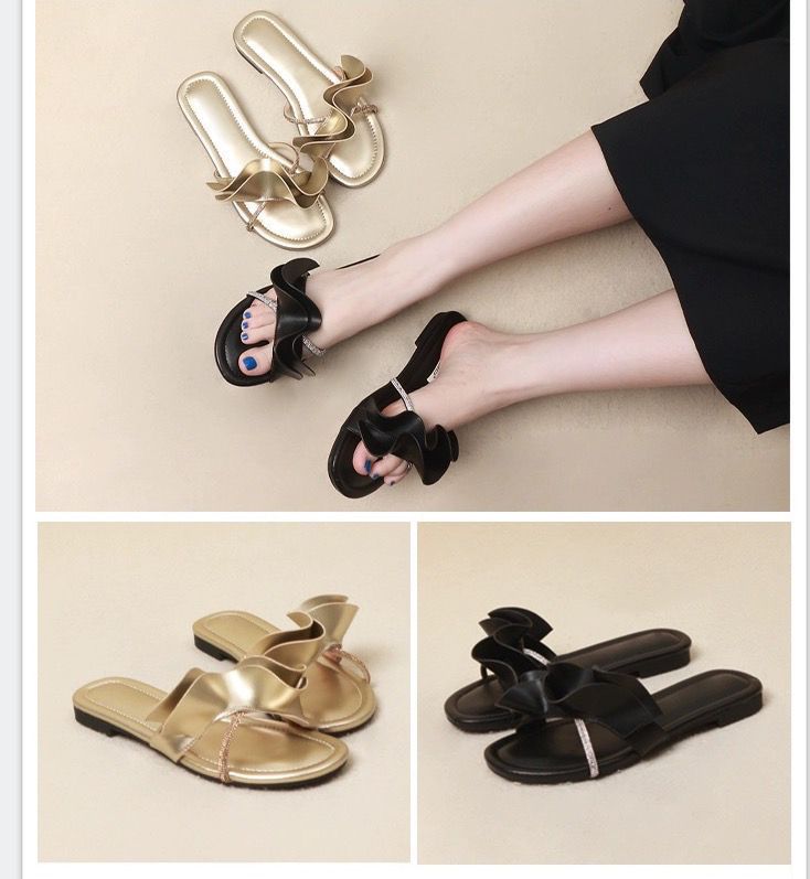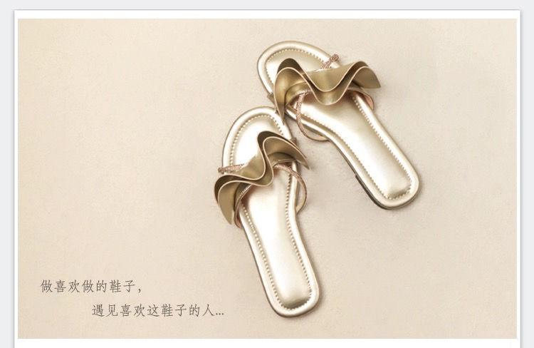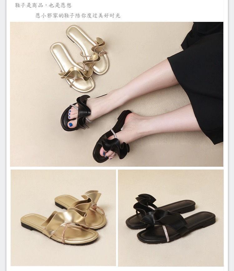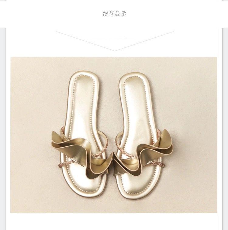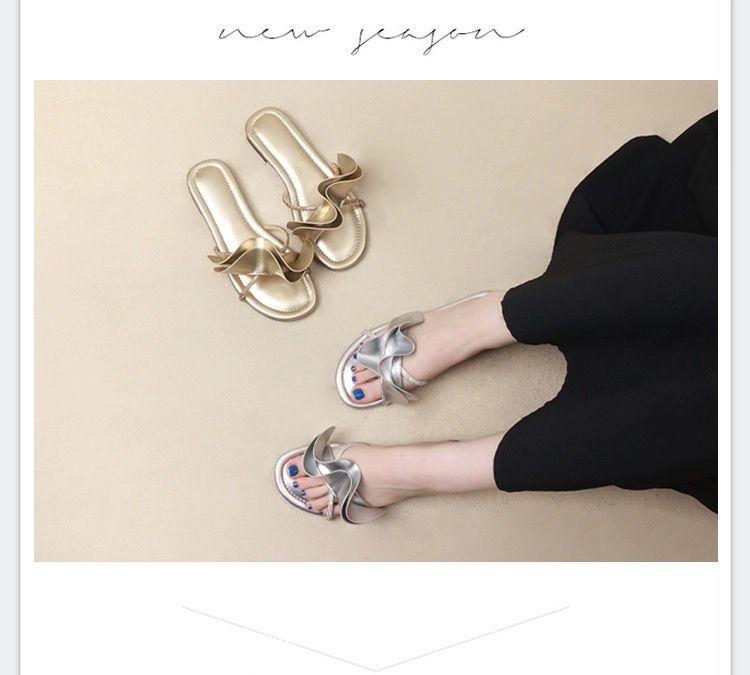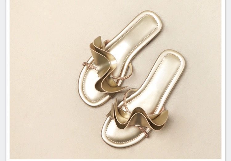 Zapatillas de hoja de loto de hadas con sensación de playa ventosa para mujer, verano, color dorado, sandalias francesas de una palabra, nuevas de suela plana