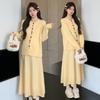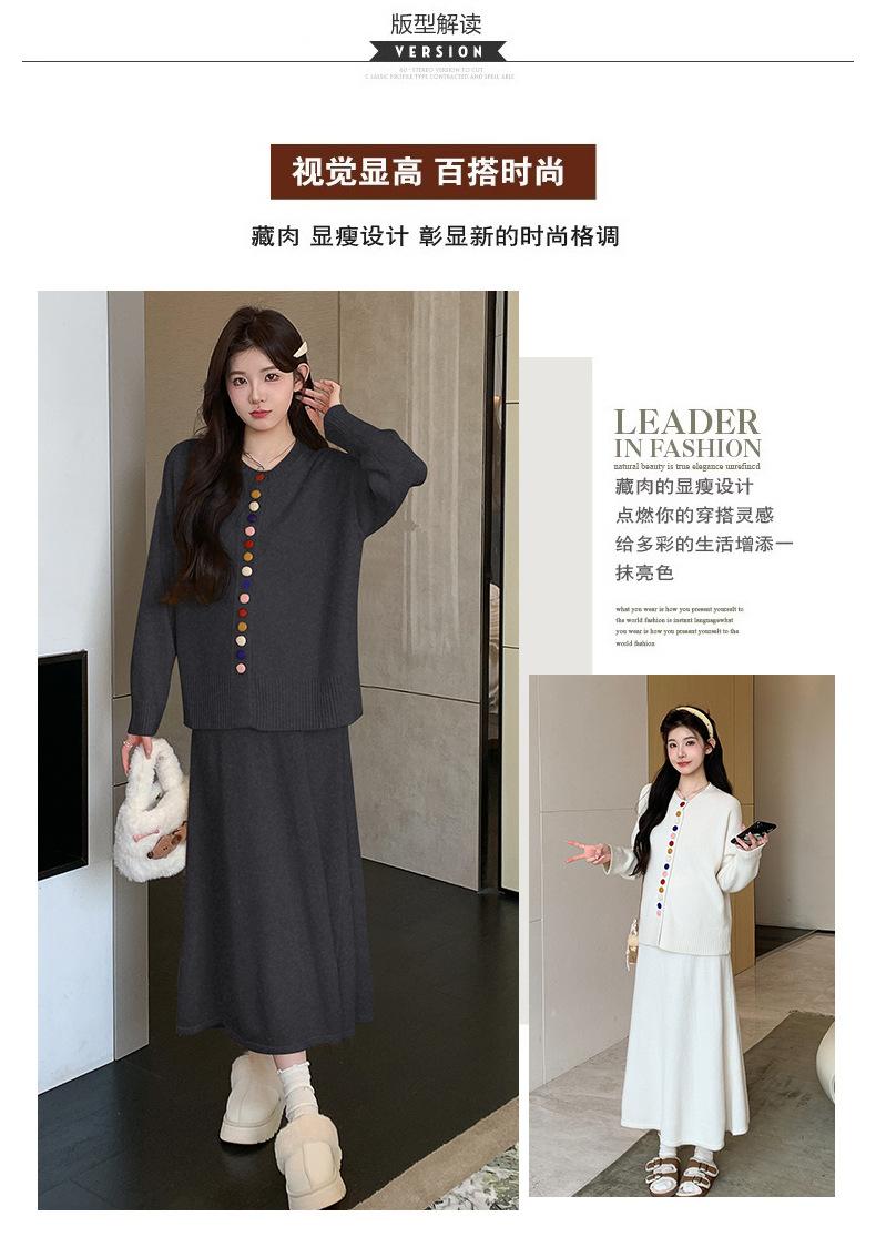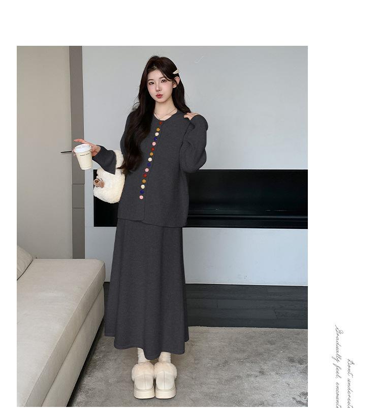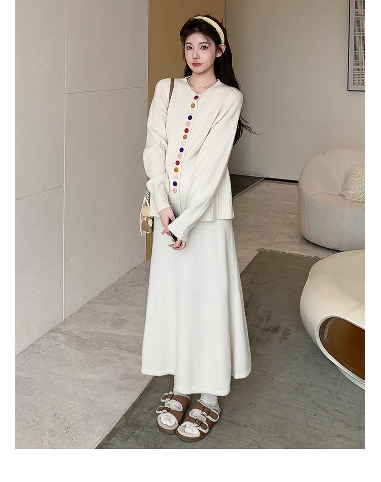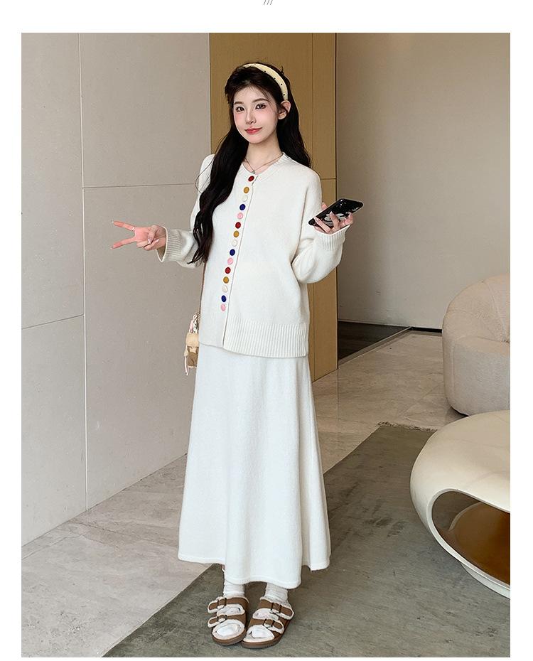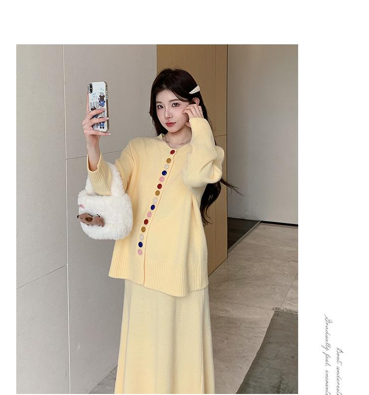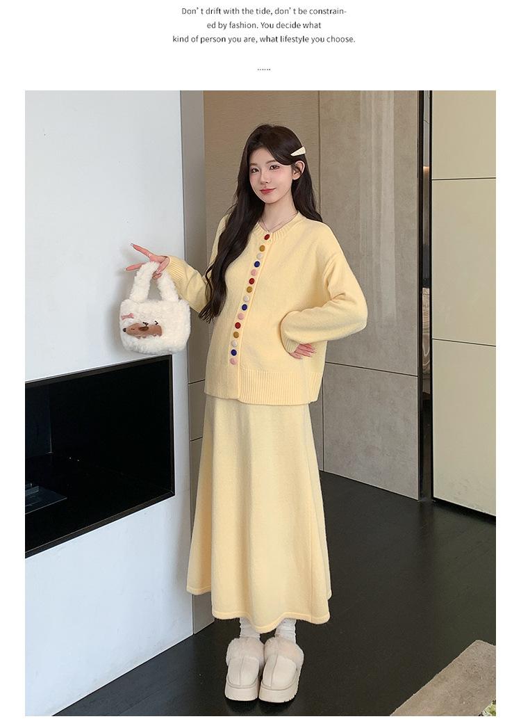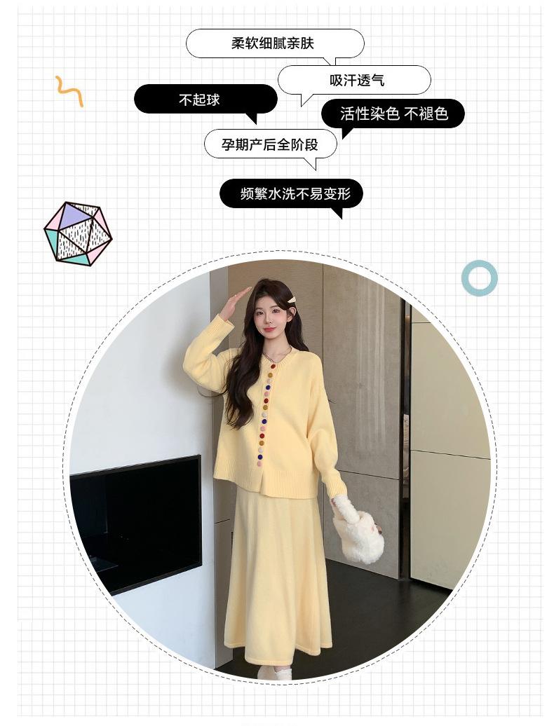En Stock Otoño/Invierno 2025 Estilo Coreano Holgado Arcoíris Botón Jersey Top de Maternidad + Falda Midi Set de Maternidad Tejido