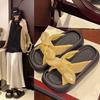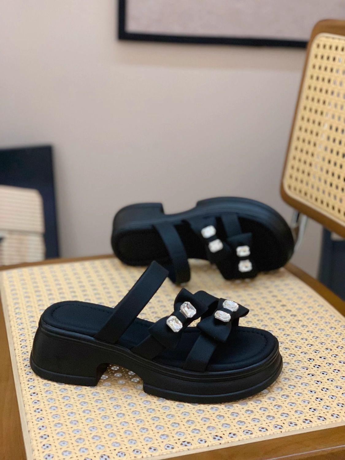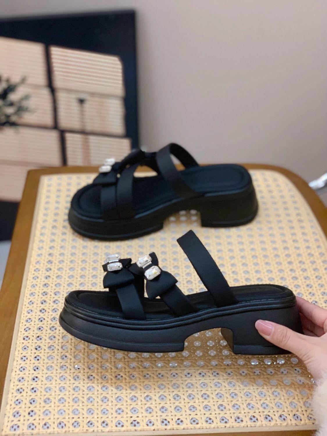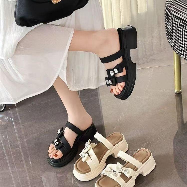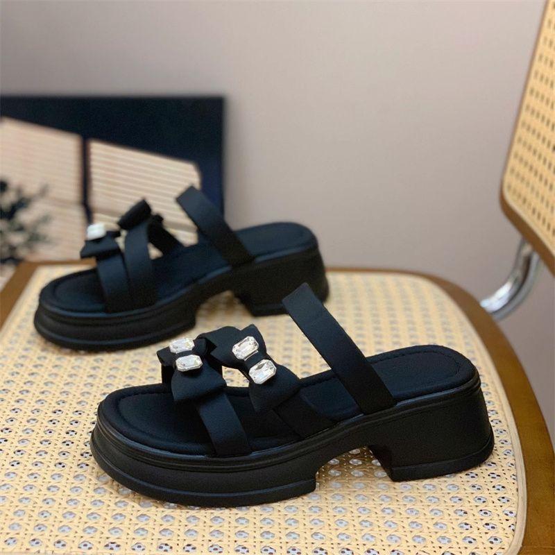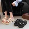 Ropa exterior estilo hada zapatos de playa lazo pantuflas de pedrería 2025 verano nuevo versátil plataforma sandalias de suela gruesa mujer