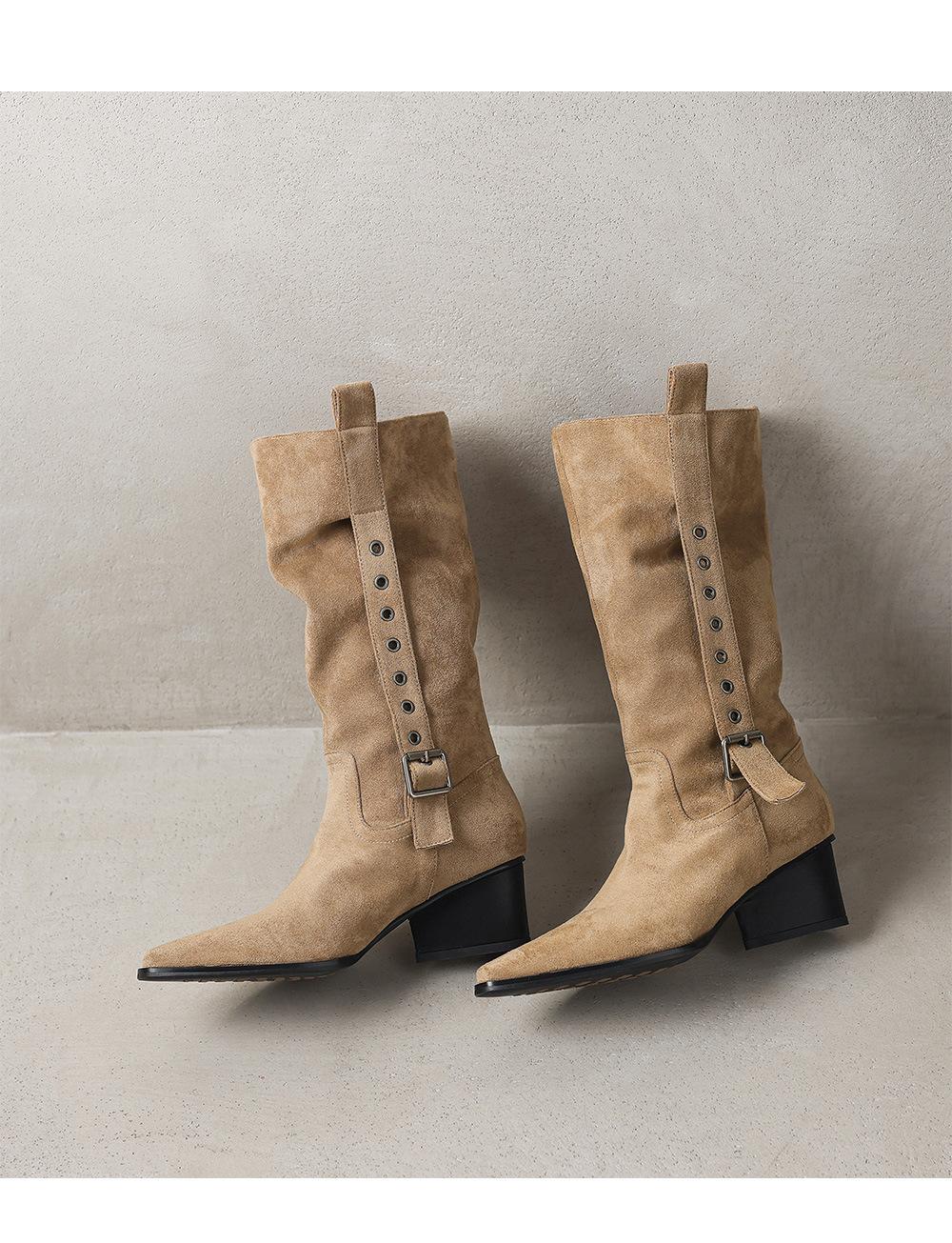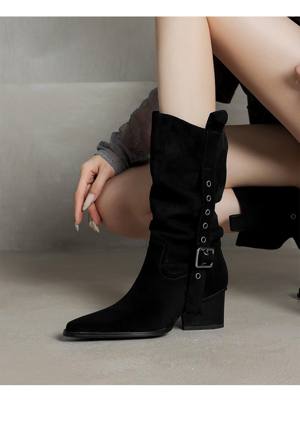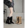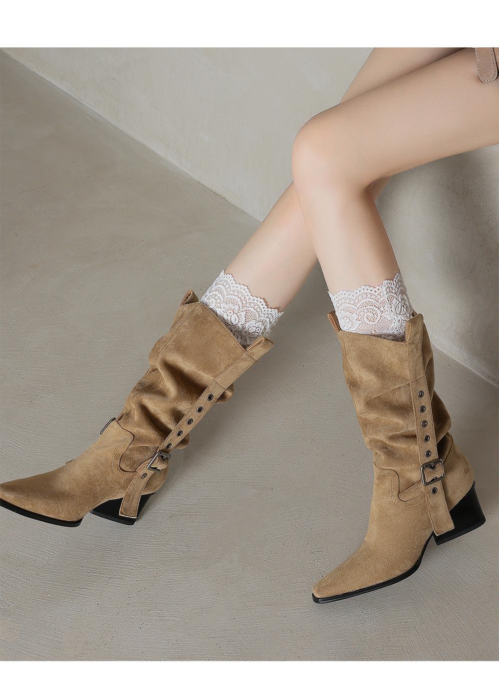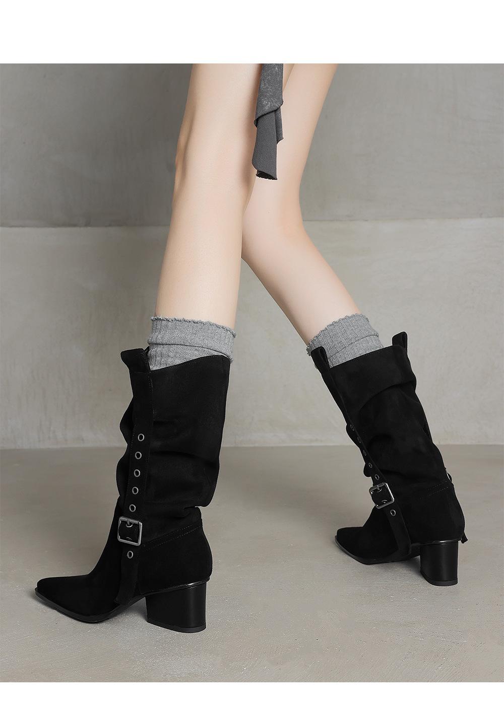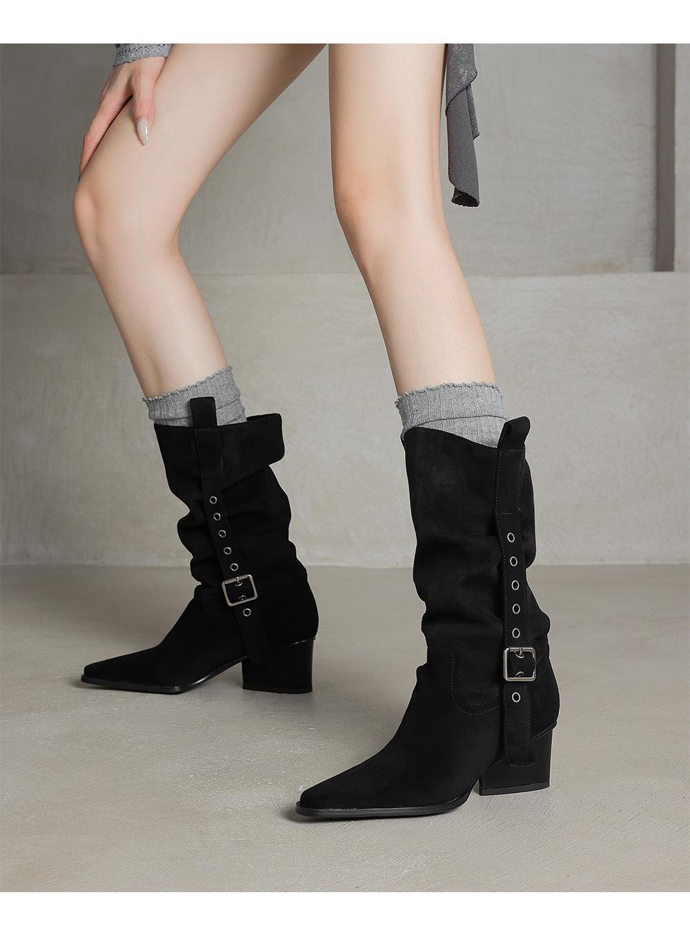 Botas francesas de tacón grueso fruncidas slouch hasta media pantorrilla para mujer 2025 otoño/invierno nuevas caña ancha botas vaqueras occidentales botas cortas adelgazantes