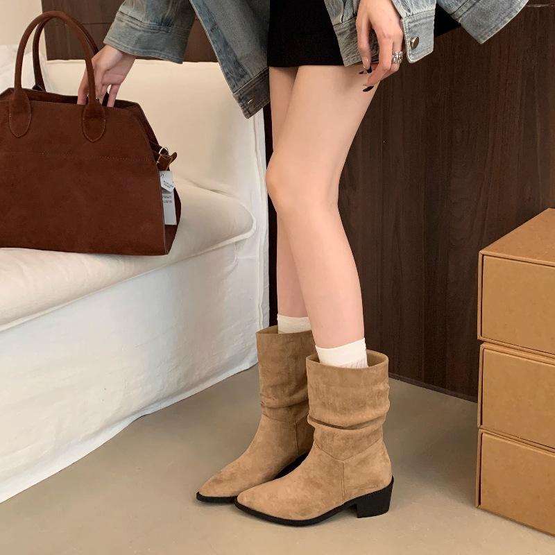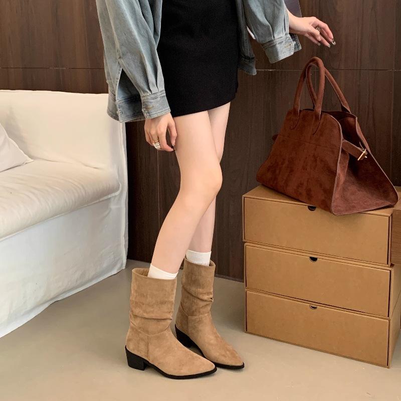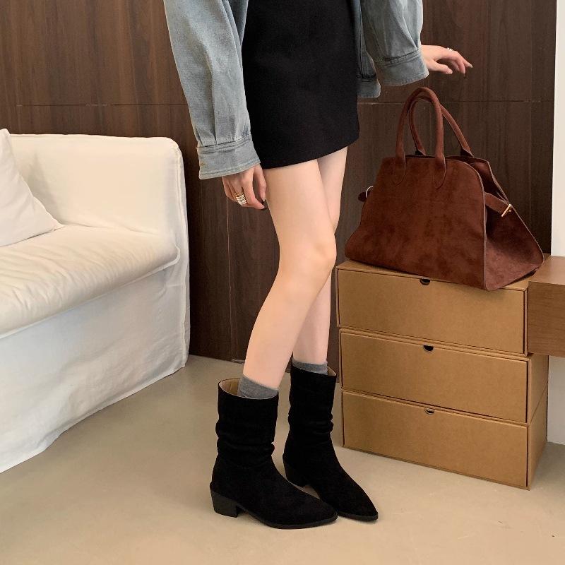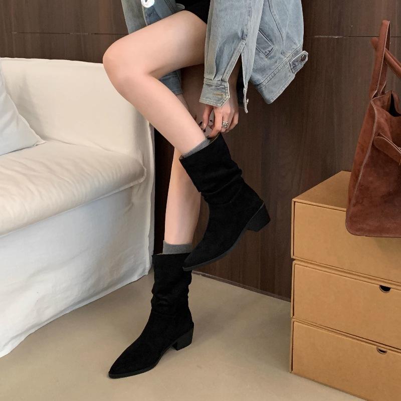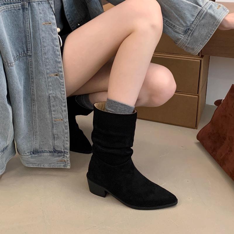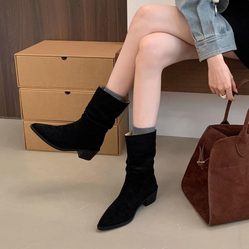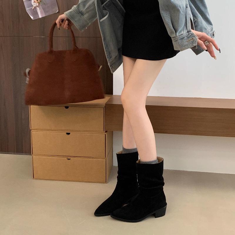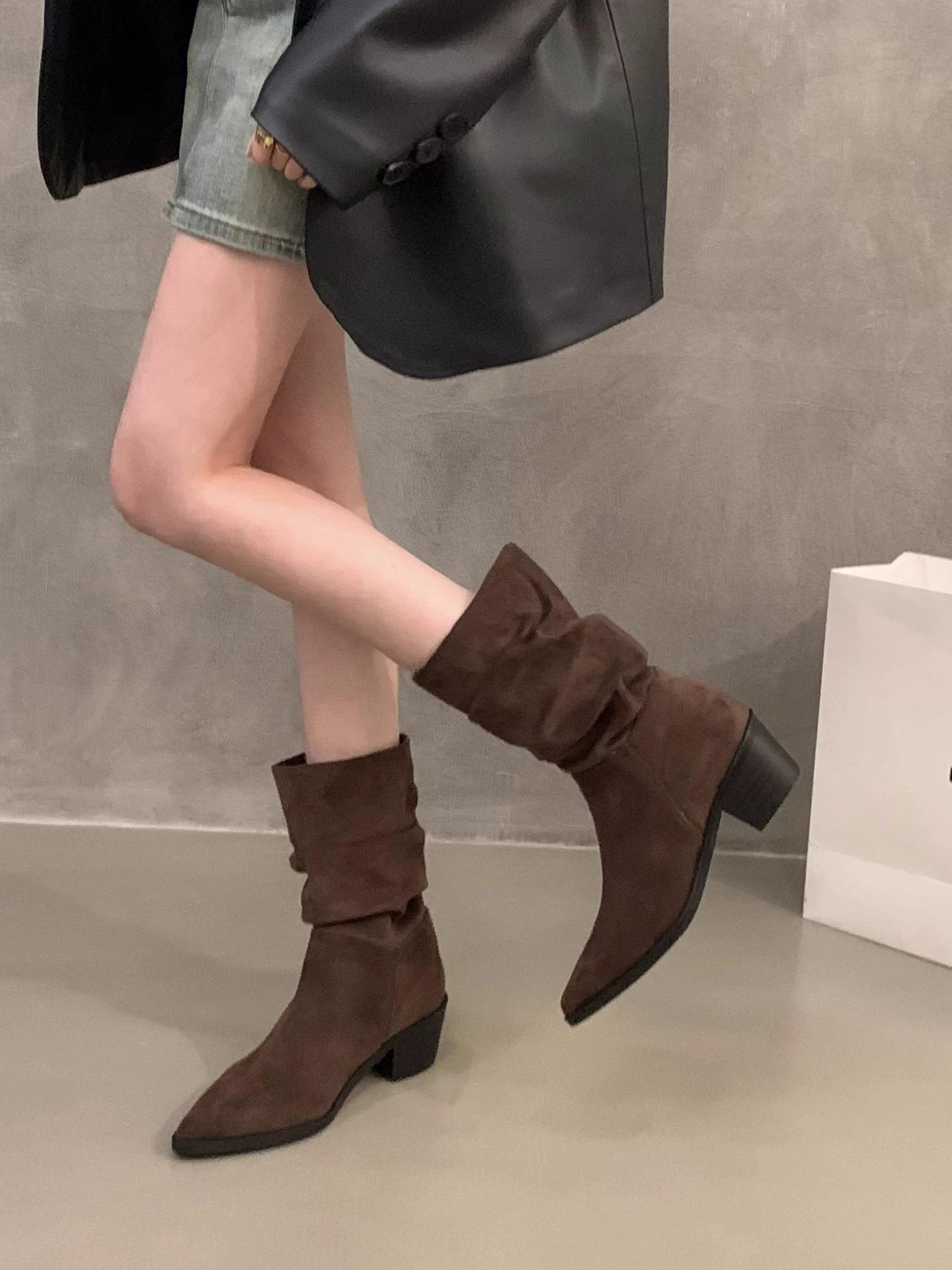Botines de Estilo Francés Zapatos de Mujer Tacón Alto Grueso Punta Afilada Botines Ajustados Fruncidos 2025 Otoño/Invierno Nuevos Botines Apilados Botines