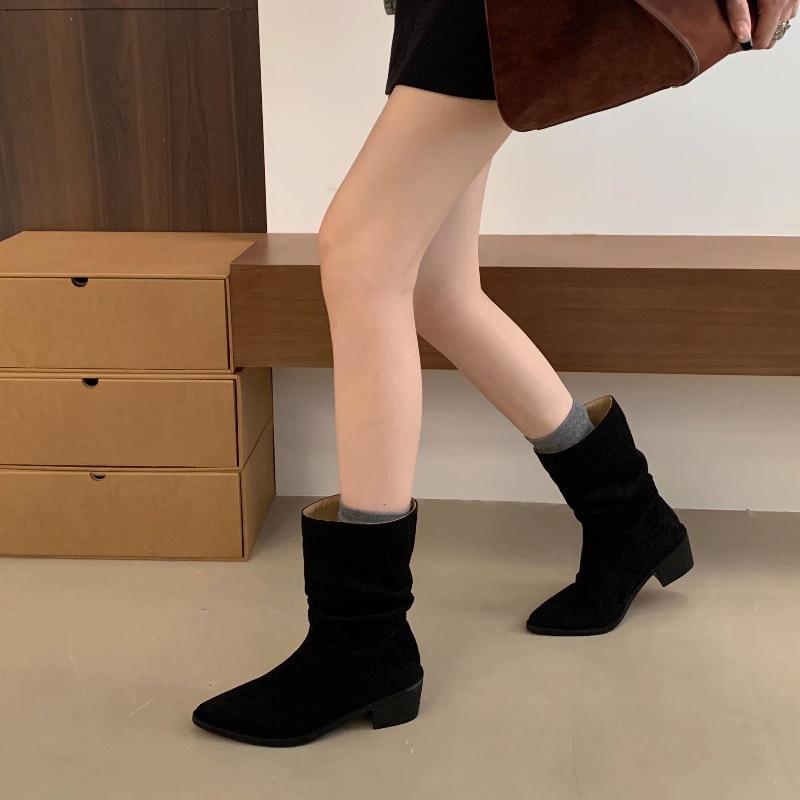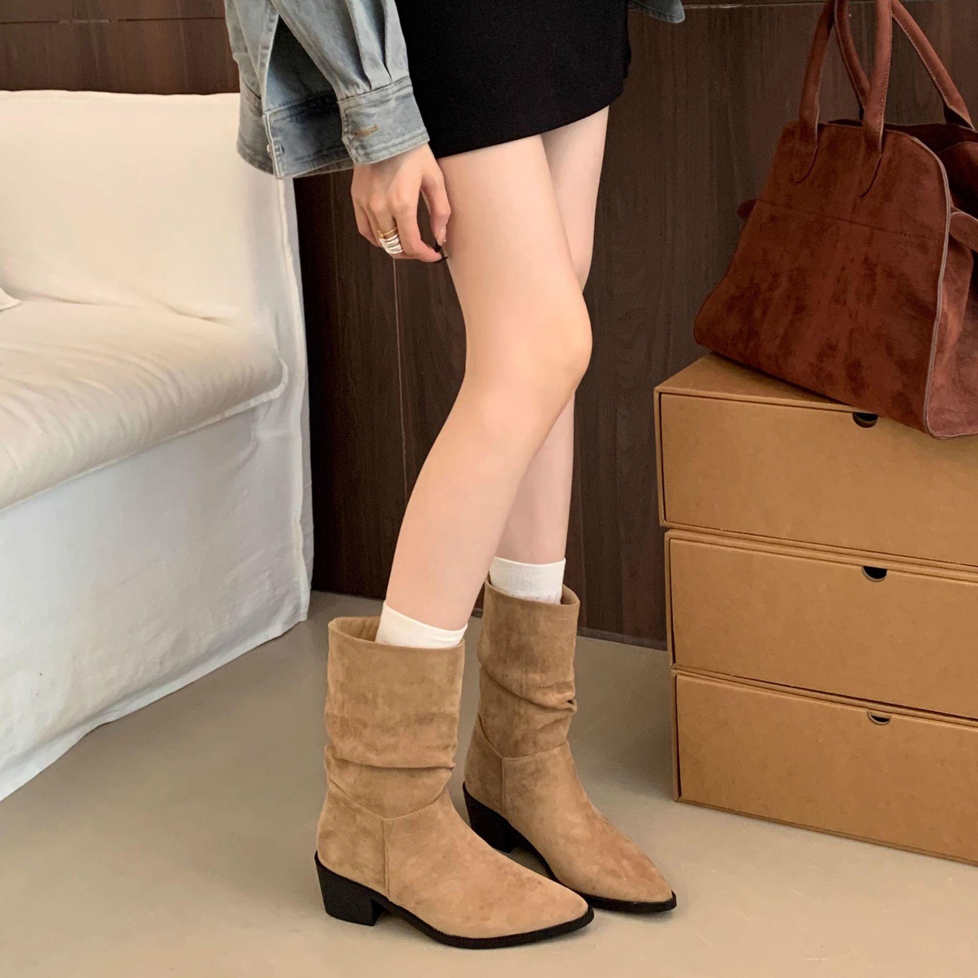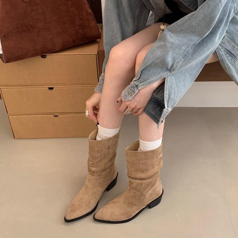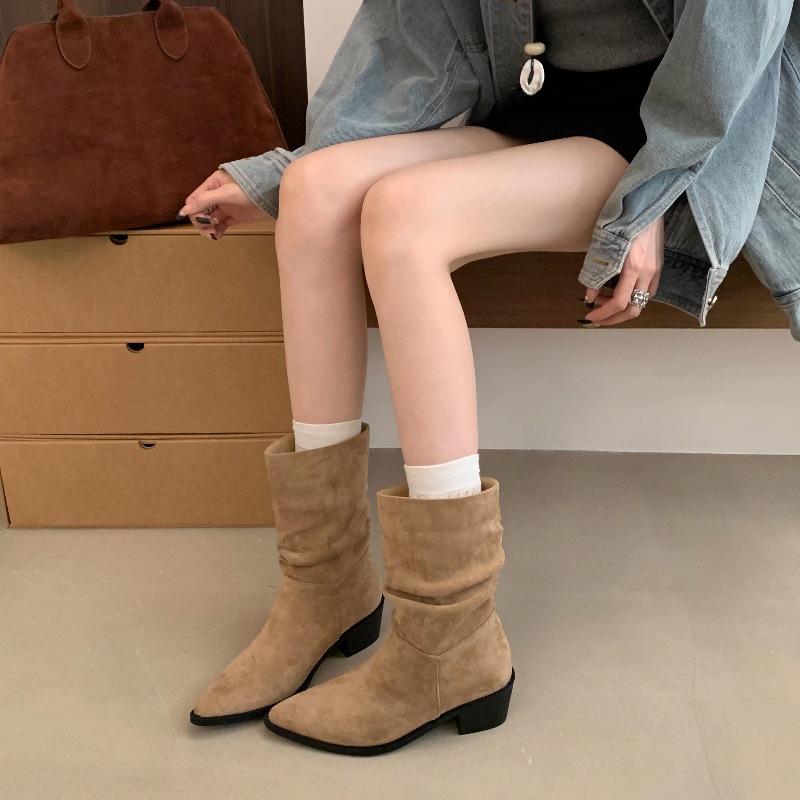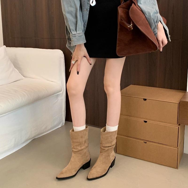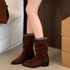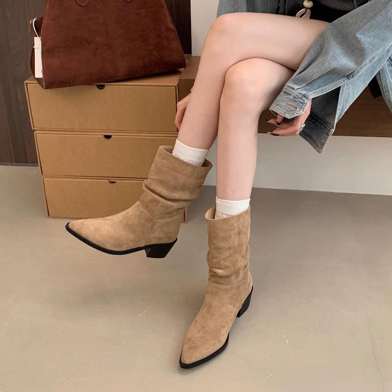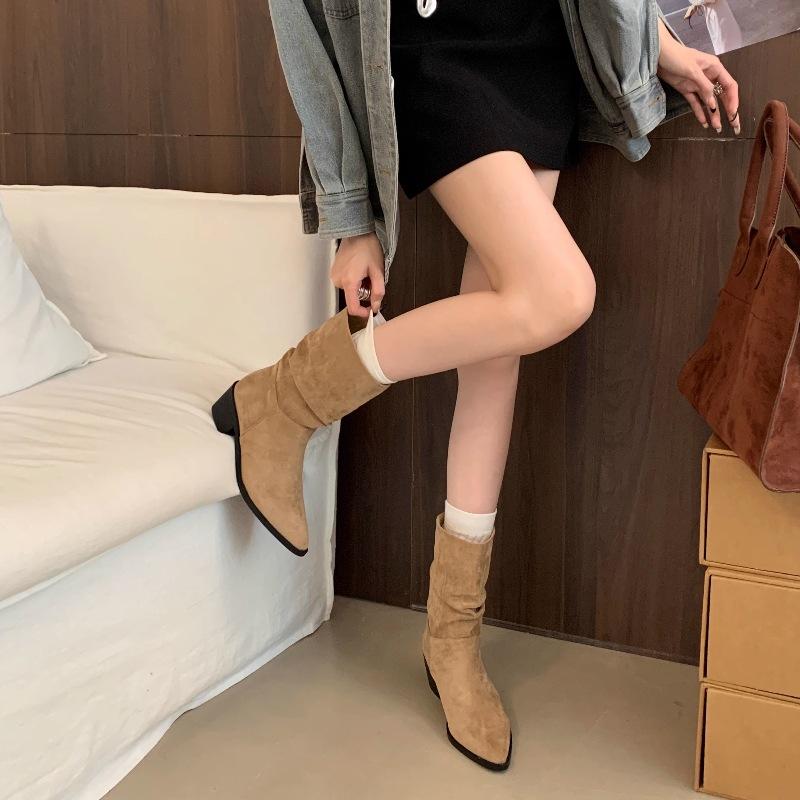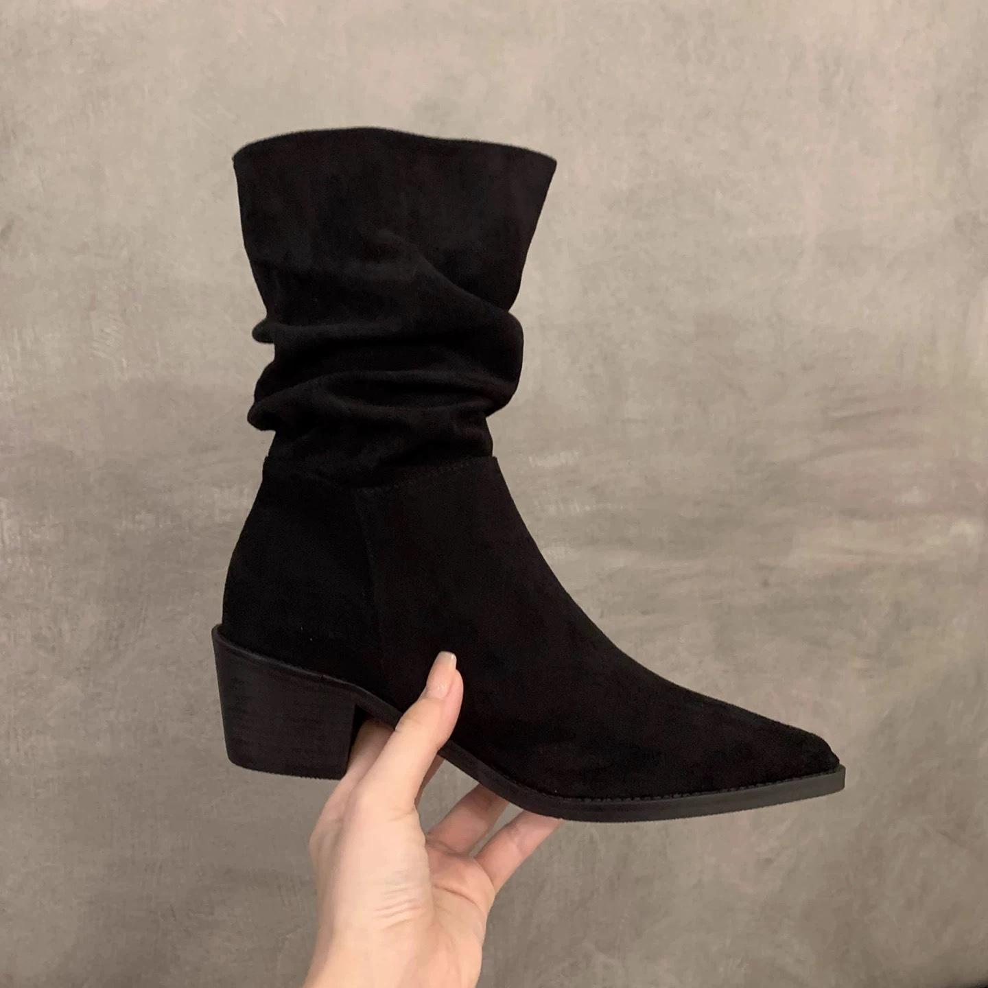 Botines de Estilo Francés Zapatos de Mujer Tacón Alto Grueso Punta Afilada Botines Ajustados Fruncidos 2025 Otoño/Invierno Nuevos Botines Apilados Botines