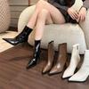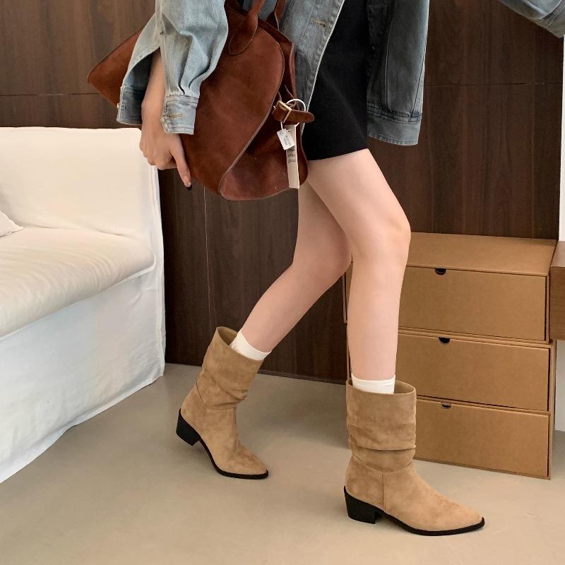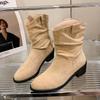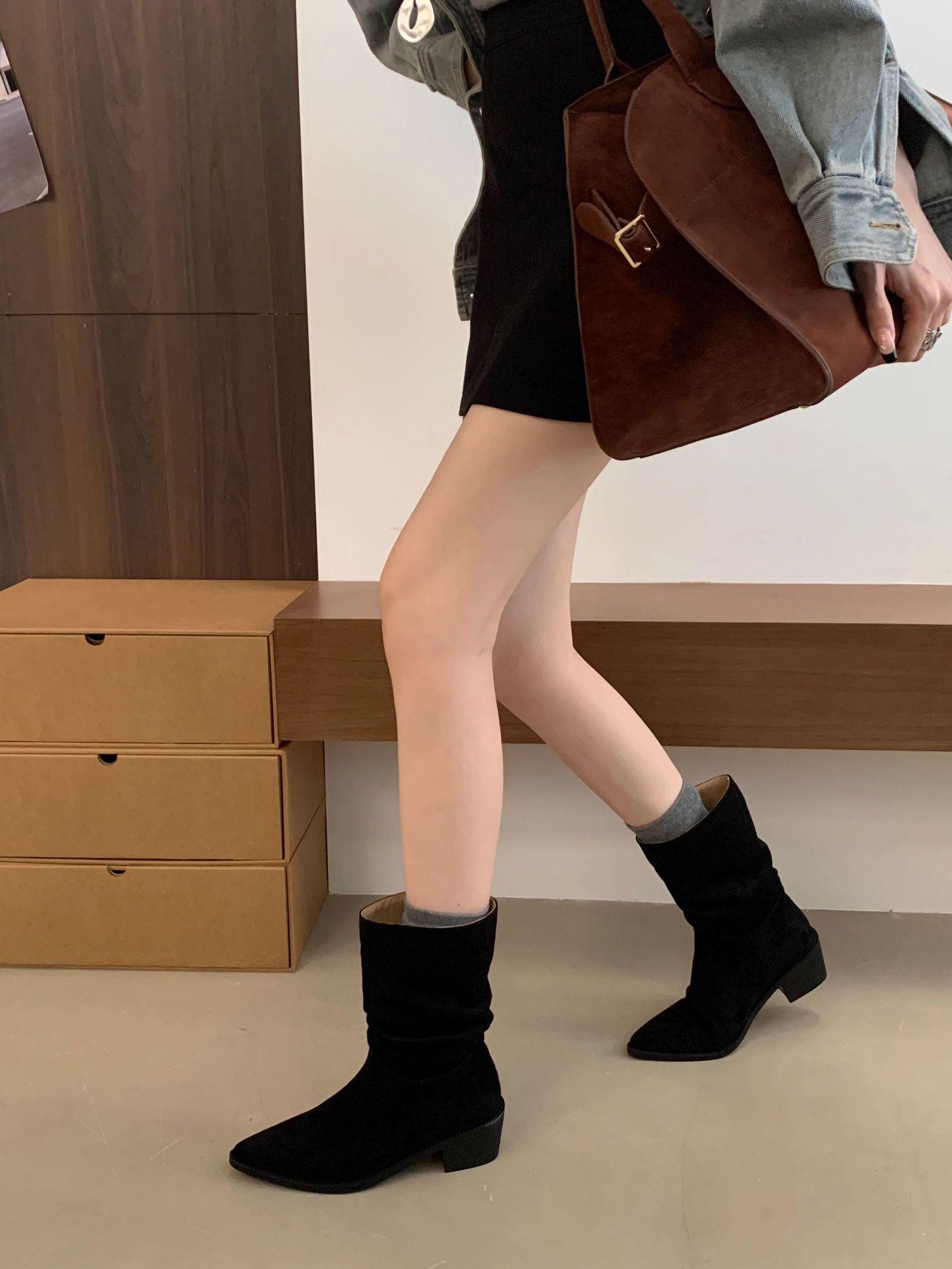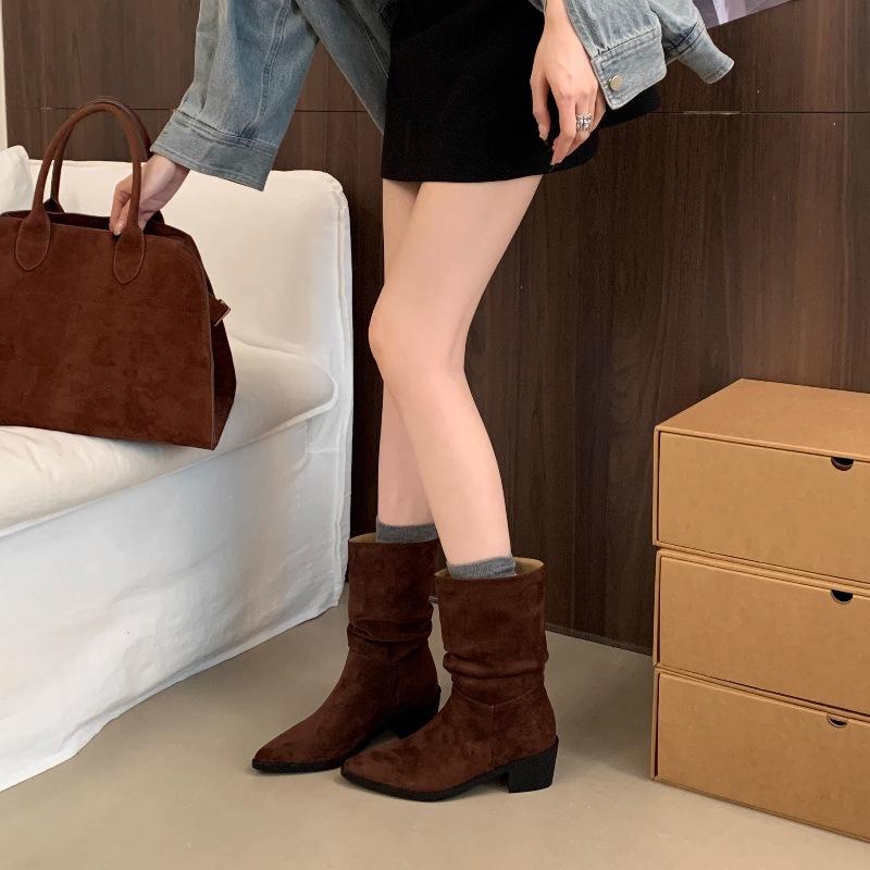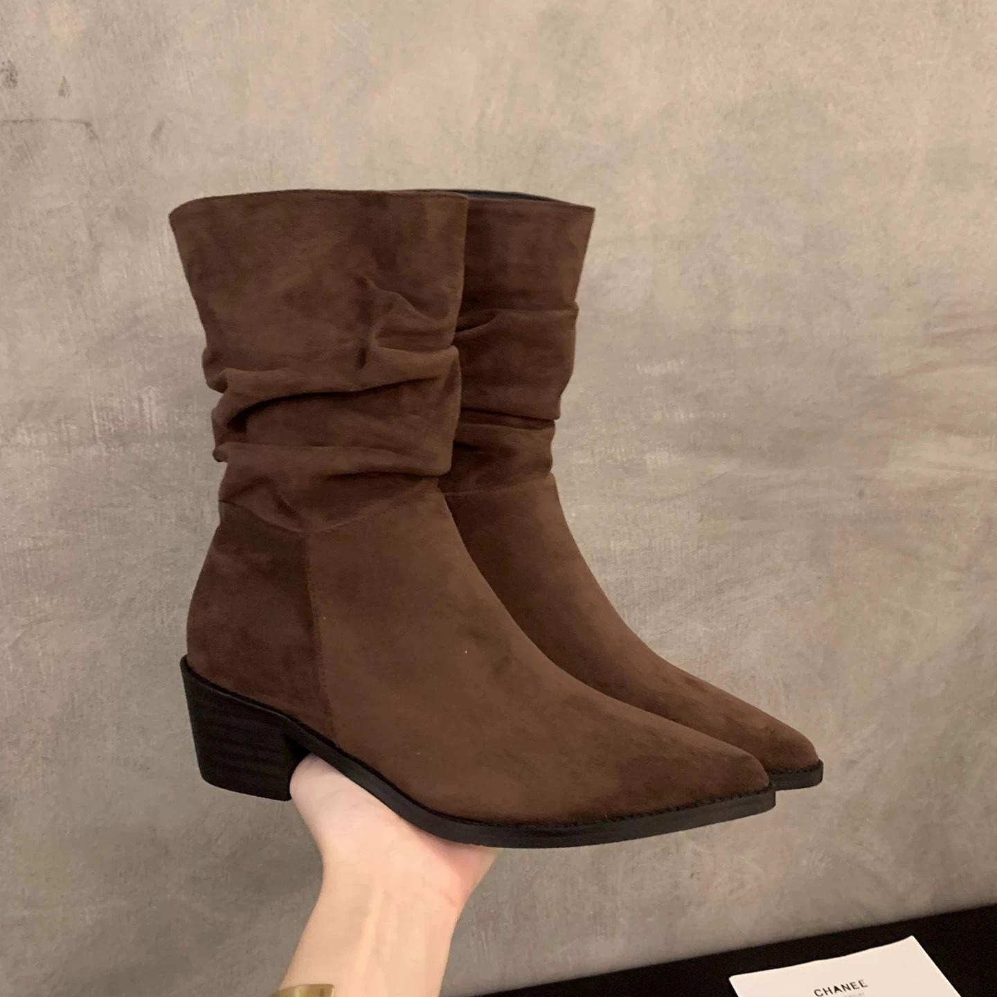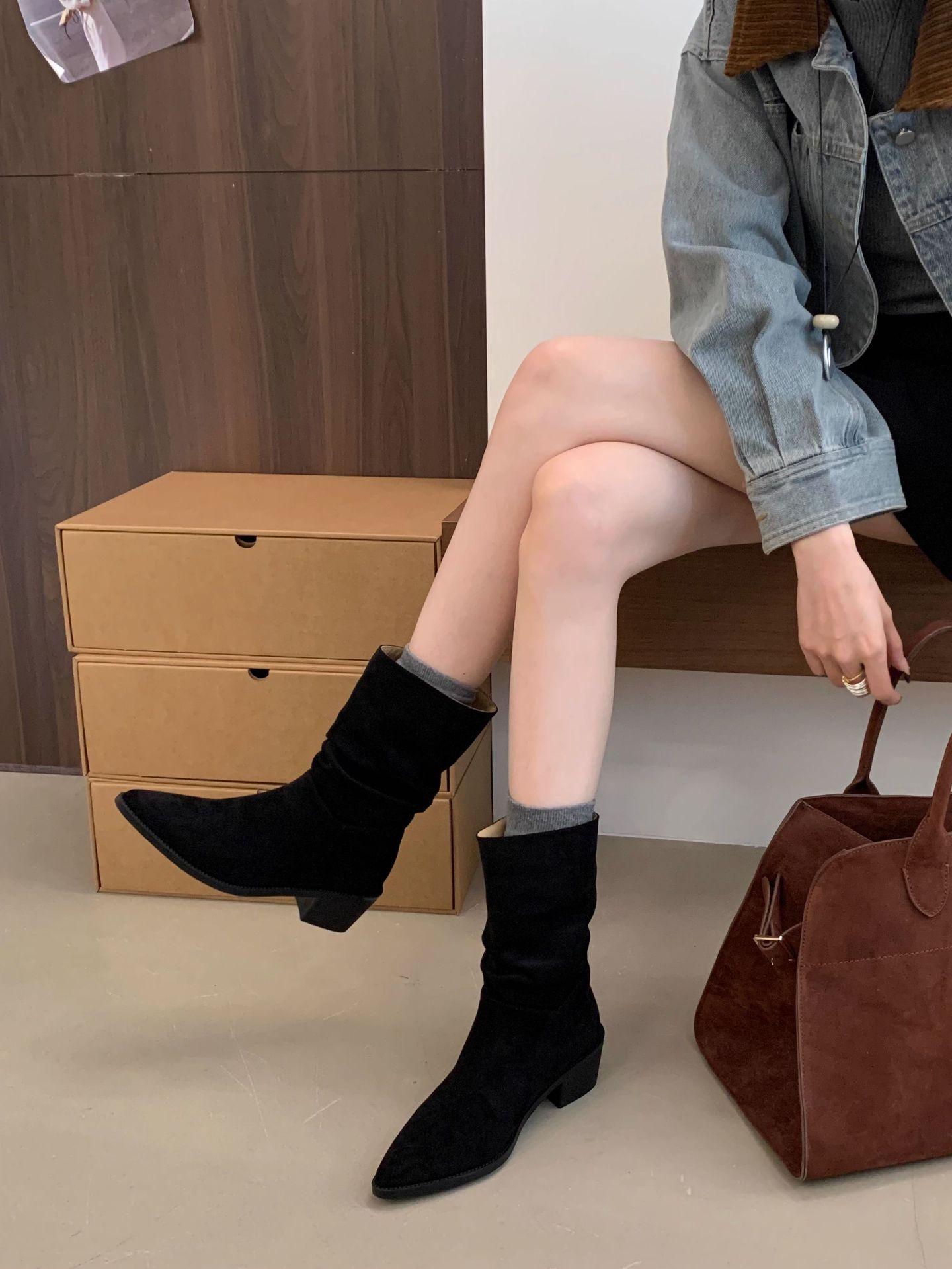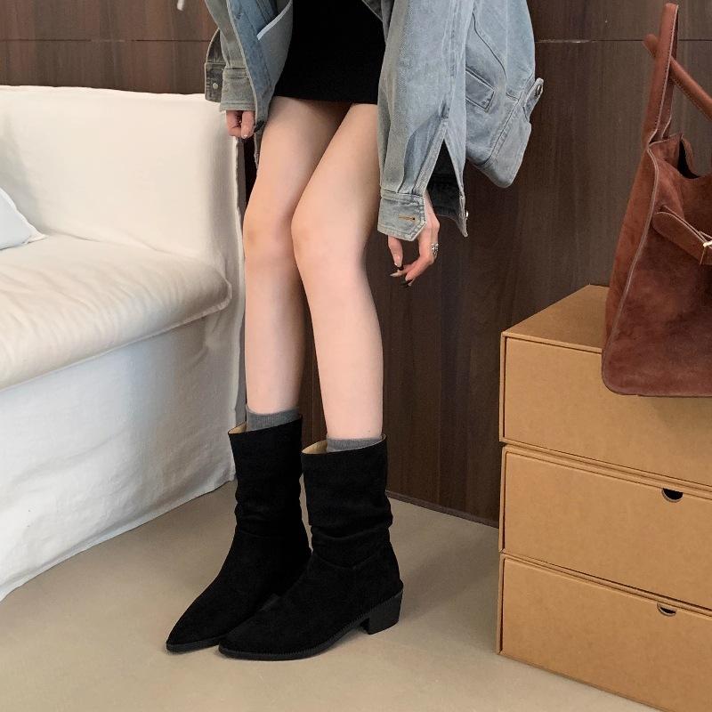 Botines de Estilo Francés Zapatos de Mujer Tacón Alto Grueso Punta Afilada Botines Ajustados Fruncidos 2025 Otoño/Invierno Nuevos Botines Apilados Botines