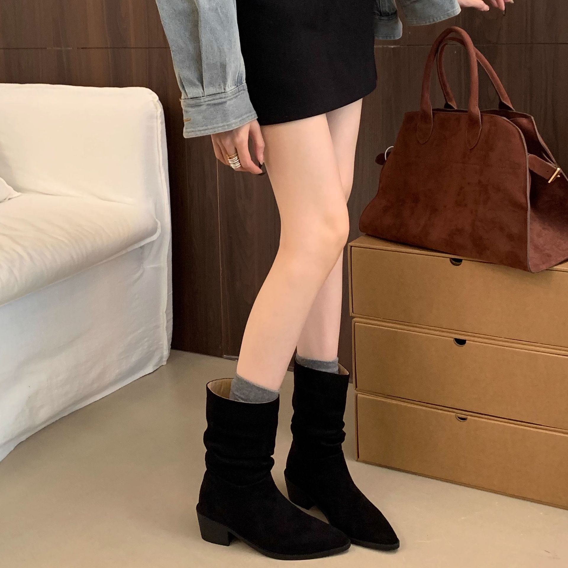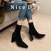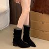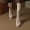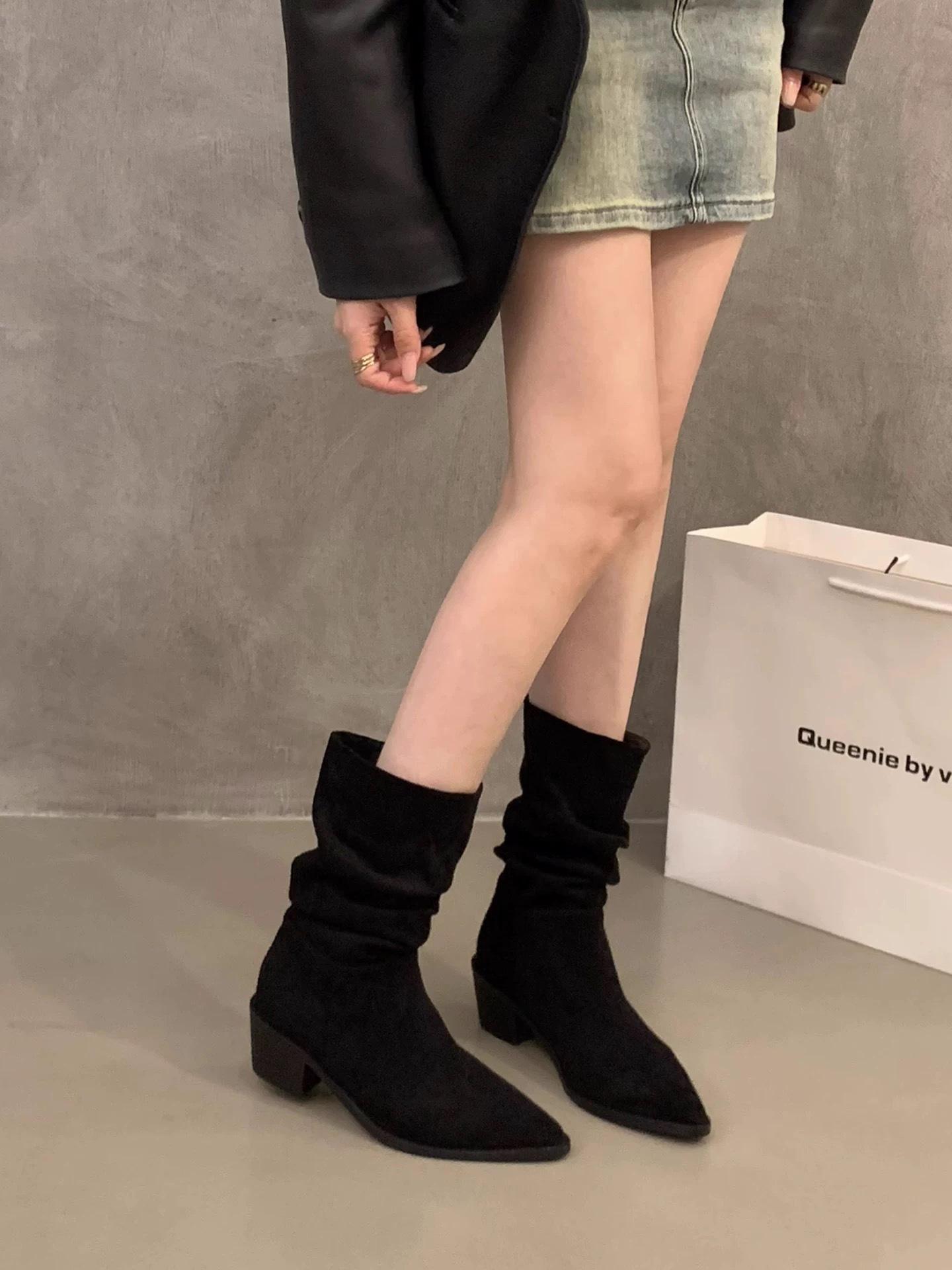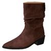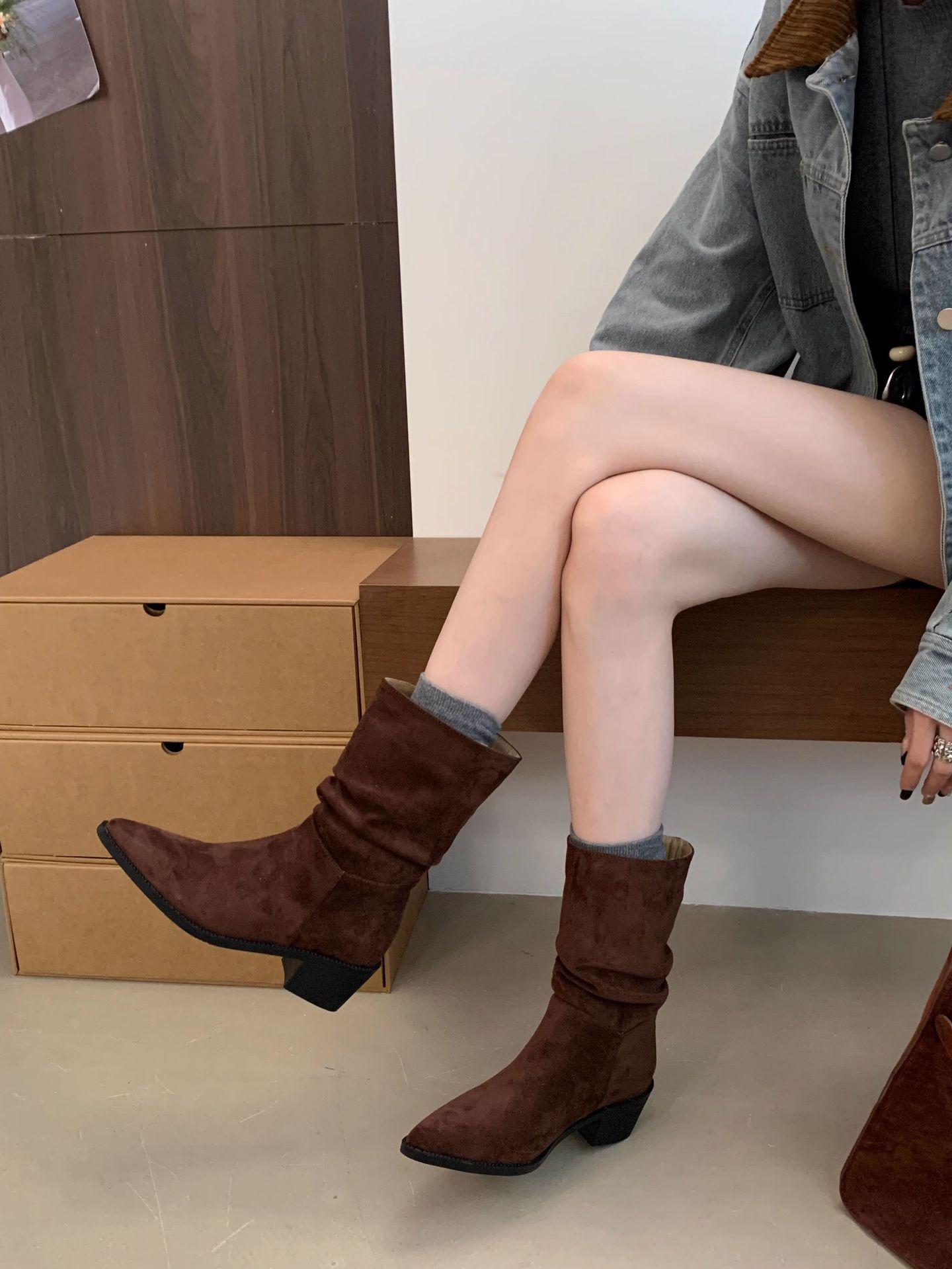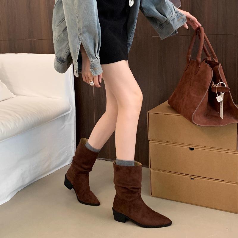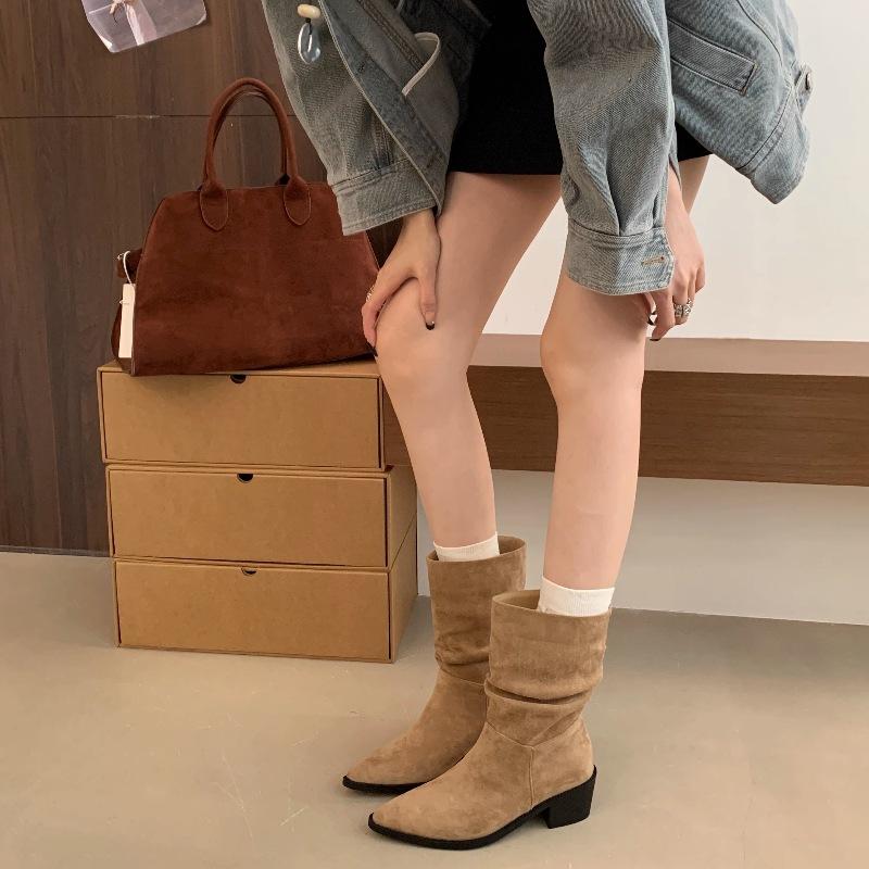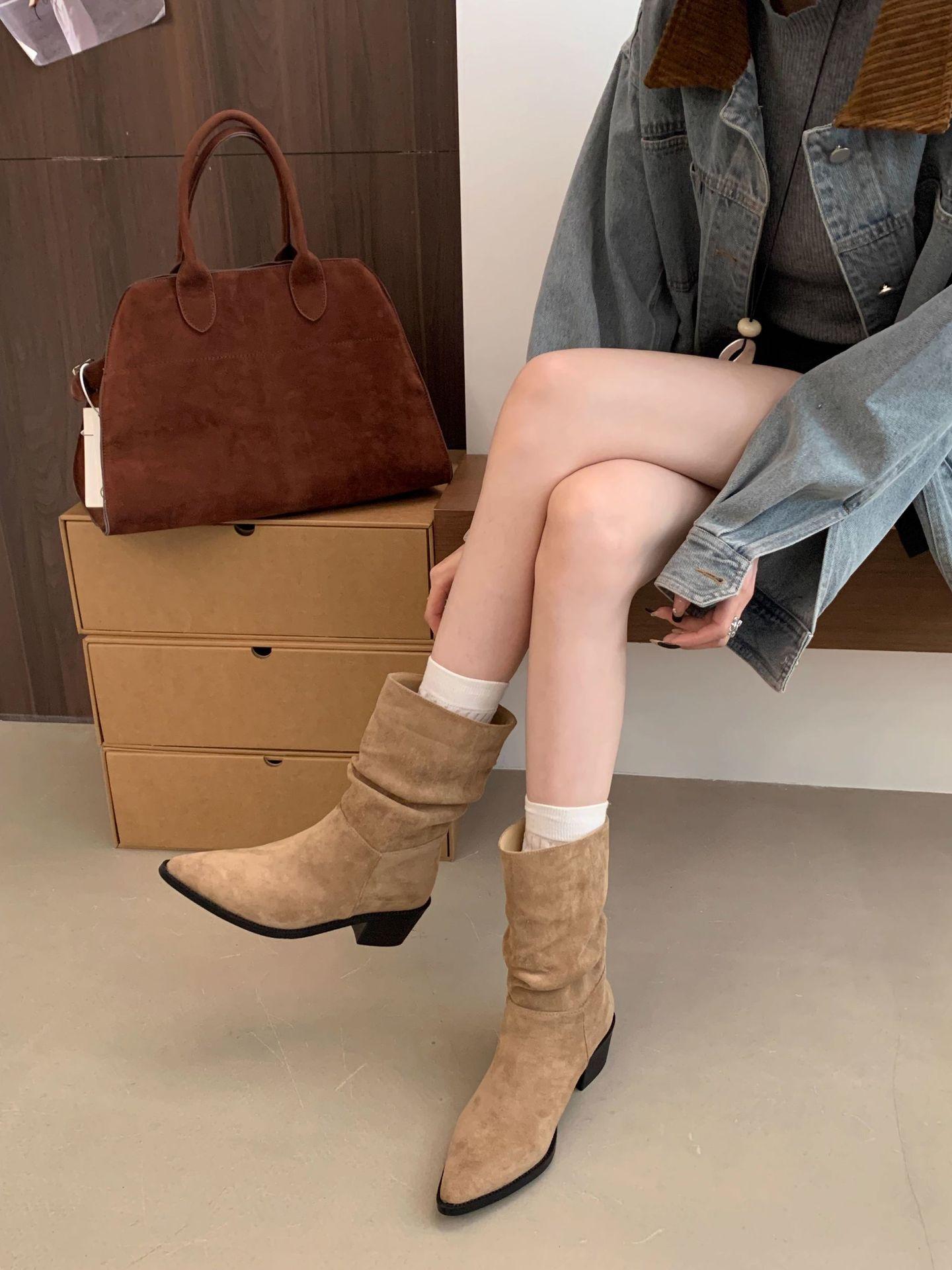Botines de Estilo Francés Zapatos de Mujer Tacón Alto Grueso Punta Afilada Botines Ajustados Fruncidos 2025 Otoño/Invierno Nuevos Botines Apilados Botines