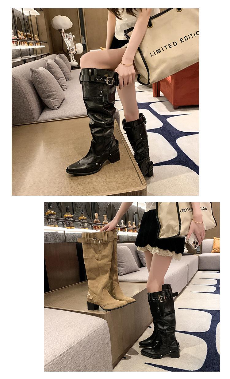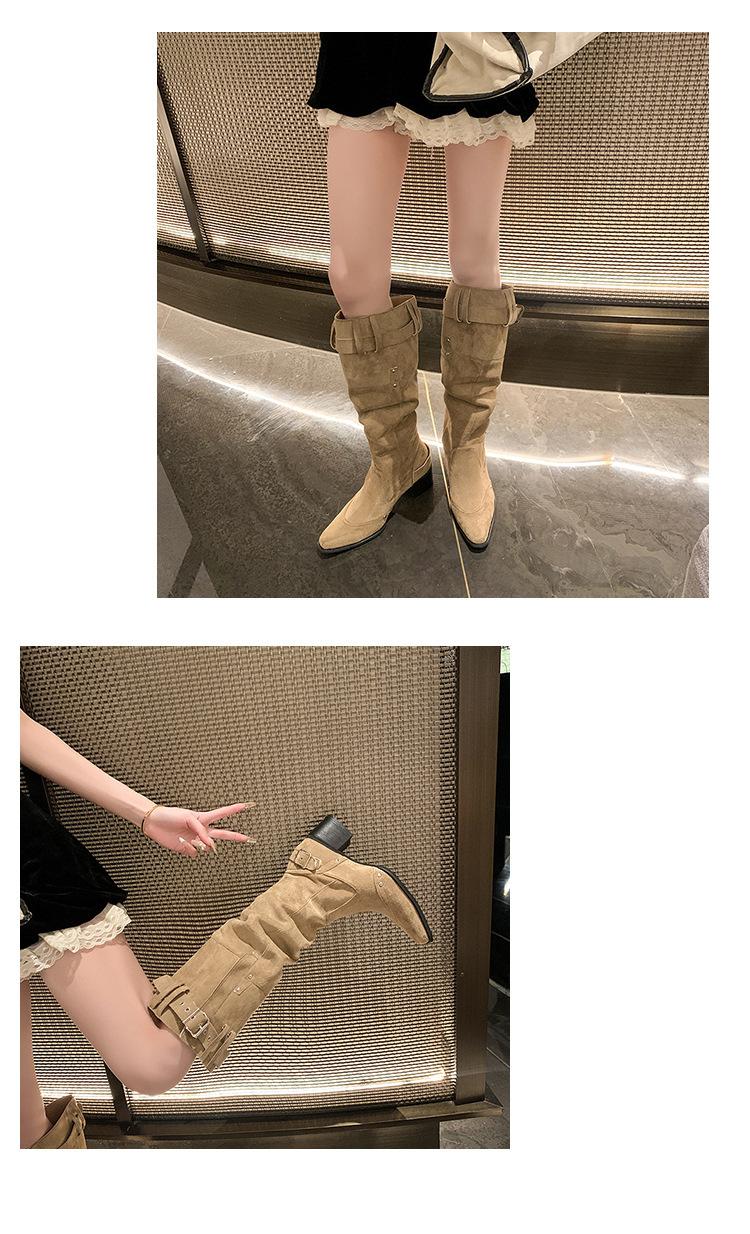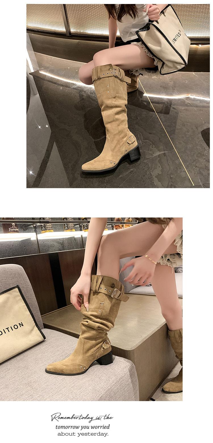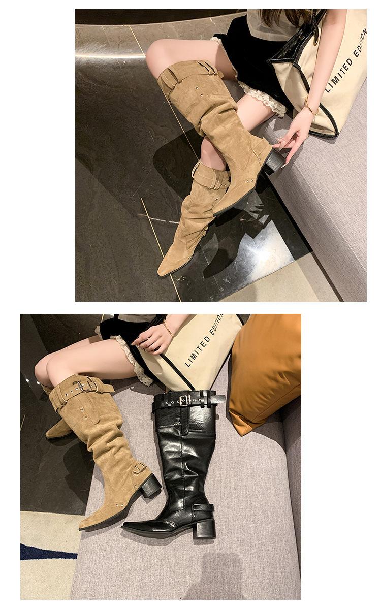 Botas Sobre la Rodilla para Mujer Primavera y Otoño 2025 Botas de Gamuza Color Albaricoque de Punta para Mujer Tacón Grueso Look Adelgazante Botas Plisadas