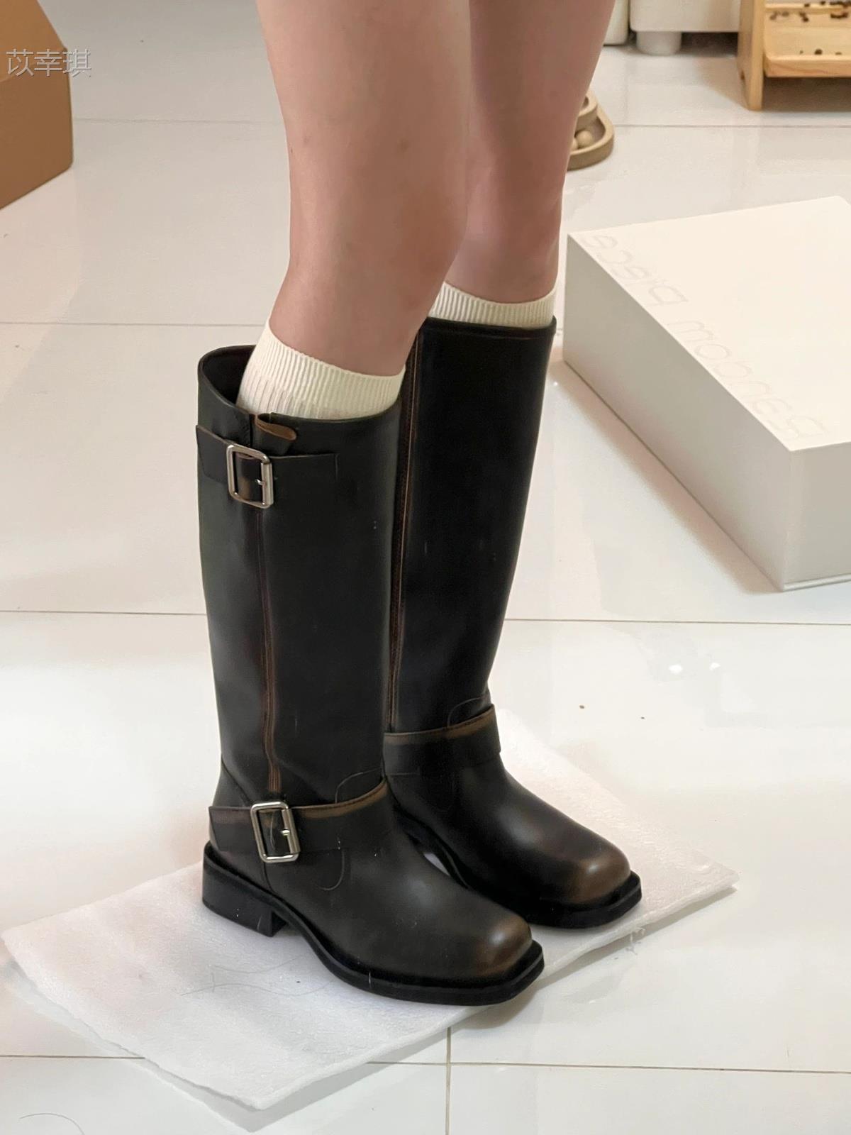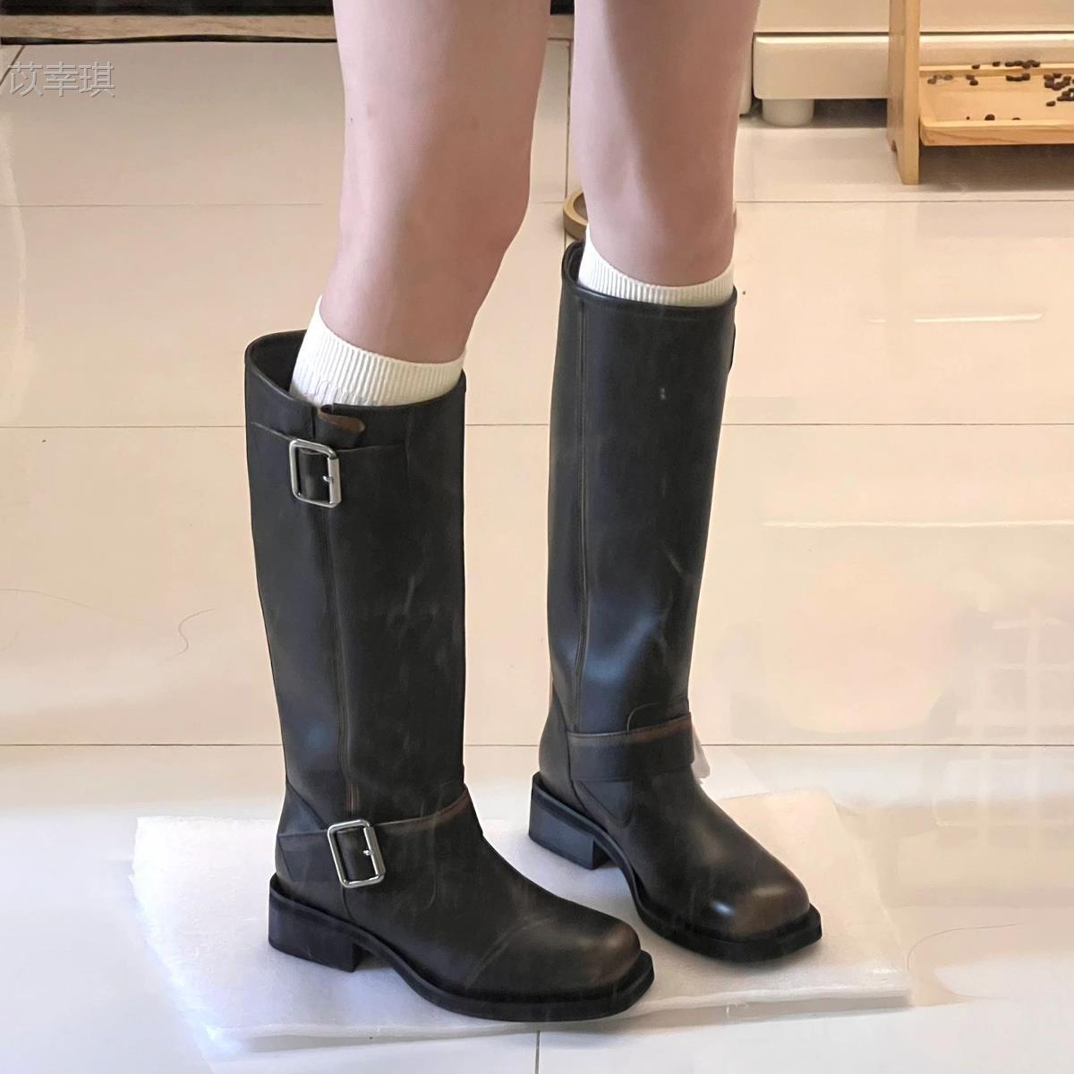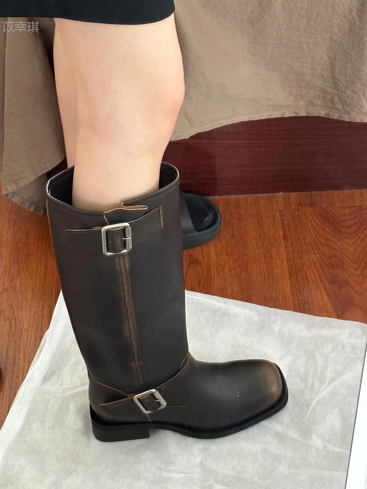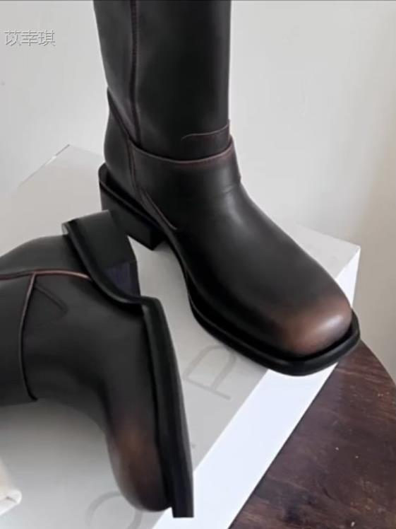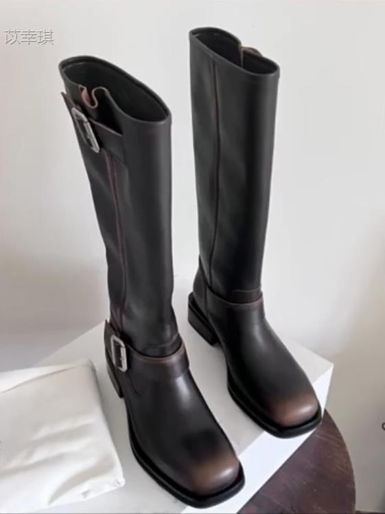 Versión de piel de vaca~Botas retro de tacón grueso de cuero genuino hasta la rodilla para mujer, circunferencia de pantorrilla grande, nicho de caña alta, botas de montar, pantorrilla ancha, botas largas ligeramente regordetas