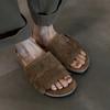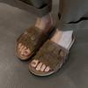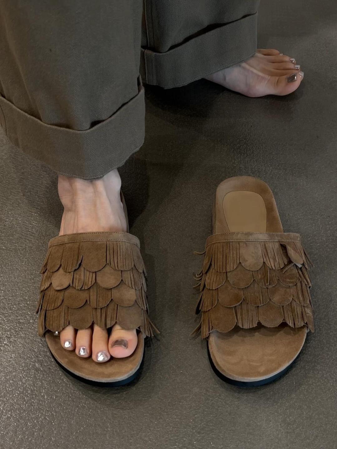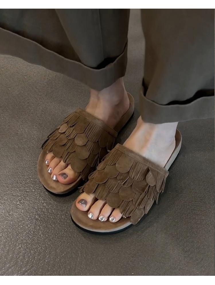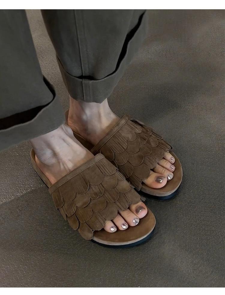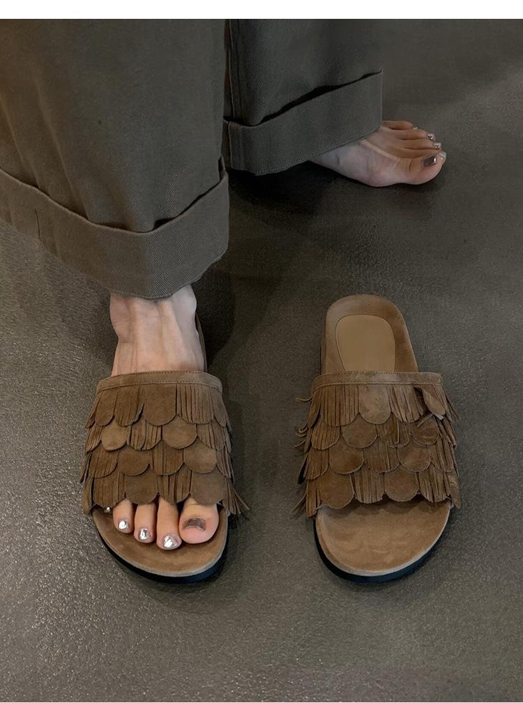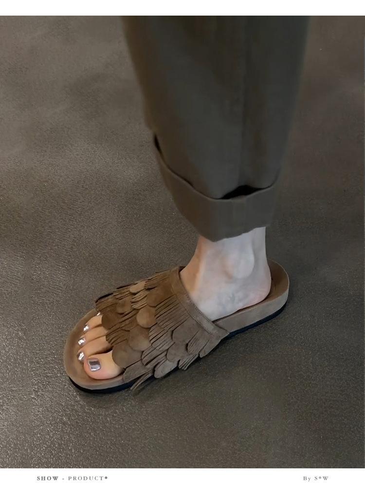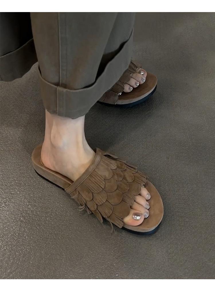 Sandalias de Playa Retro de Suela Gruesa para Mujer con Borlas, Planas, de Punta Redonda, Punta Abierta, Diapositivas de Una Tira