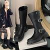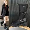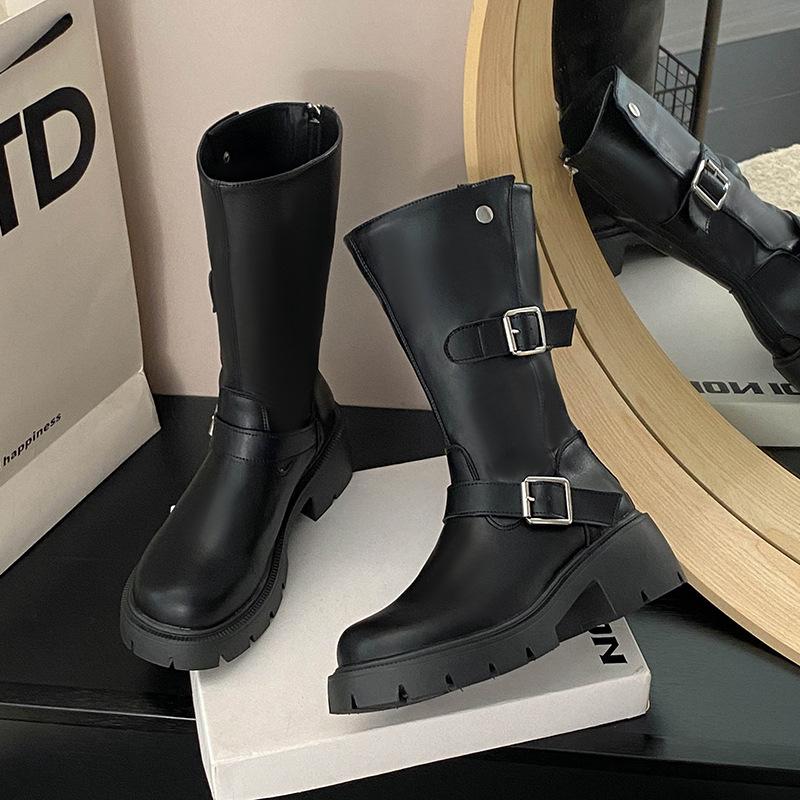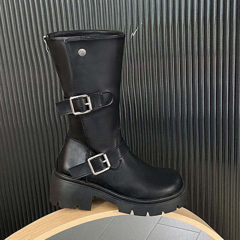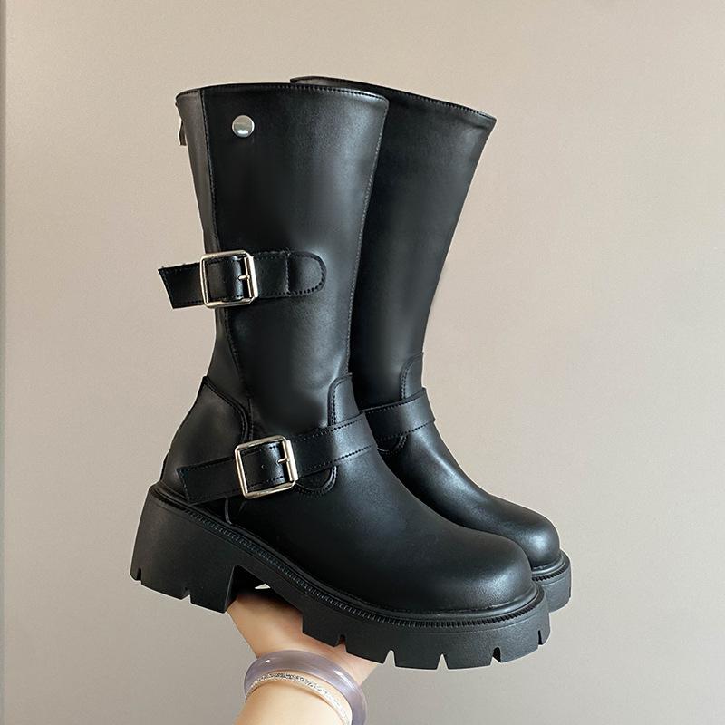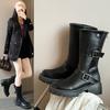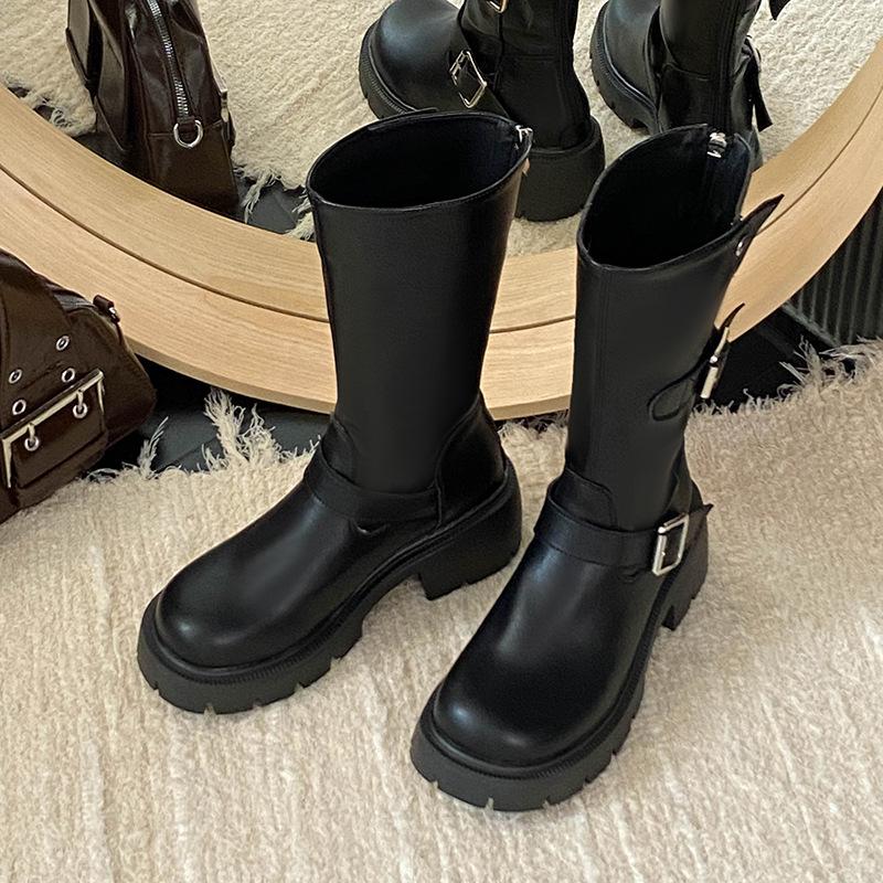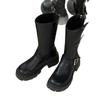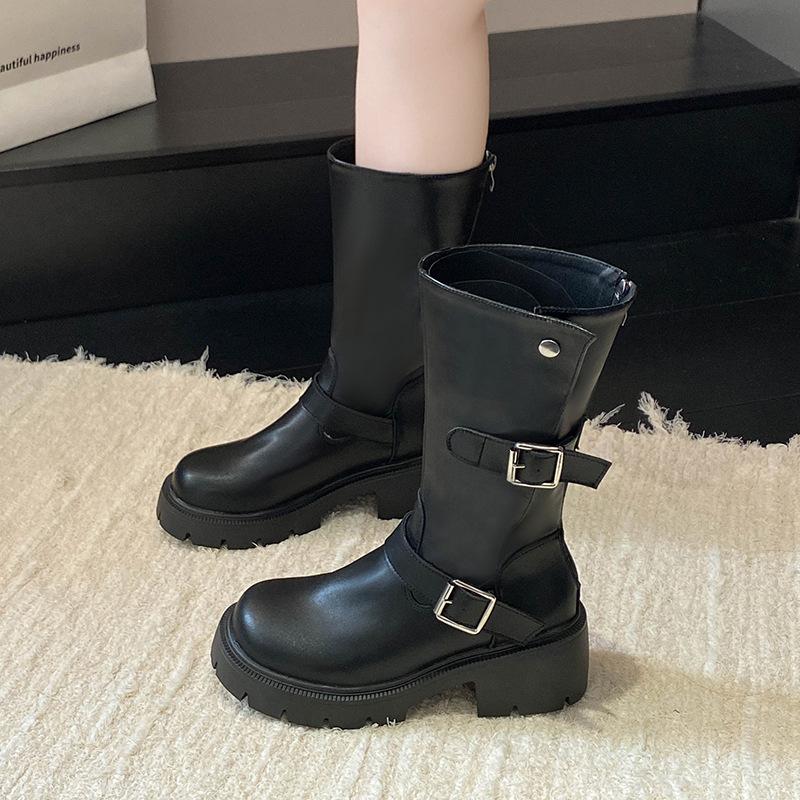 Invierno 2025 Nuevo Negro Retro Punta Redonda Suela Gruesa Tacón Chunky Botas de Media Caña para Mujer Diario Casual Botas de Cuero PU