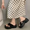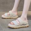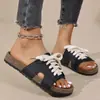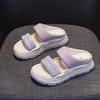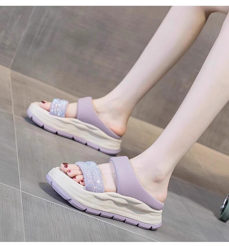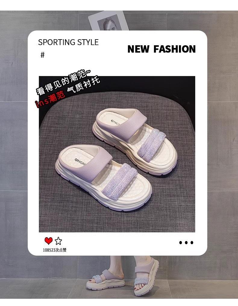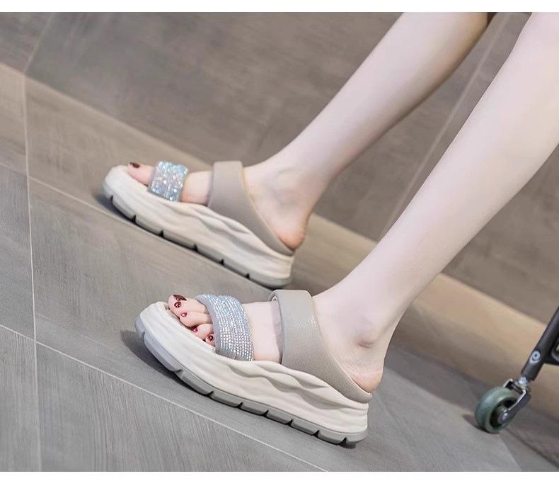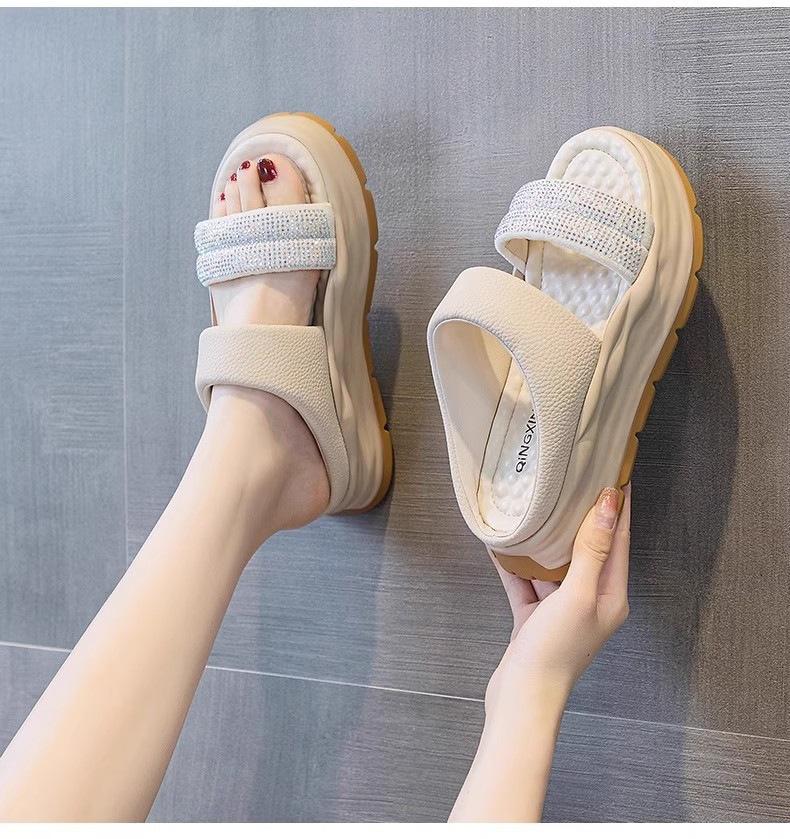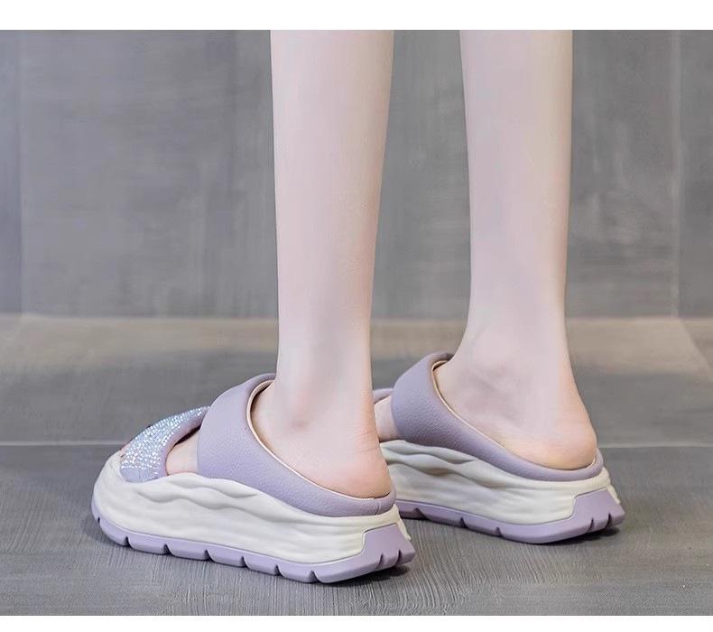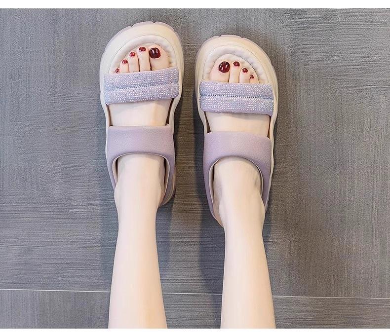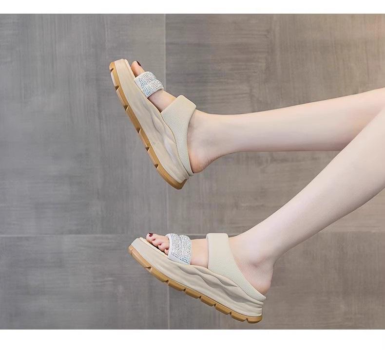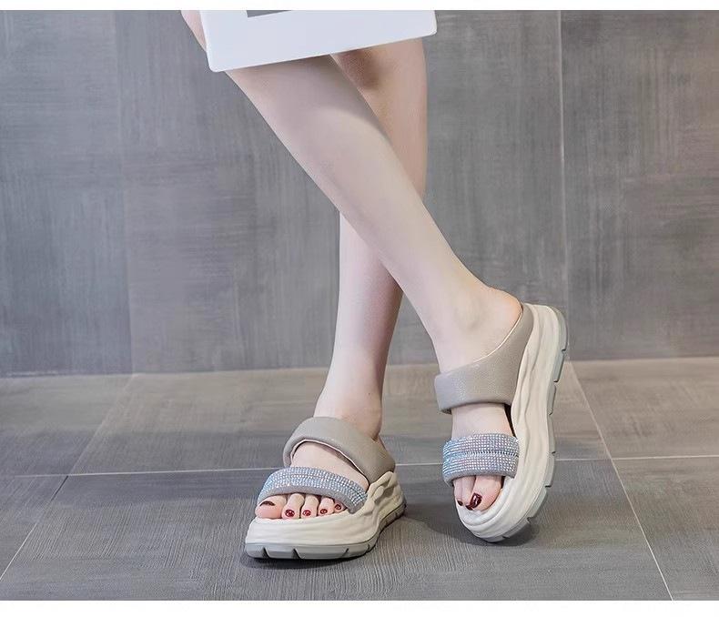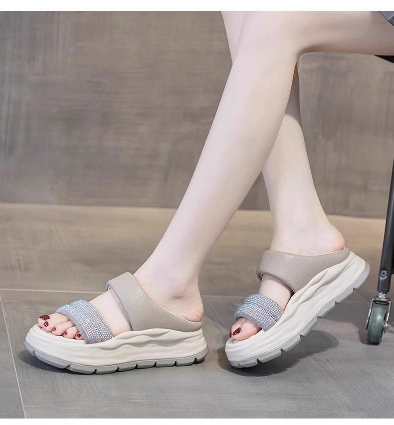 Verano Nuevas Zapatillas de Cuero Suave para Mujer para Exterior Verano Zapatillas de Una Palabra Cómodas Casuales a la Moda Suela Gruesa Pedrería Sandalias de Punta Abierta