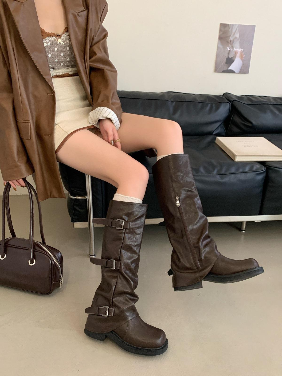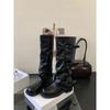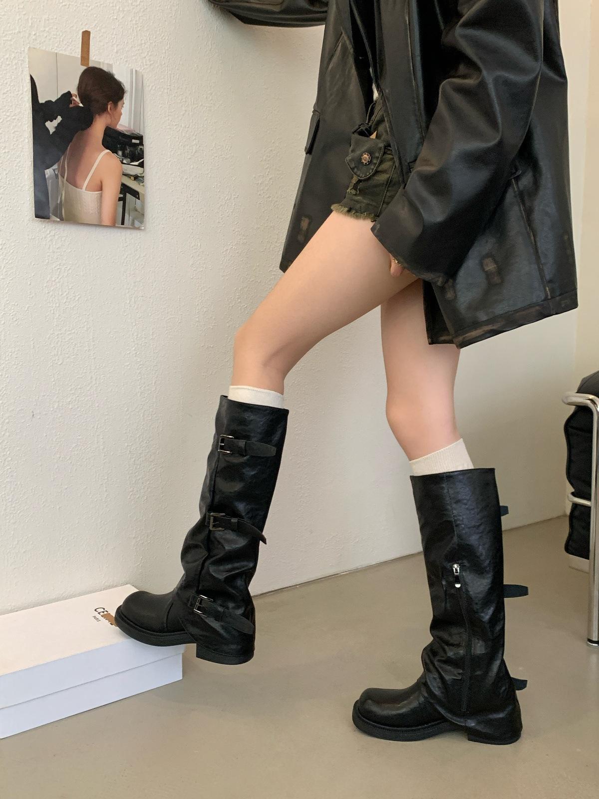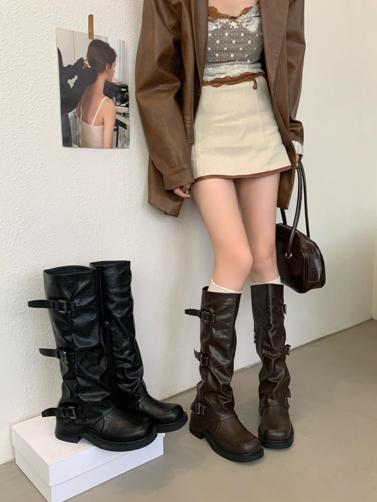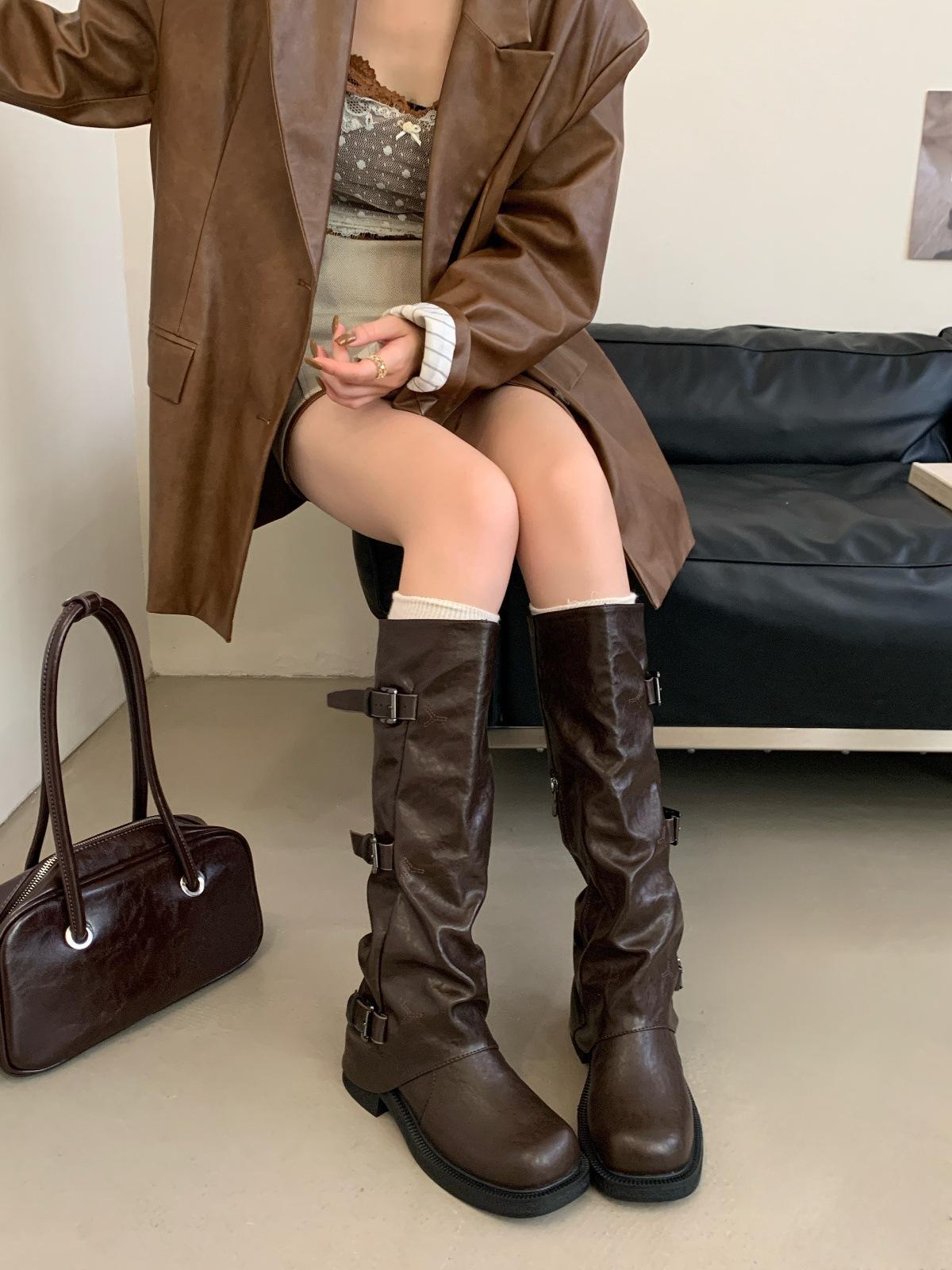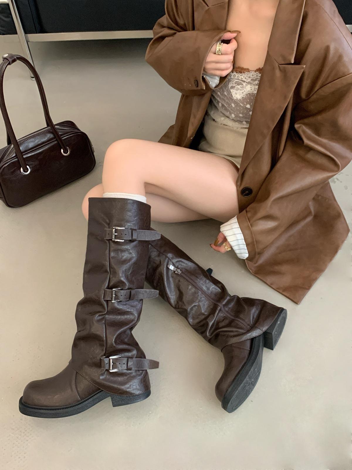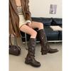 Botas altas hasta la rodilla fruncidas con hebilla de tacón grueso francés y tacón grueso 2025 Nuevas Botas de pierna apilada de chica dulce, genial y picante Botas de caballero