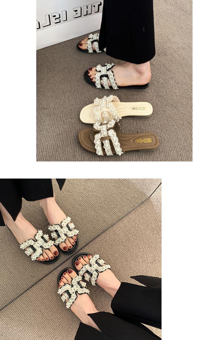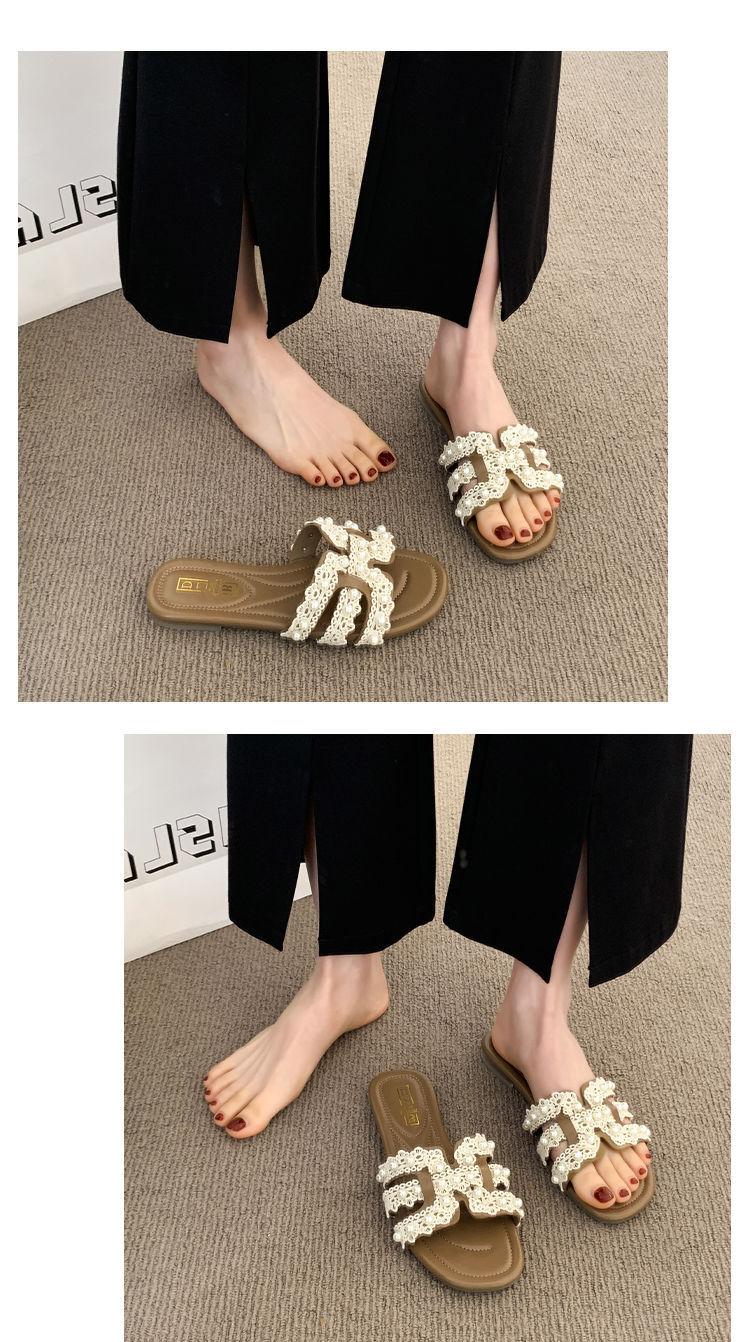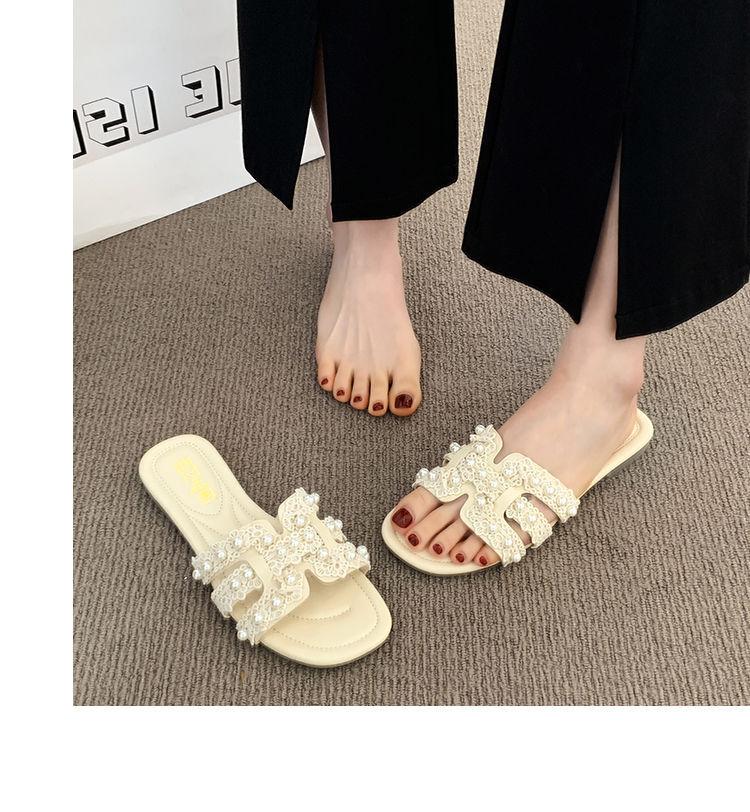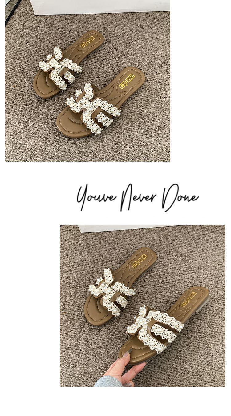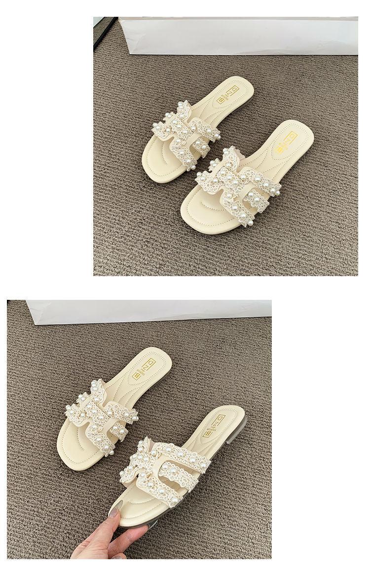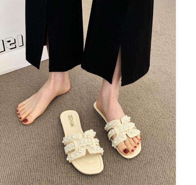 Pantuflas planas cómodas para el hogar Verano Nuevo Estilo de hada francés Elegantes Perlas Playa Una tira Pantuflas perezosas