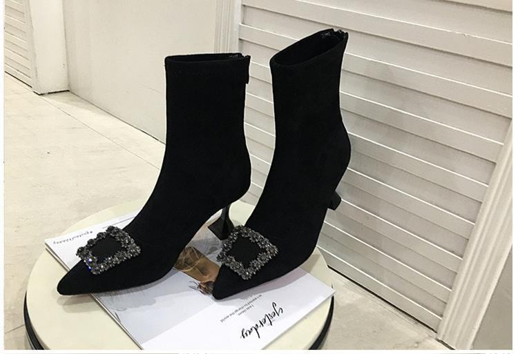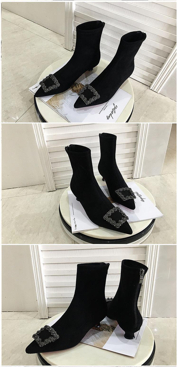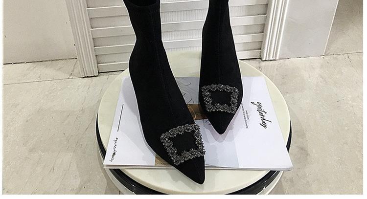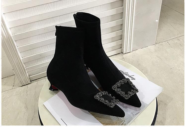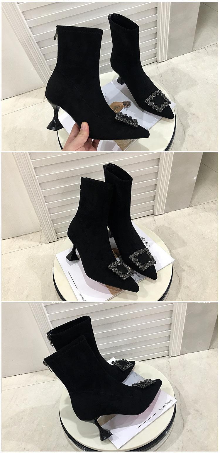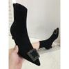 Botas negras mujer 2022 otoño pedrería puntiagudas tacones altos hebilla cuadrada botas elásticas talla grande botas cortas tacón bajo botas ajustadas