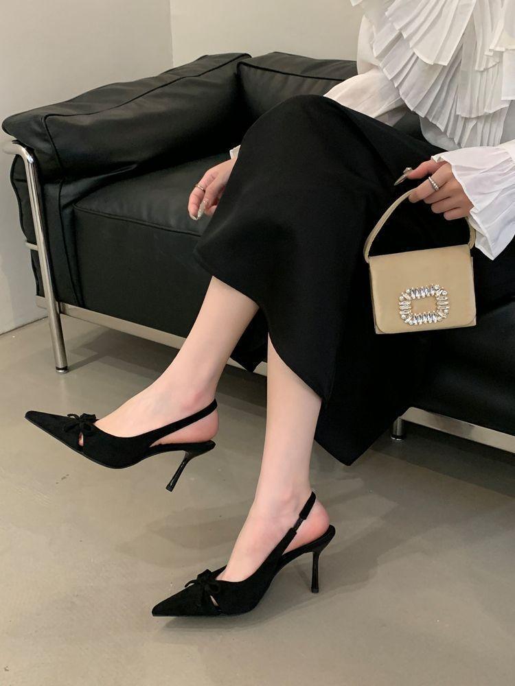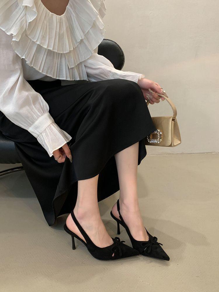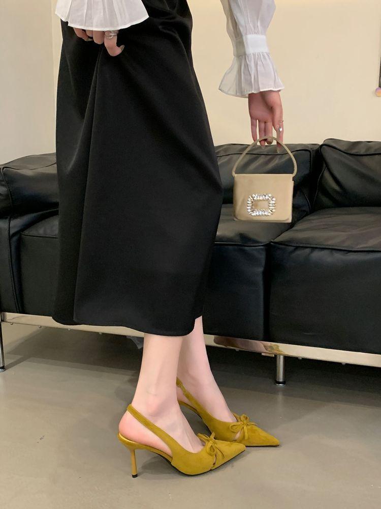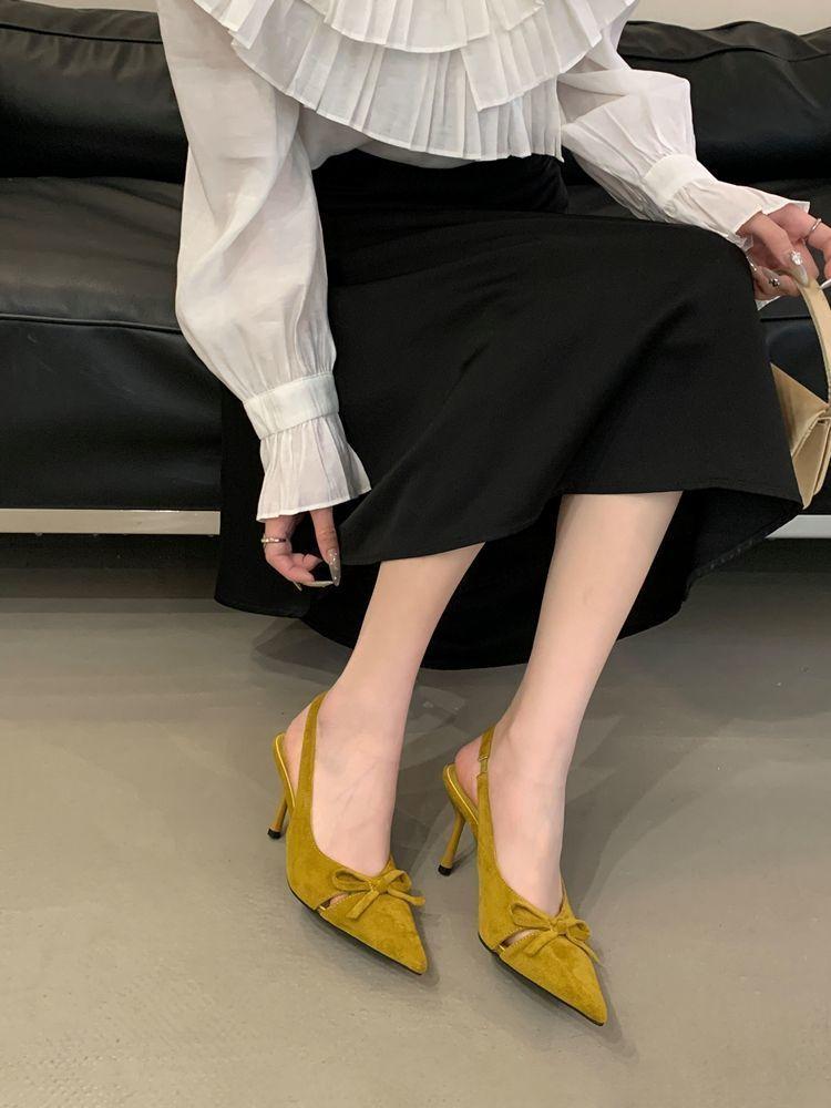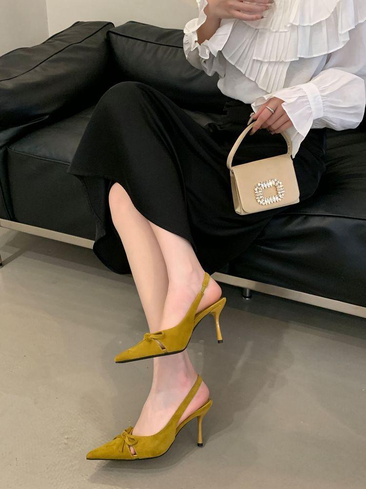 Primavera/Verano 2025 Nuevos Tacones Altos Nicho Estilo Hada Sandalias de Punta Cerrada para Mujer Tacón de Aguja de Punta Zapatos Individuales con Lazo para Mujer