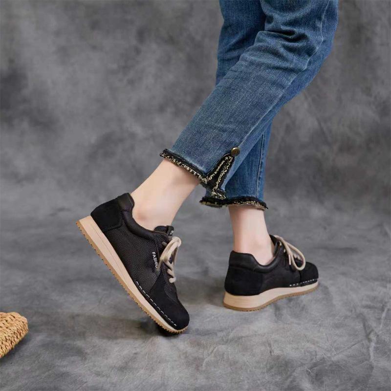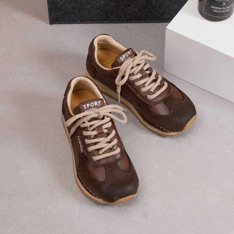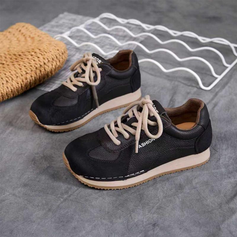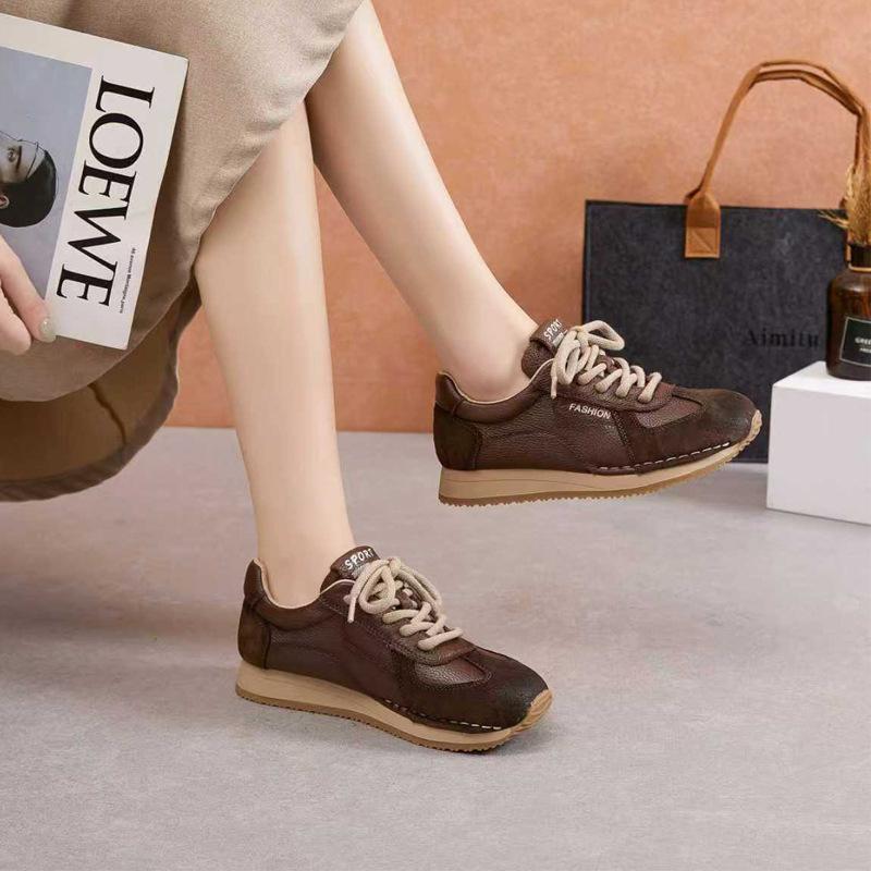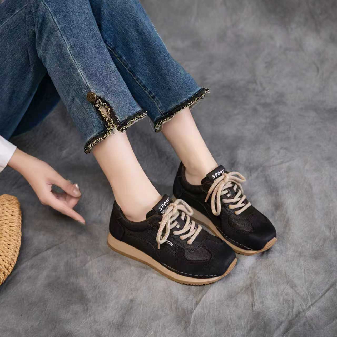 2025 Primavera Nuevo Cuero Genuino Plataforma Suela Gruesa Zapatos de Punta Redonda para Mujer Mamá Zapatos Individuales de Capa Superior de Piel de Vaca Zapatos Casuales Deportivos Retro