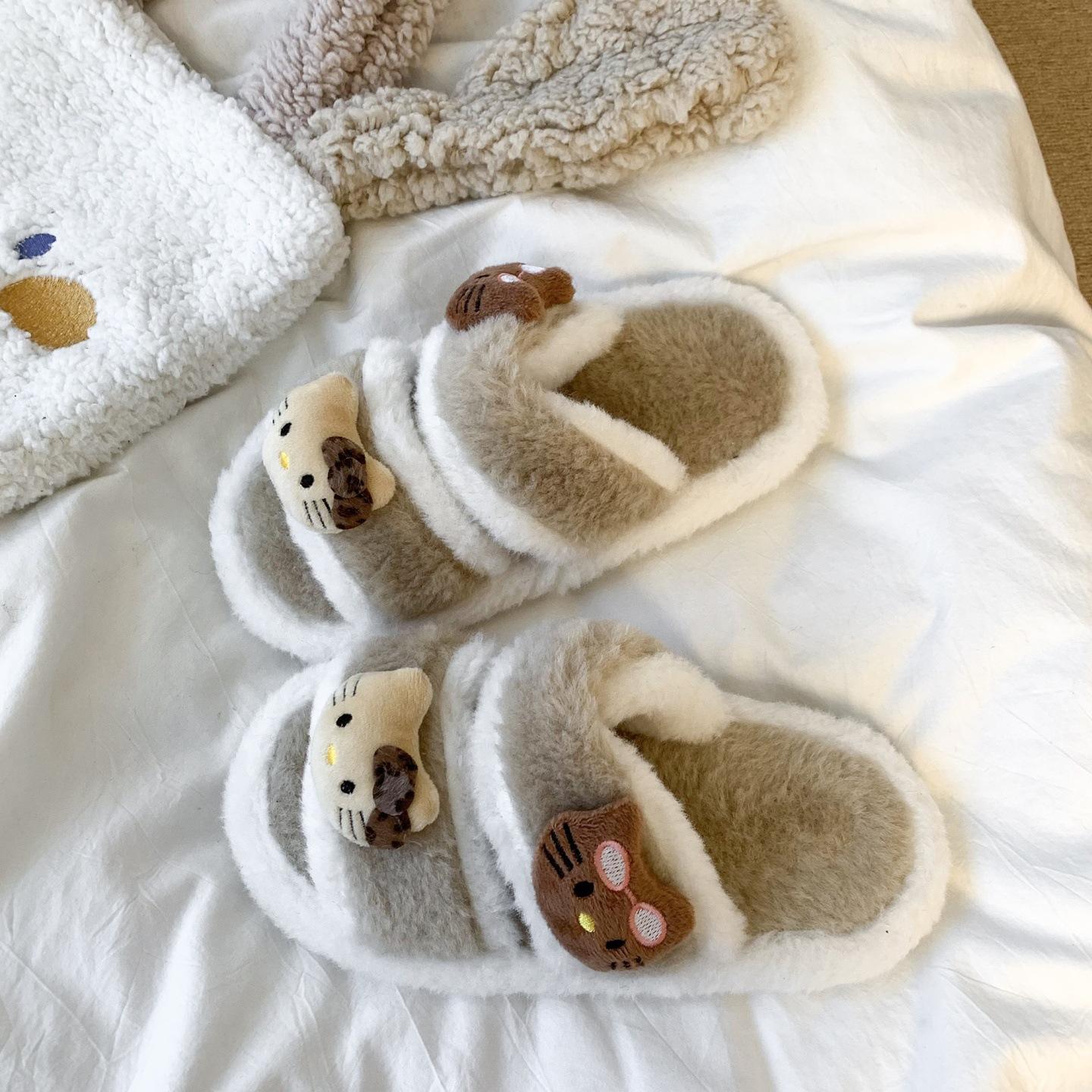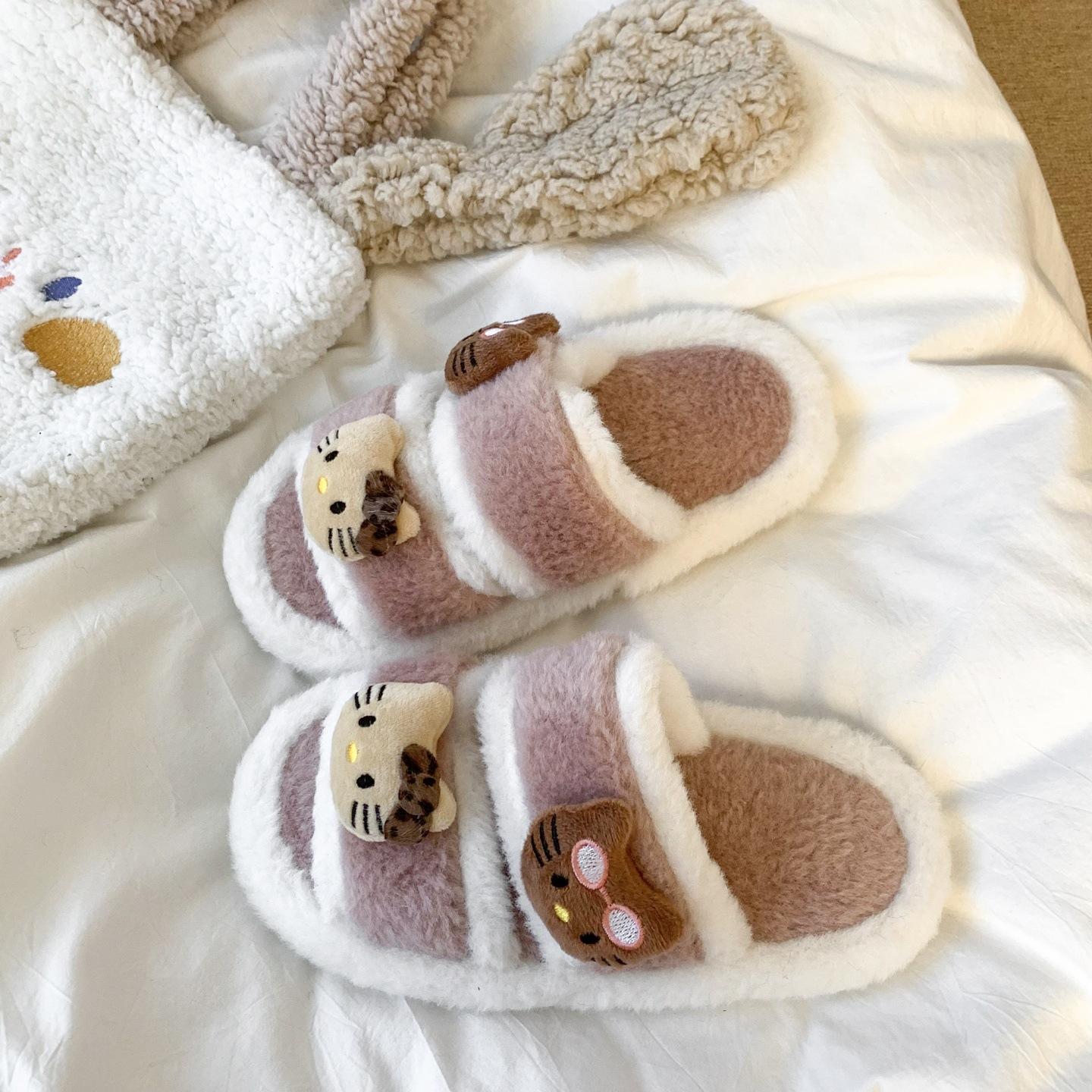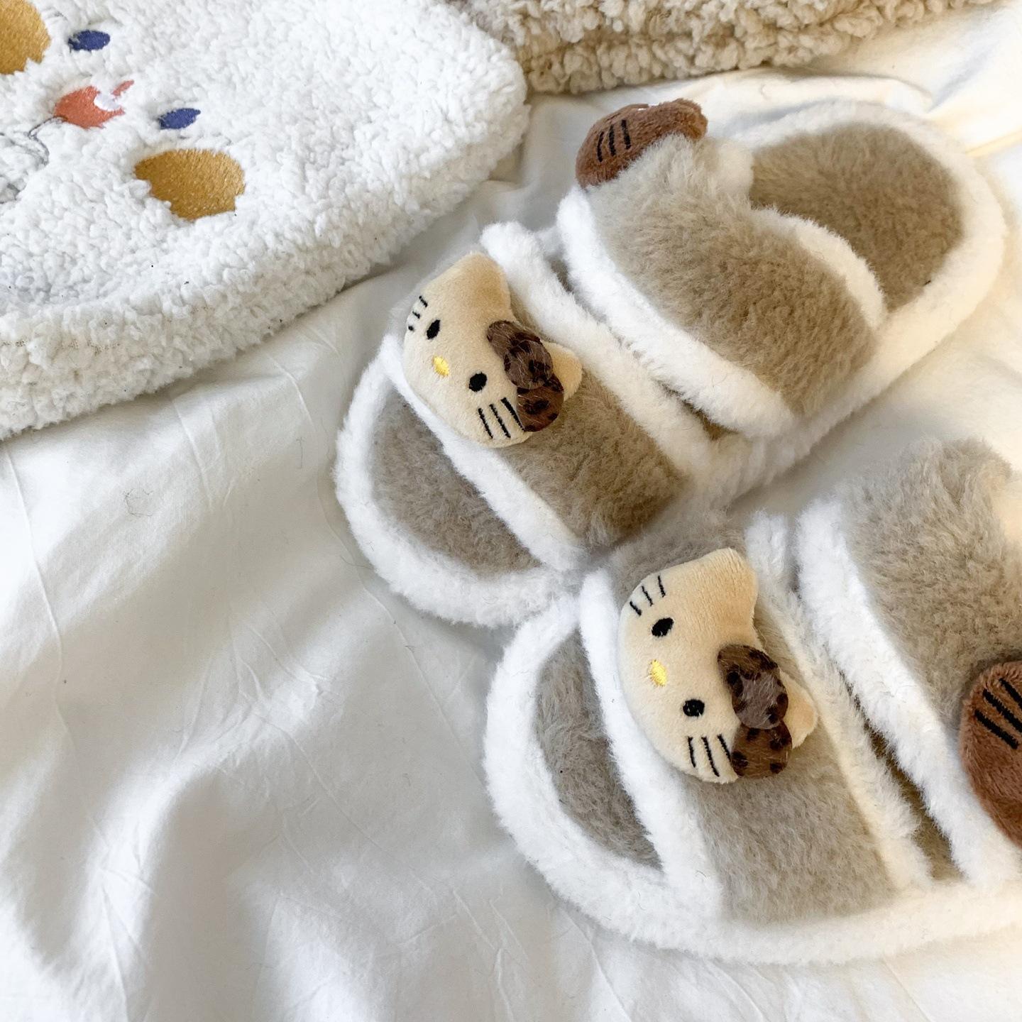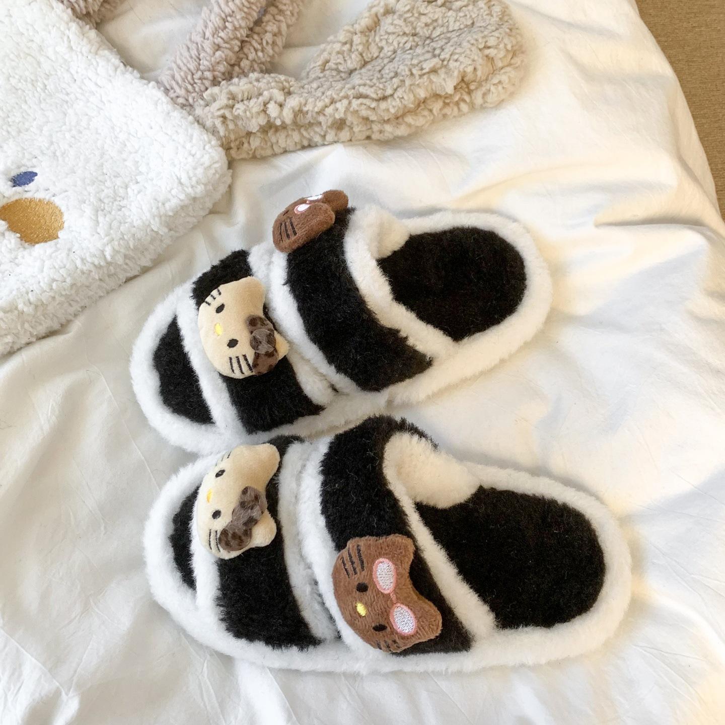 Zapatillas peludas casuales versátiles con sensación de pisar mierda para mujer 2025 otoño e invierno nuevas lindas zapatillas de algodón de felpa con gatito de dibujos animados