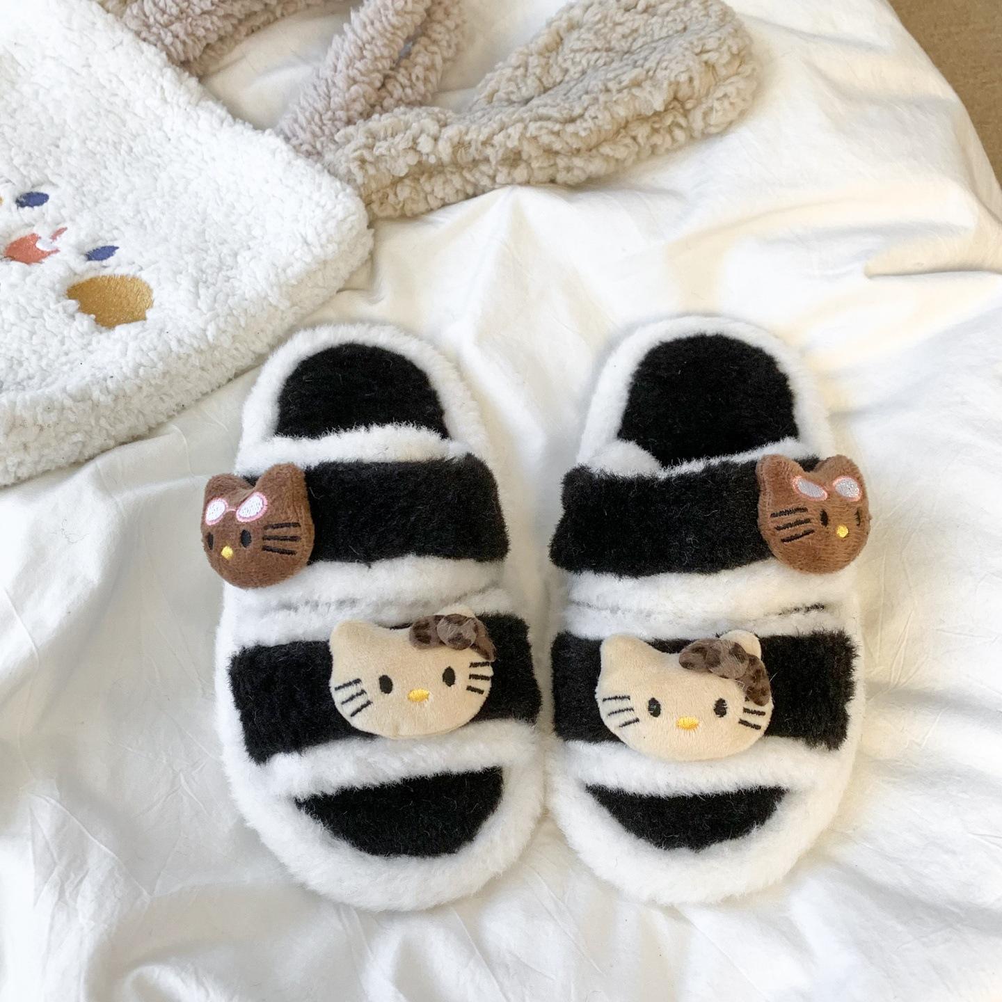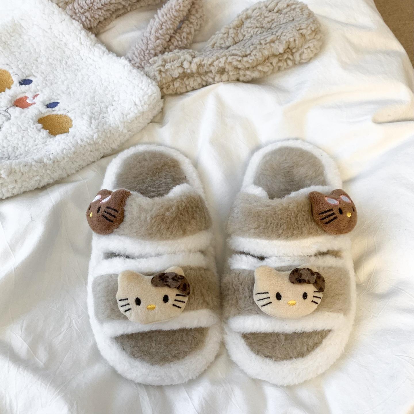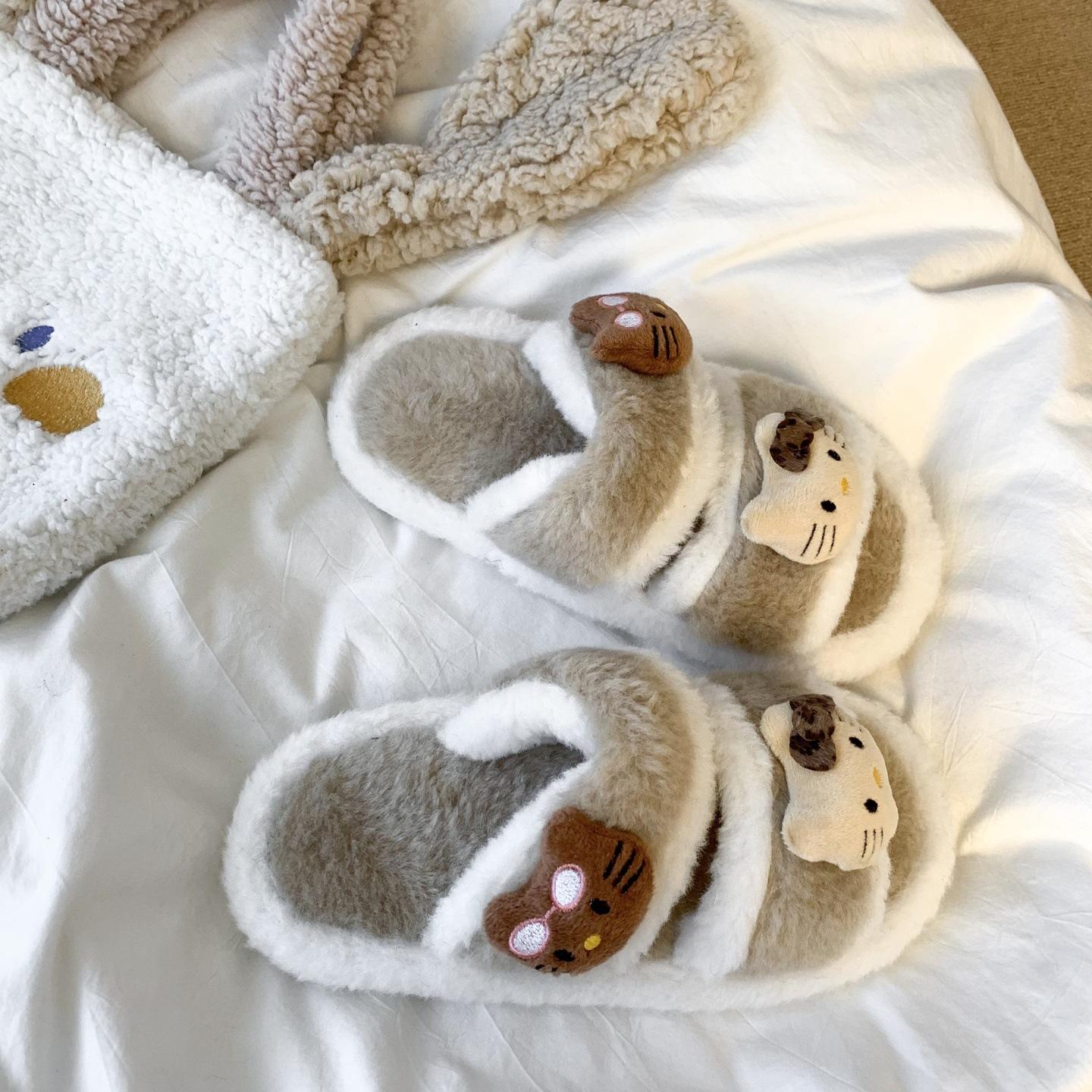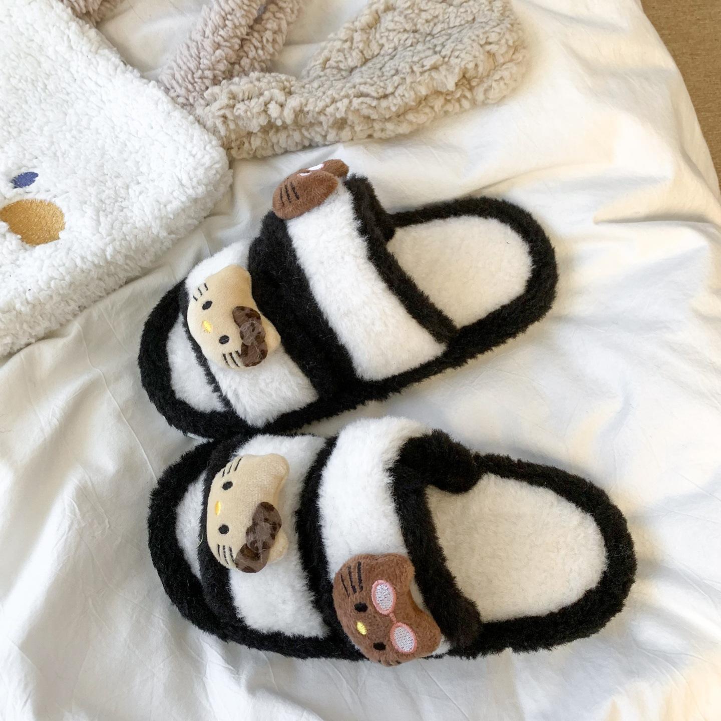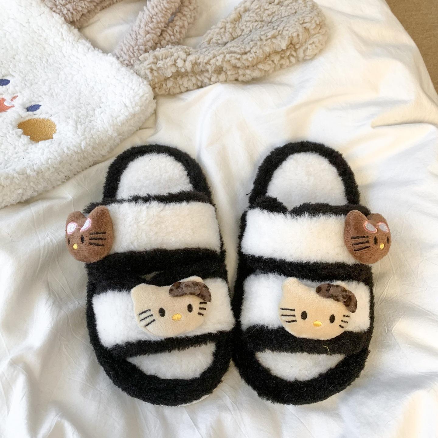 Zapatillas peludas casuales versátiles con sensación de pisar mierda para mujer 2025 otoño e invierno nuevas lindas zapatillas de algodón de felpa con gatito de dibujos animados