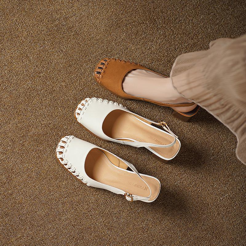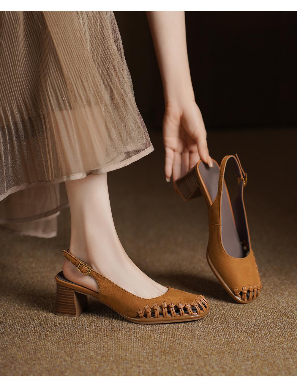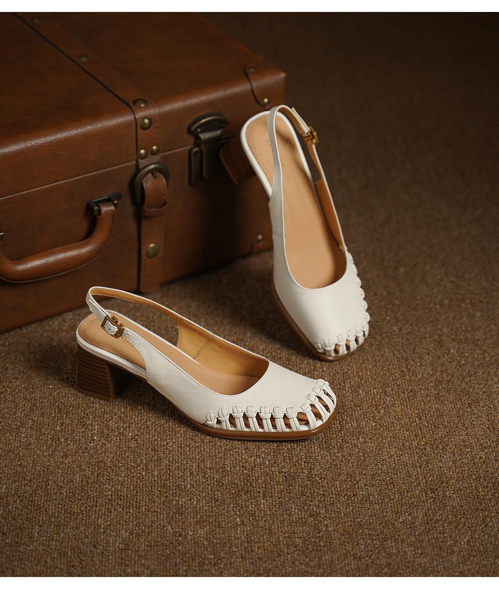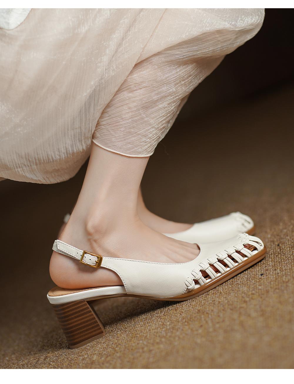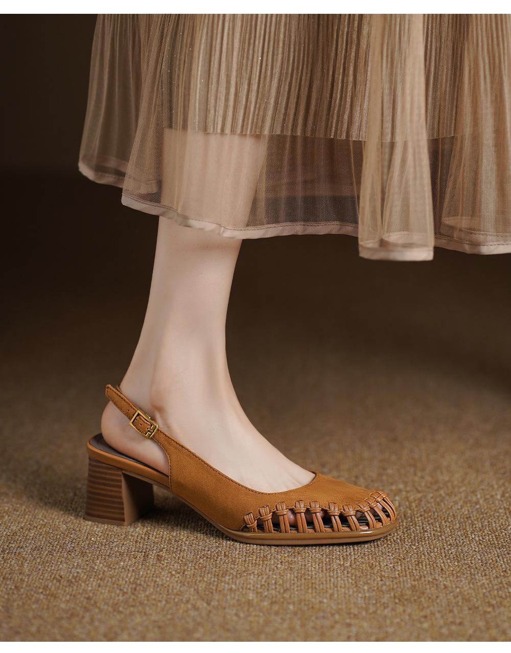 Sandalias Retro Trenzadas de Punta Francesa de Tacón Medio de 5 cm de Grosor de Piel de Vacuno de Primera Capa para Mujer 2025 Nuevas Sandalias Traseras Recortadas
