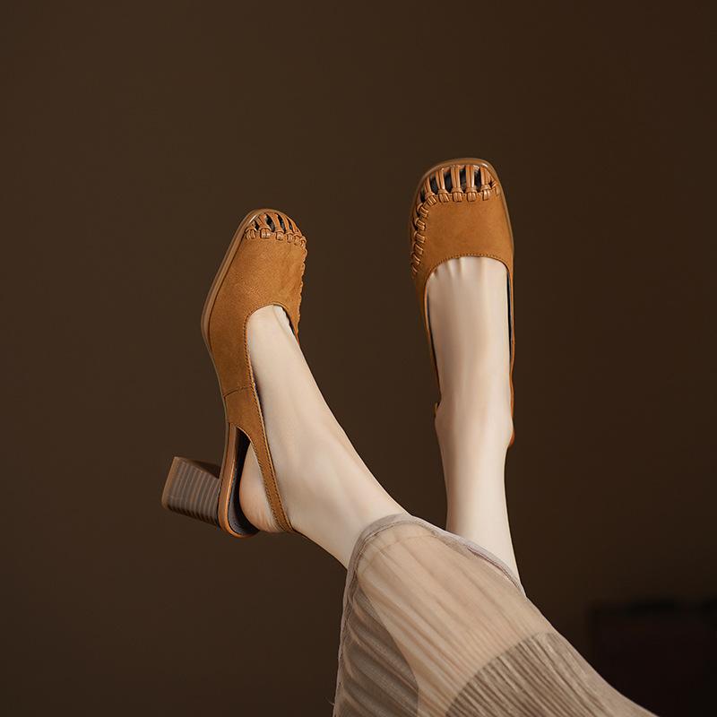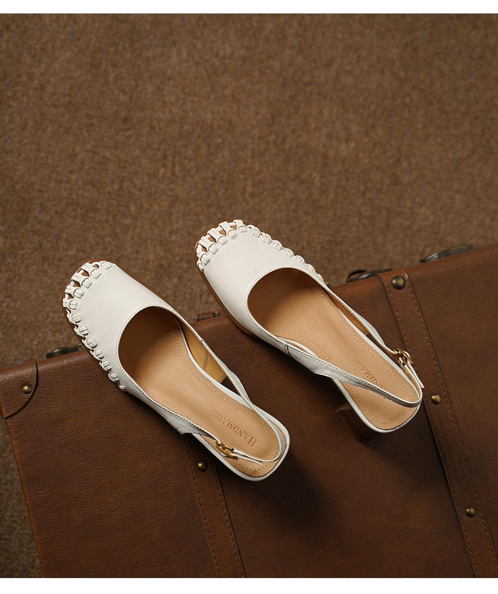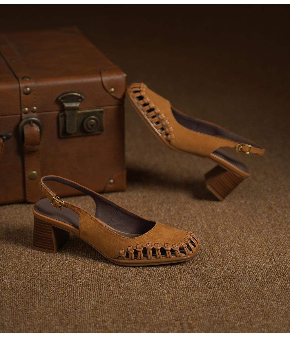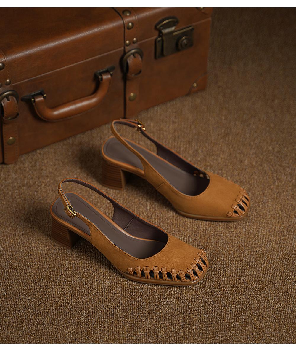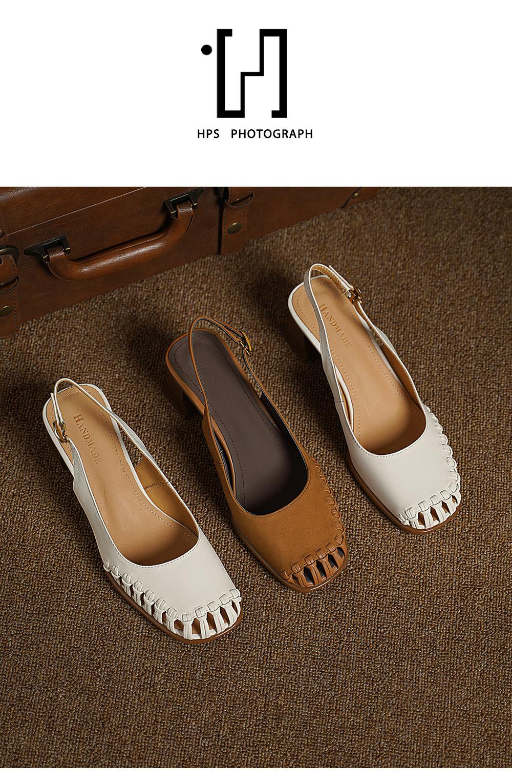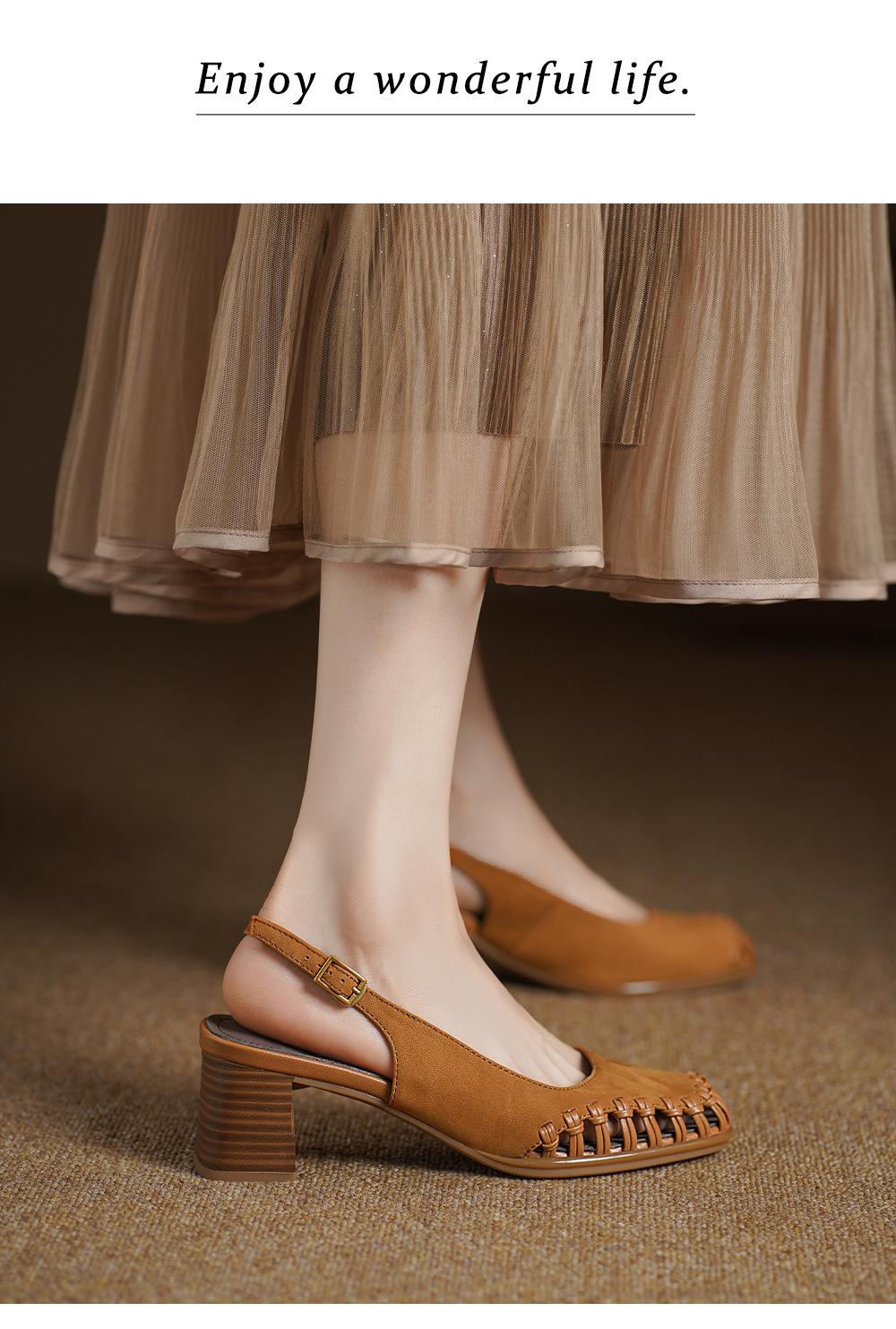 Sandalias Retro Trenzadas de Punta Francesa de Tacón Medio de 5 cm de Grosor de Piel de Vacuno de Primera Capa para Mujer 2025 Nuevas Sandalias Traseras Recortadas