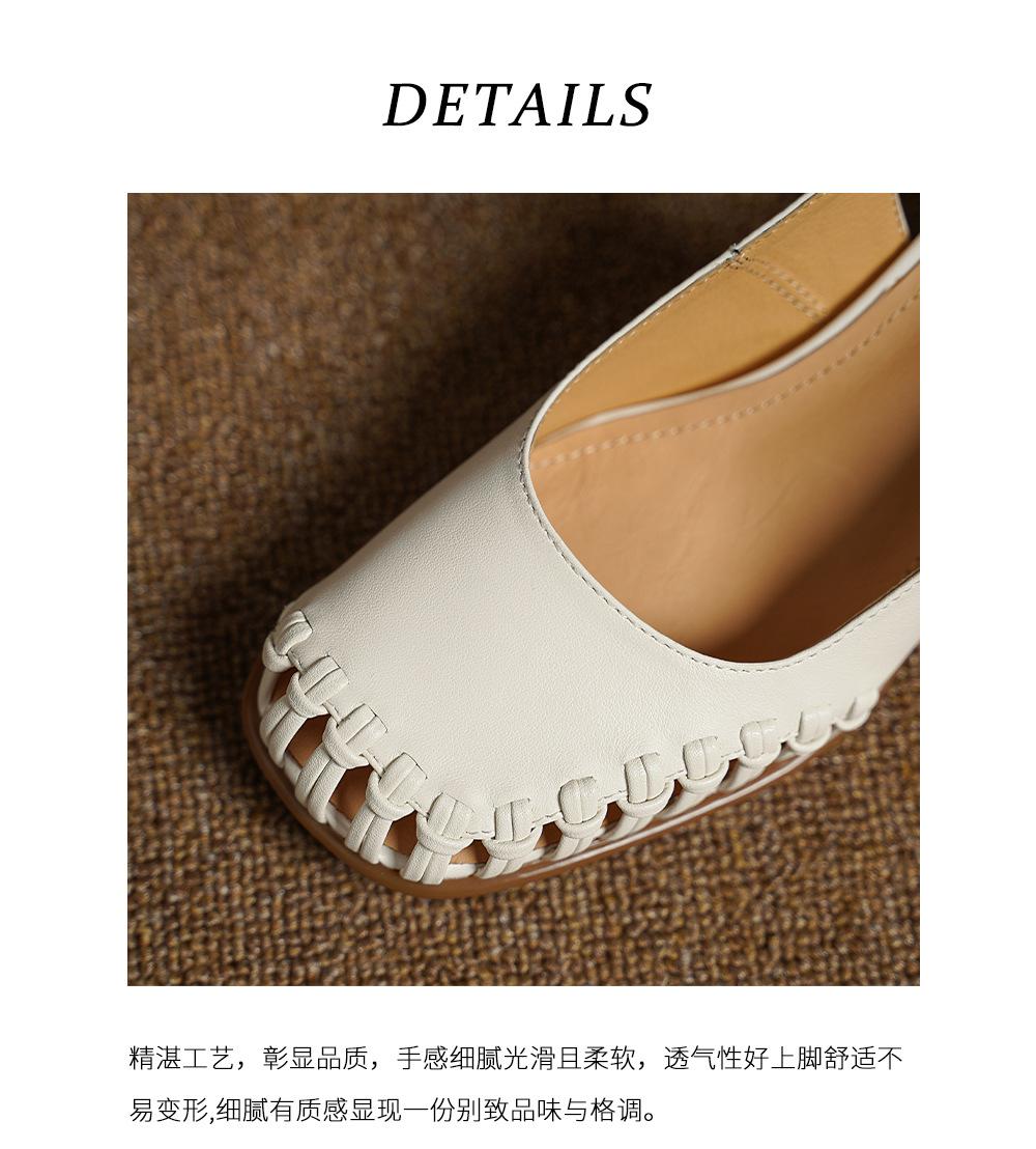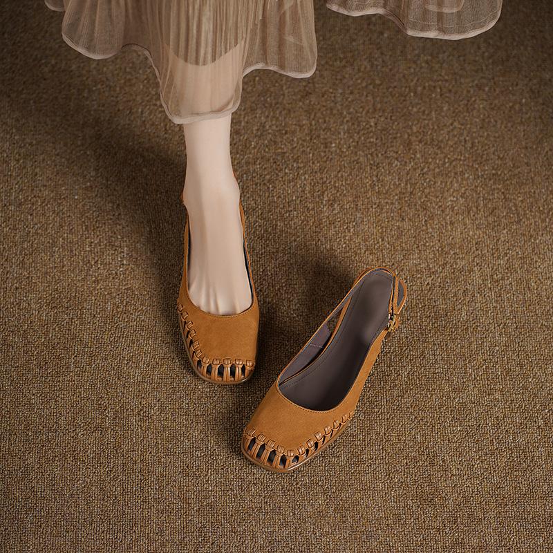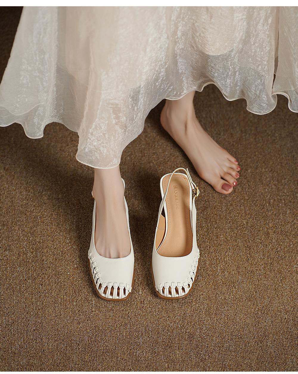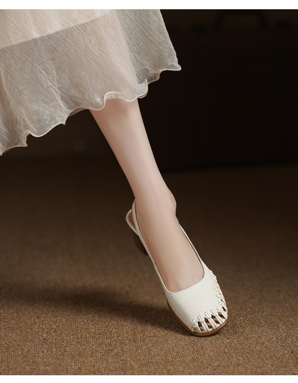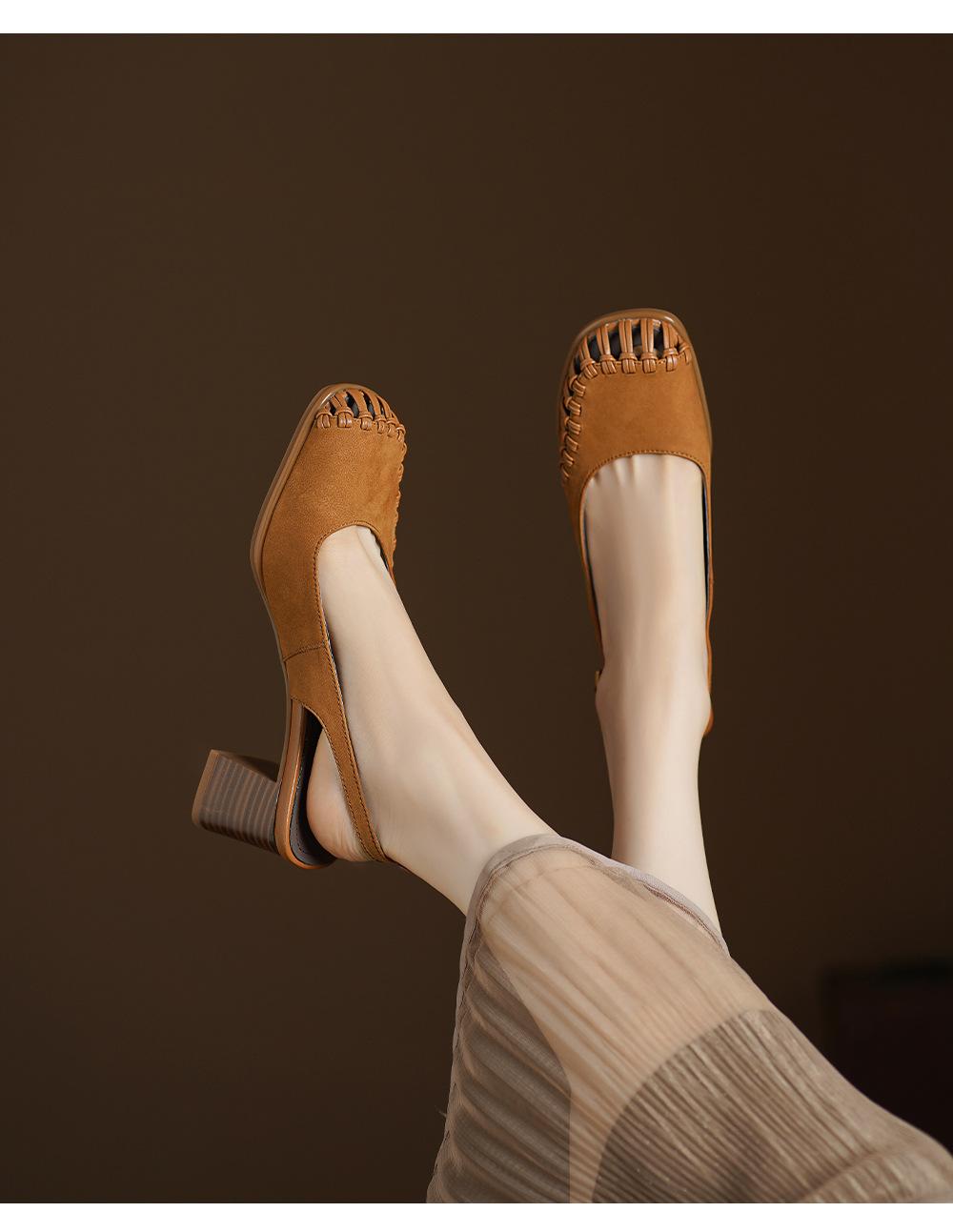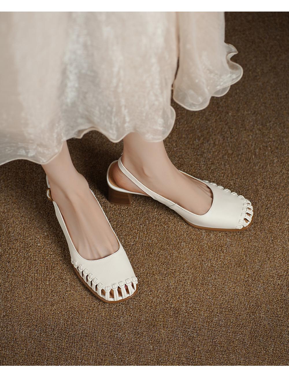 Sandalias Retro Trenzadas de Punta Francesa de Tacón Medio de 5 cm de Grosor de Piel de Vacuno de Primera Capa para Mujer 2025 Nuevas Sandalias Traseras Recortadas