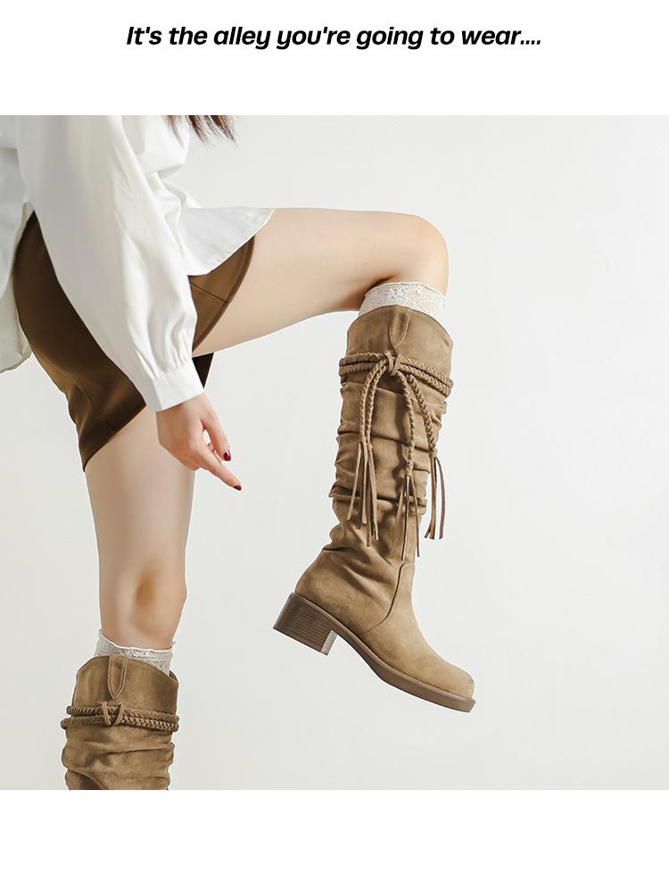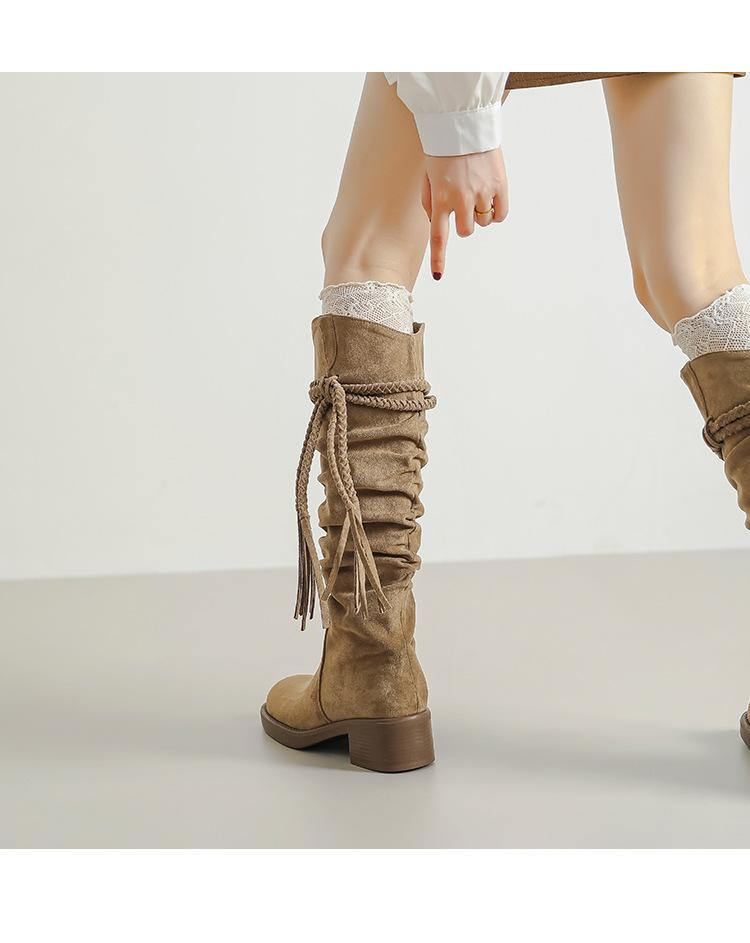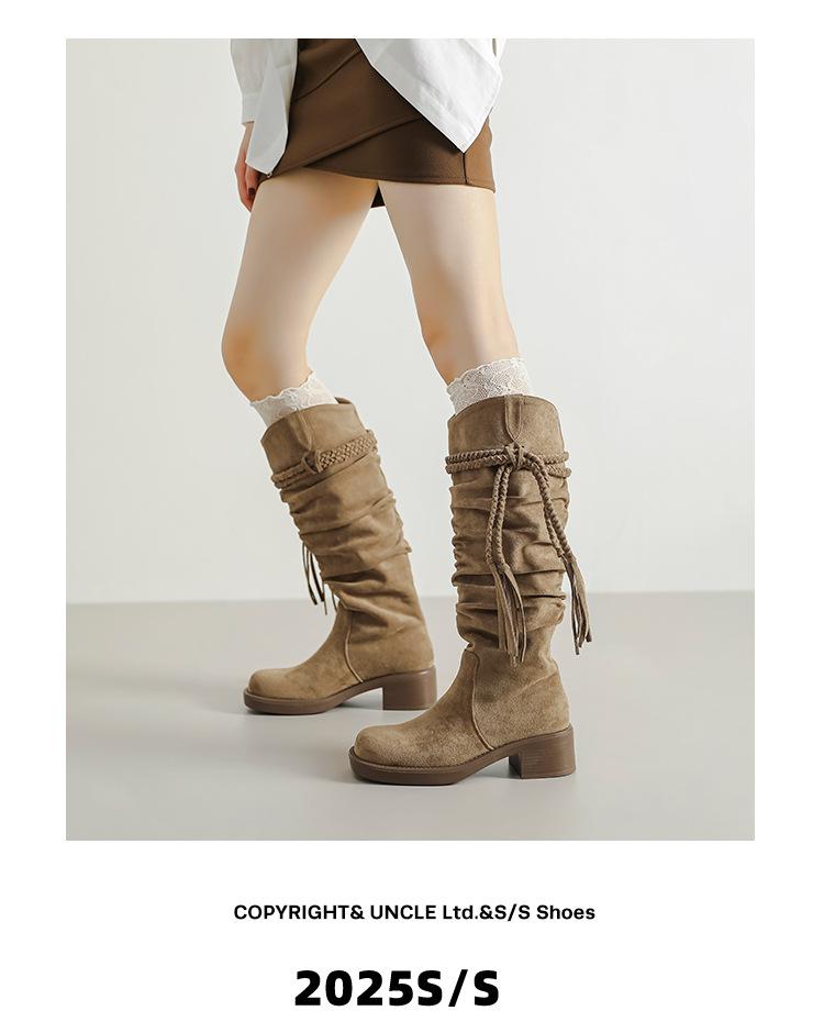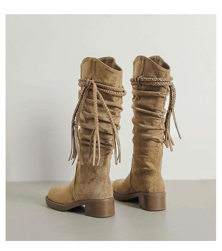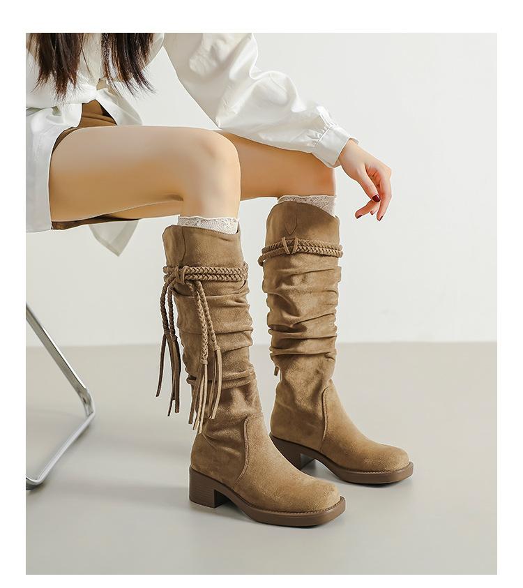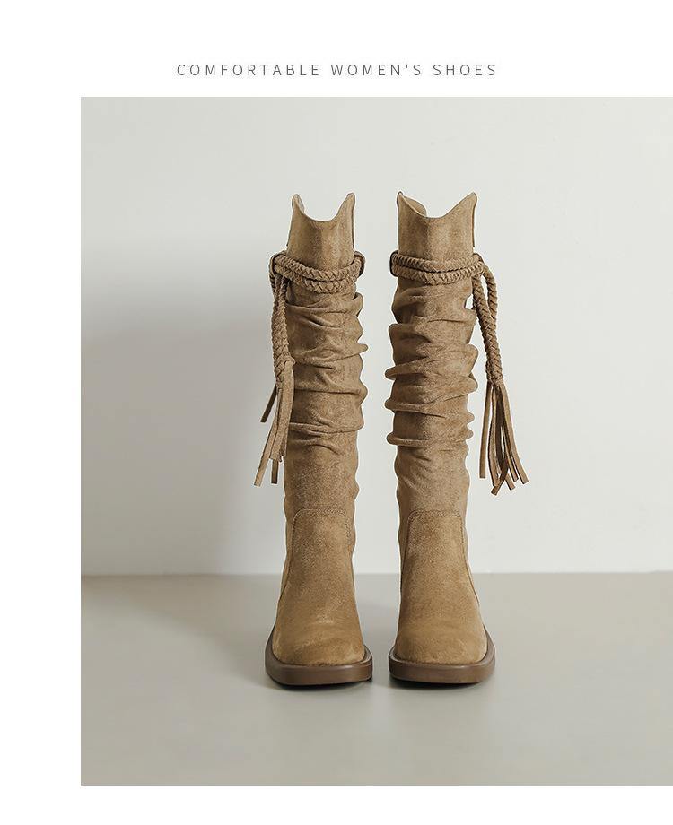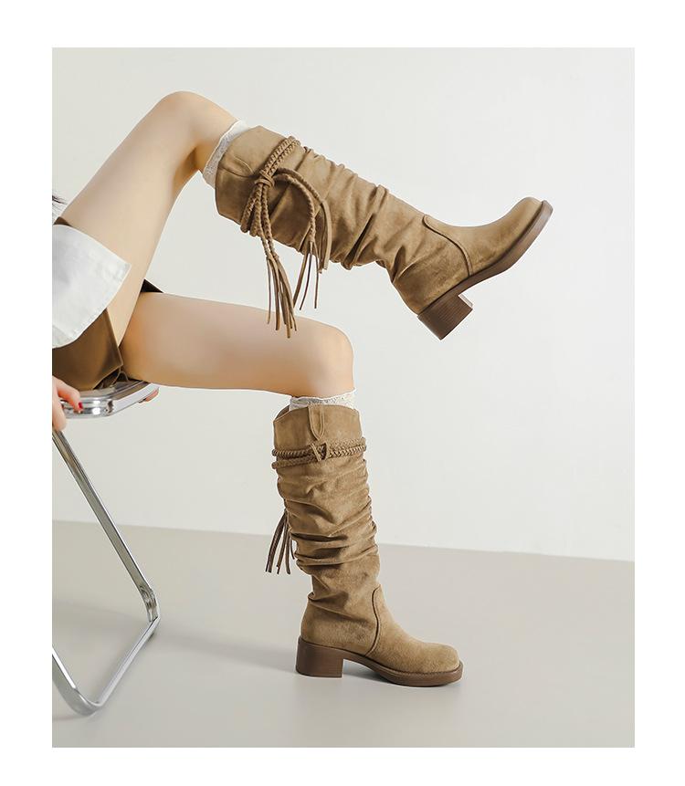 Botas Largas de Mujer Vintage Borla Tejido Estilo Páramo Botas de Caballero 2025 Otoño e Invierno Nuevas Tacón Grueso Fruncidas Ajustadas Hasta la Rodilla