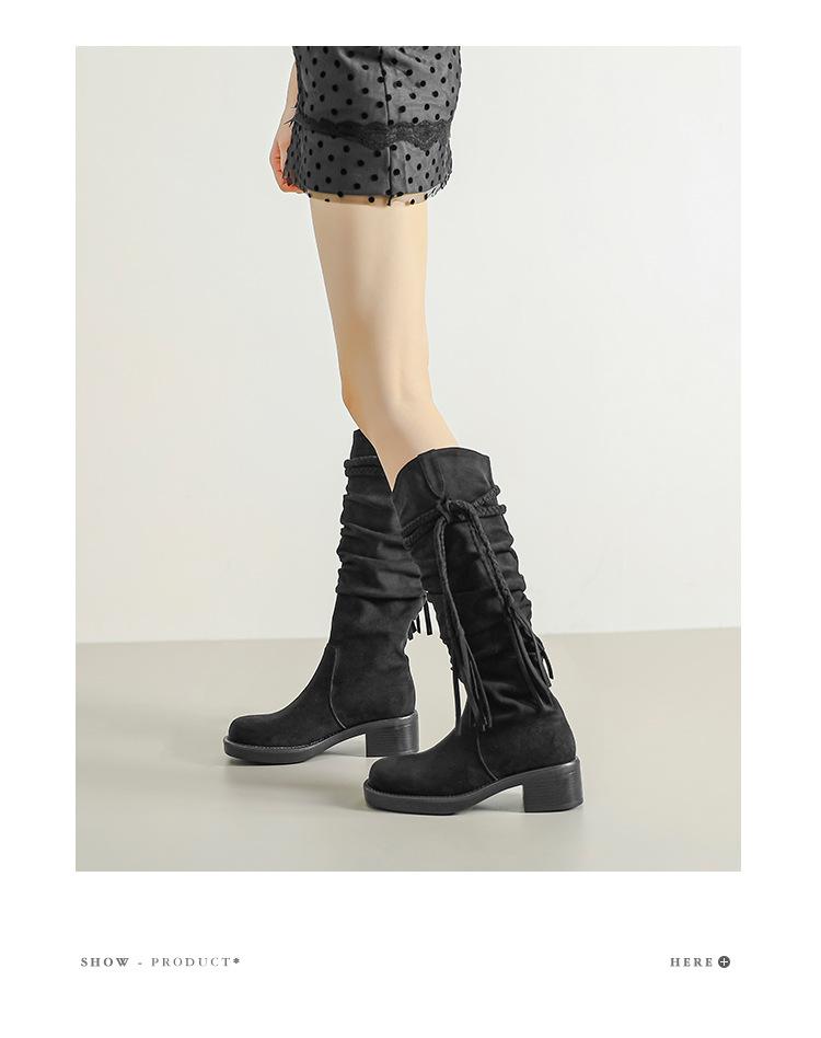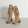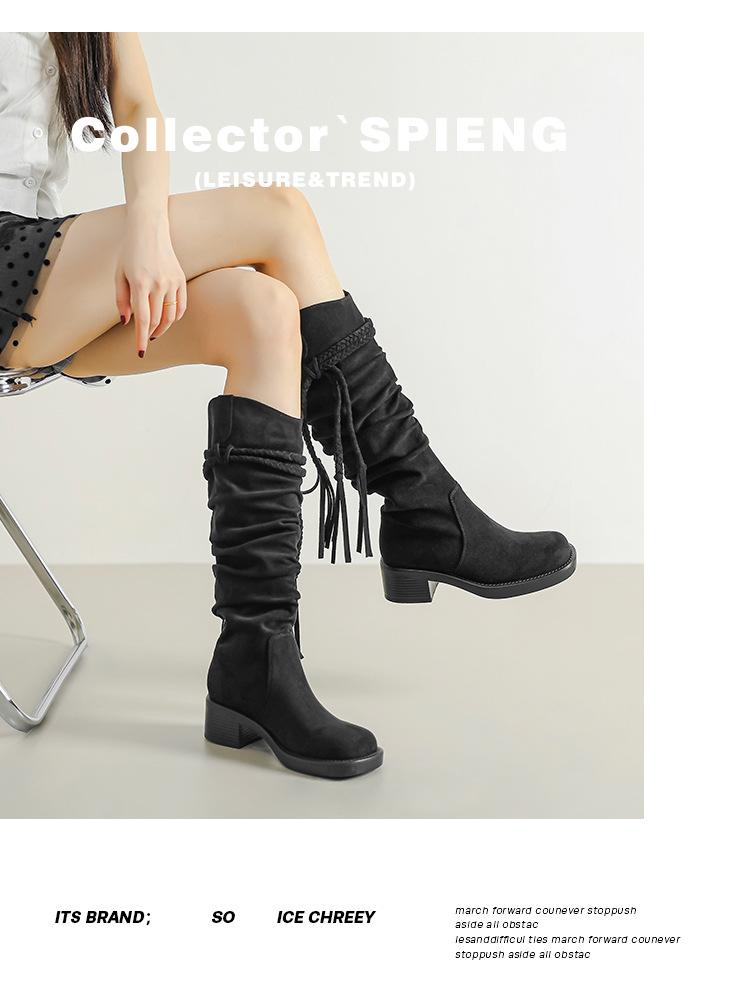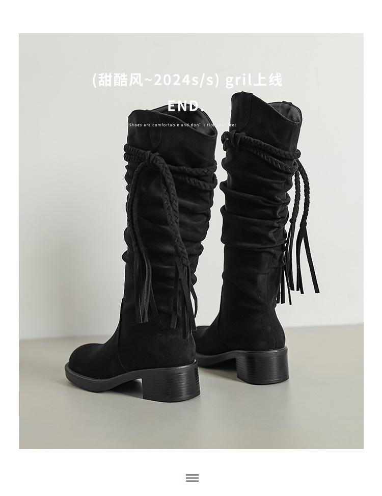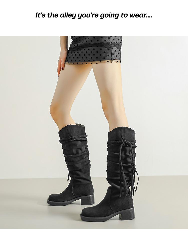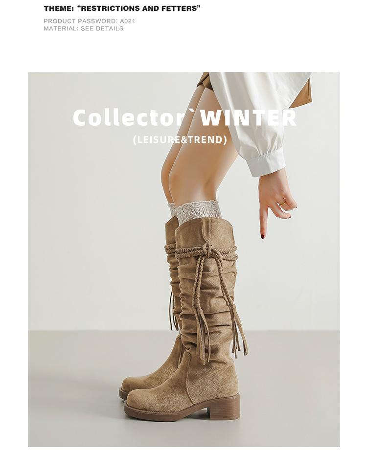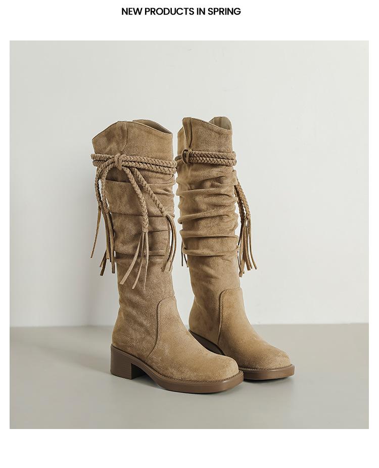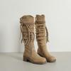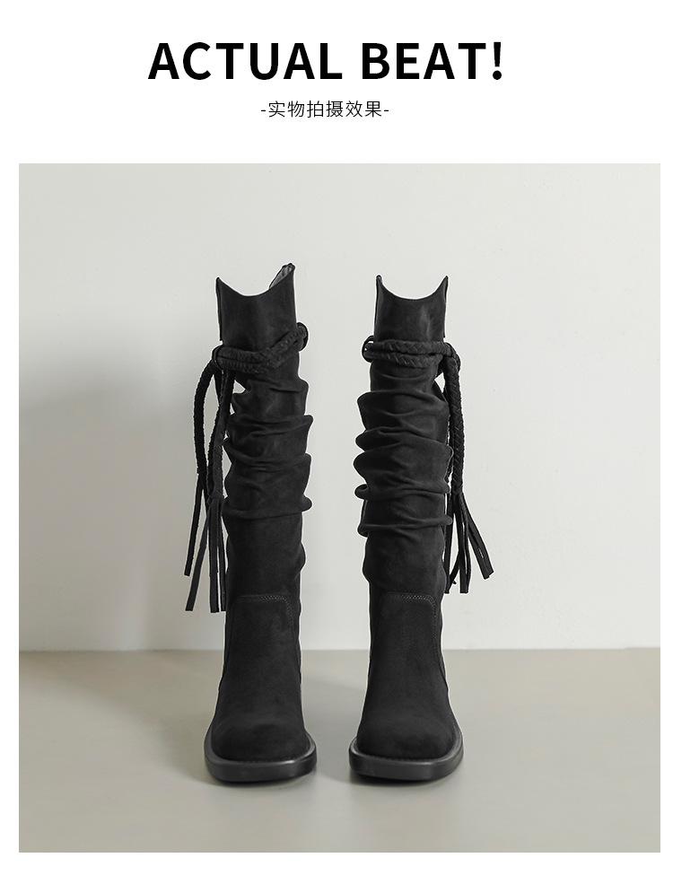 Botas Largas de Mujer Vintage Borla Tejido Estilo Páramo Botas de Caballero 2025 Otoño e Invierno Nuevas Tacón Grueso Fruncidas Ajustadas Hasta la Rodilla