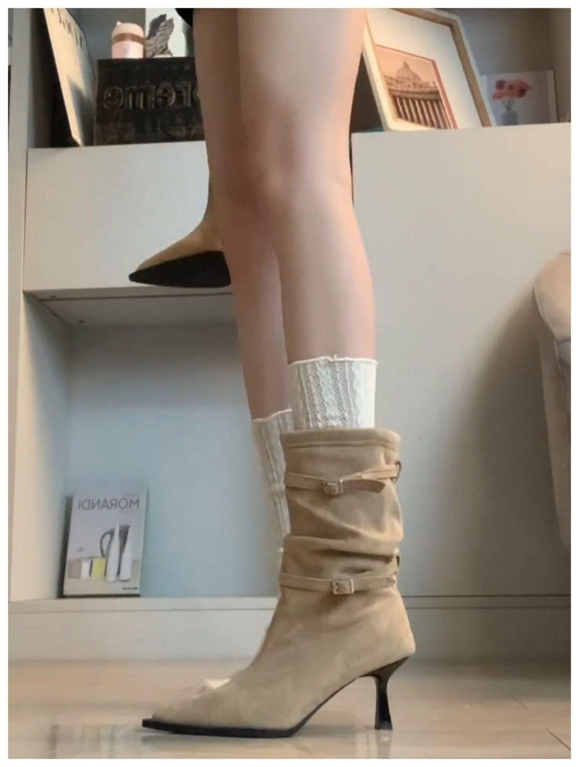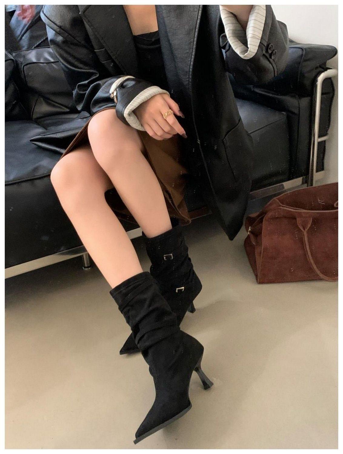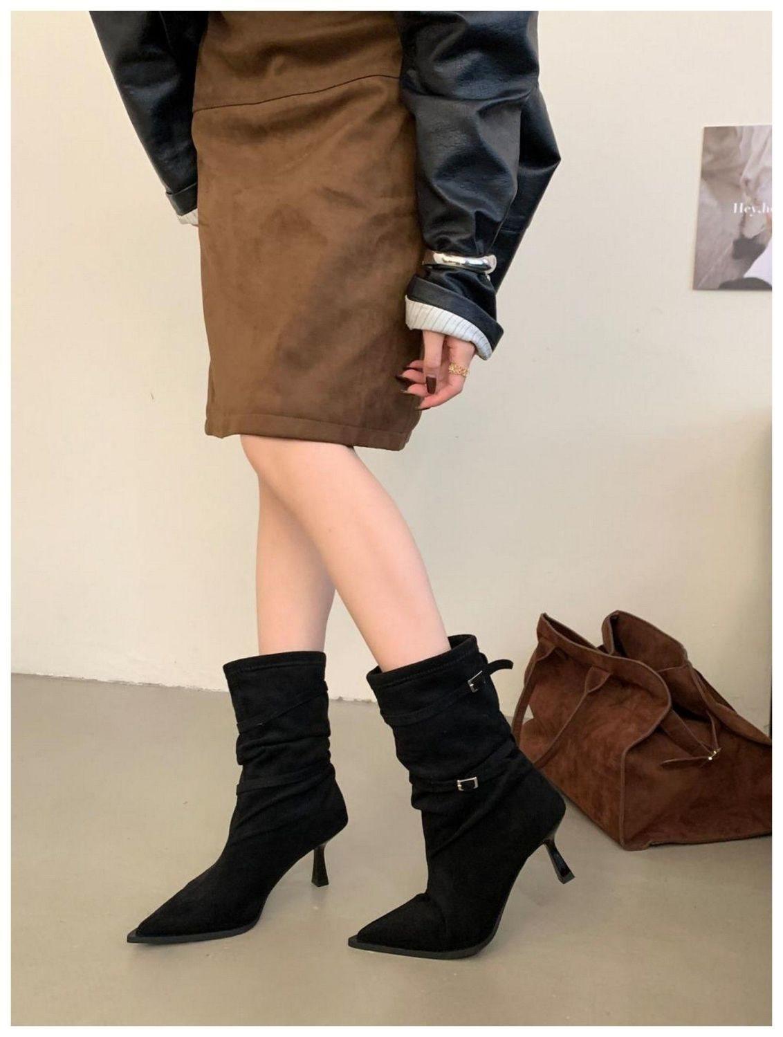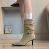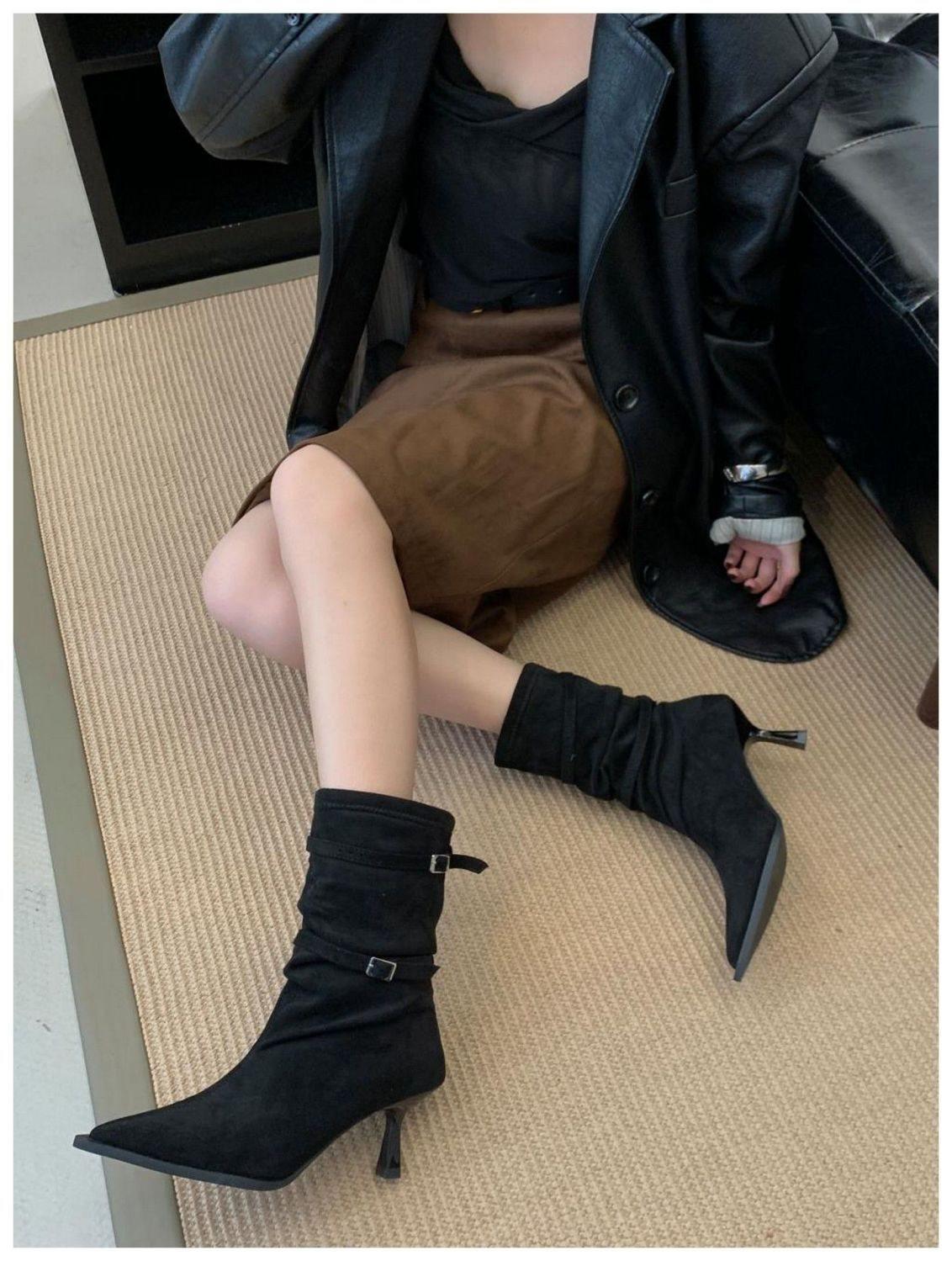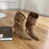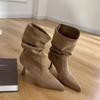 Botas de media caña tacón de aguja versátiles botas vaqueras occidentales mujer 2025 nuevas botas cortas moda hebilla gamuza arrugadas slouch boots